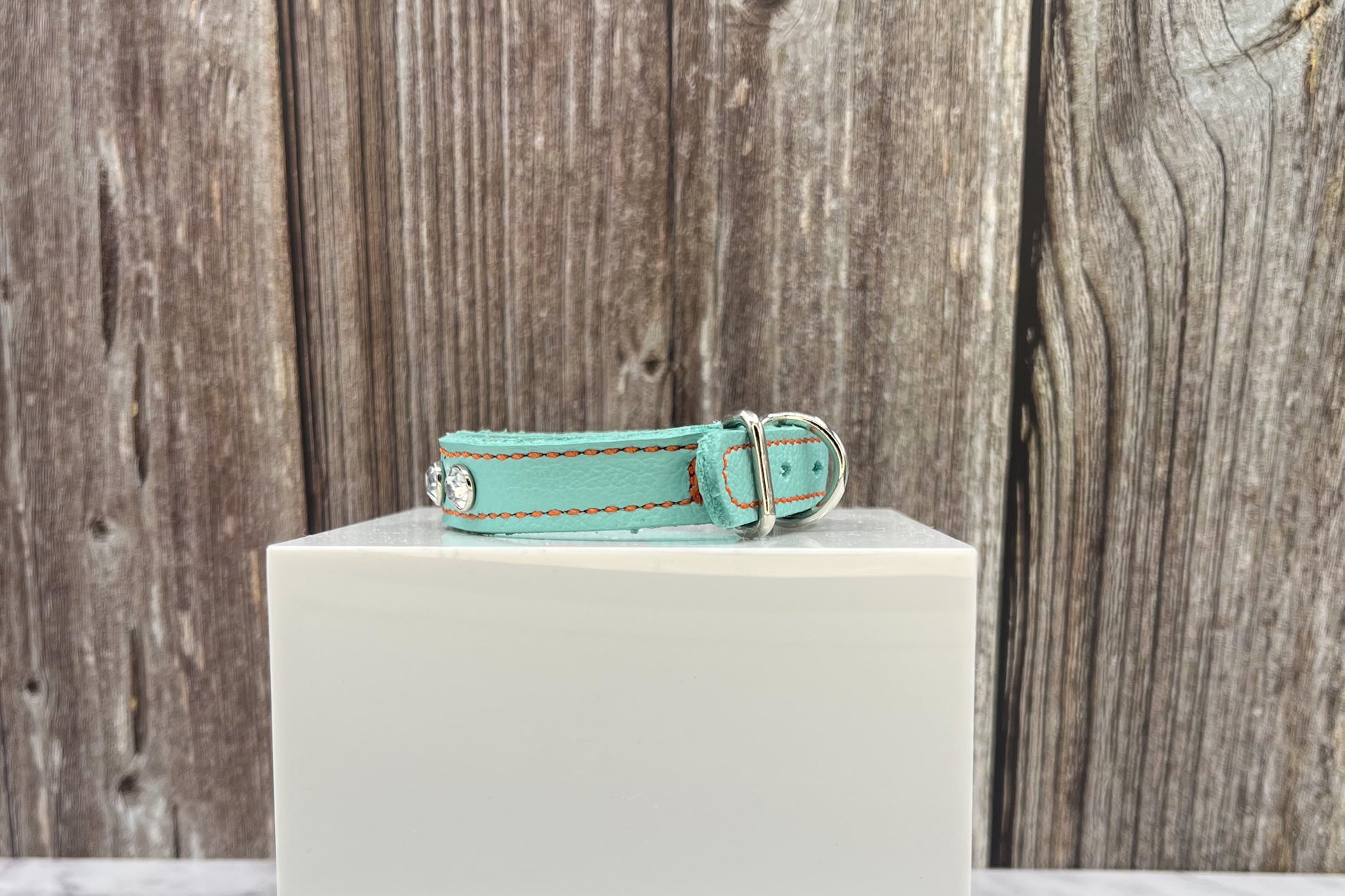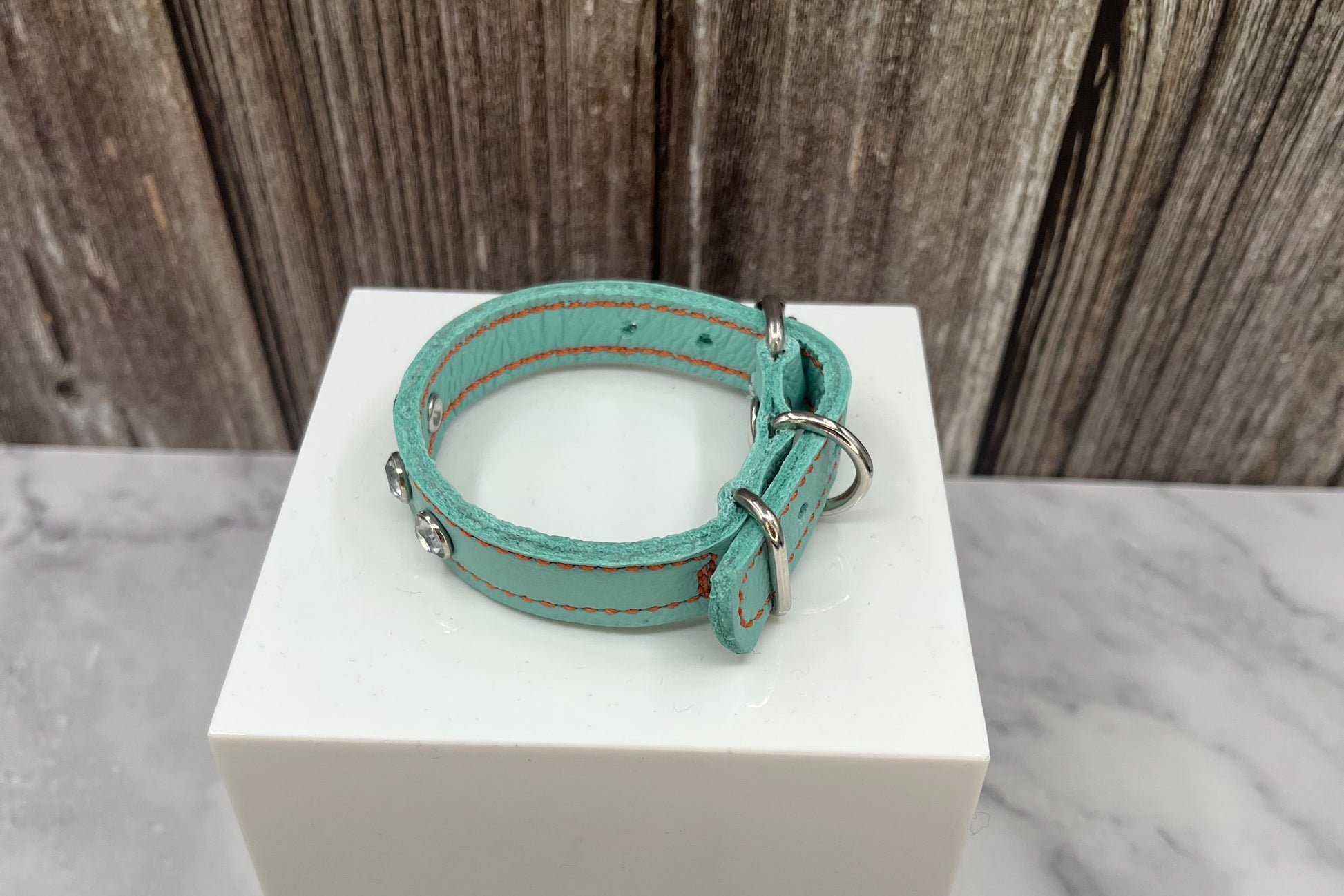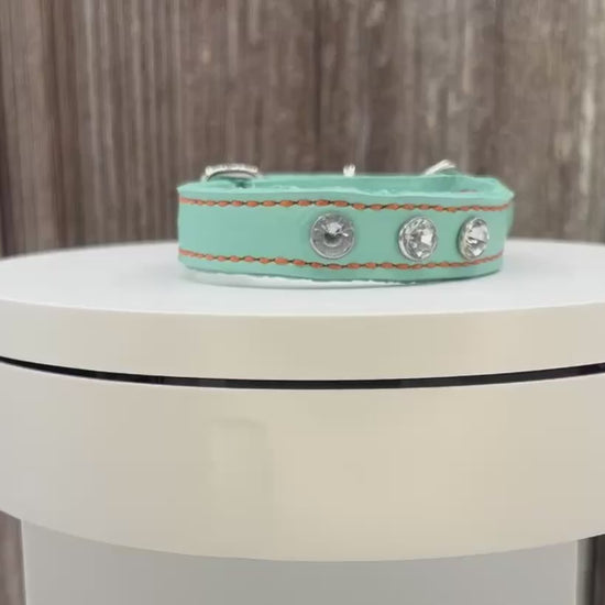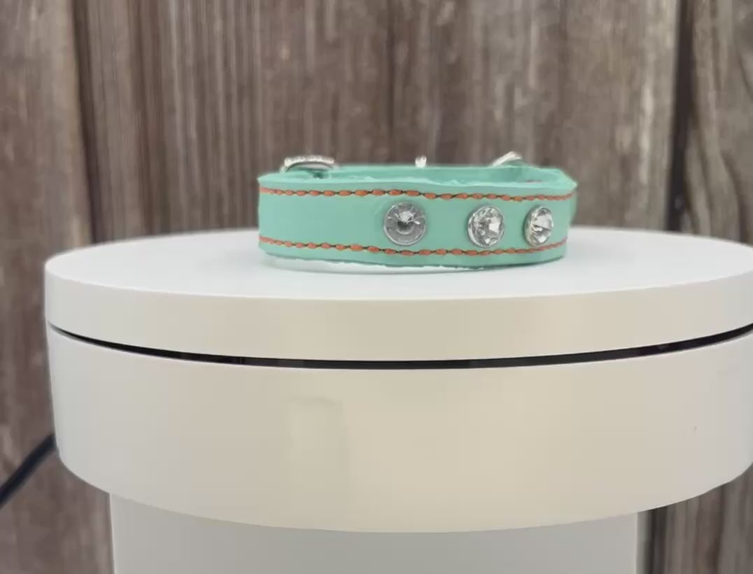 Aqua Green Leather Collar with Clear gem rivets,