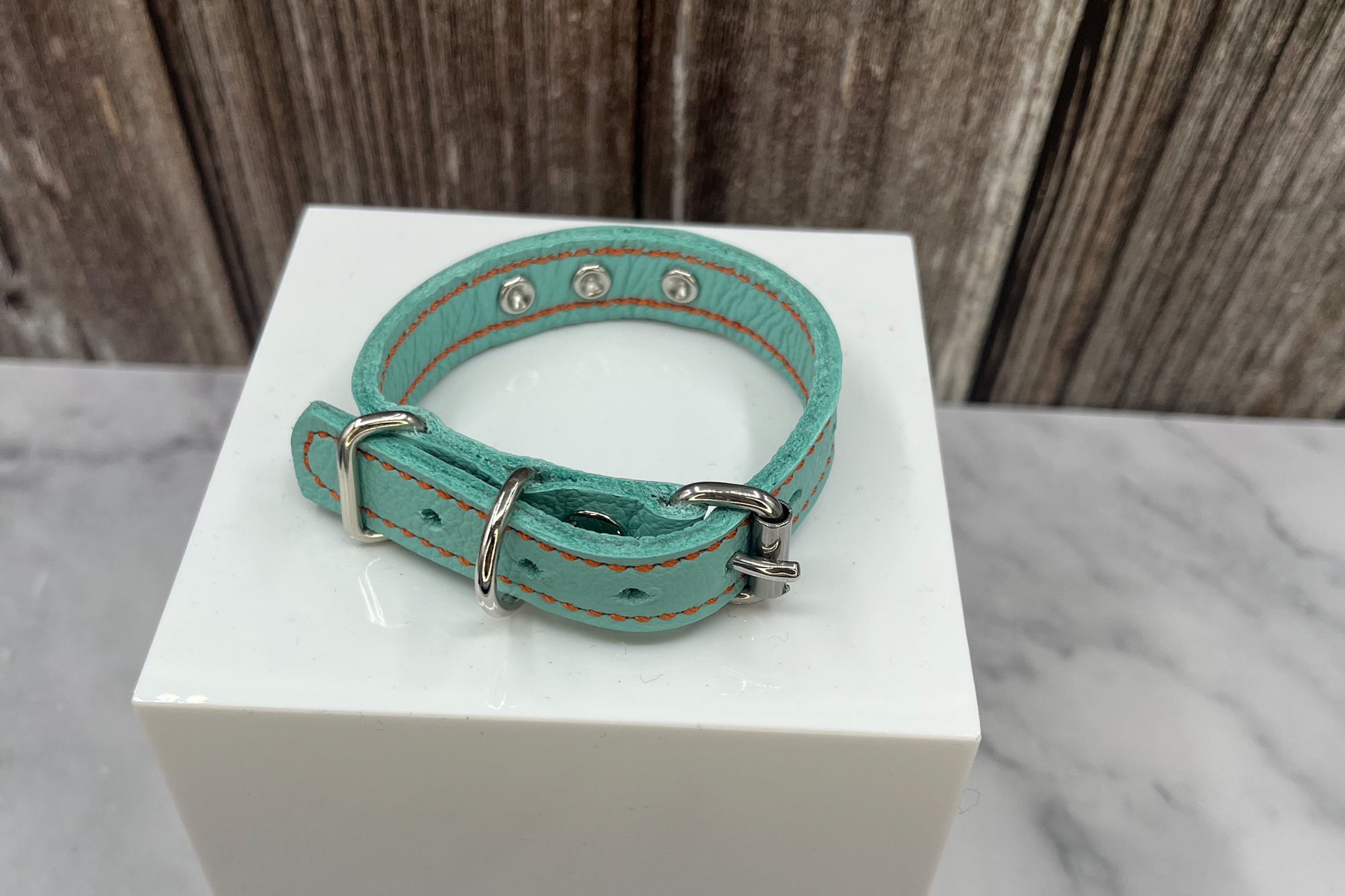 This collar is all handmade and stitched with Orange bonded nylon thread, the leather is biker leather so is really soft and super durable,