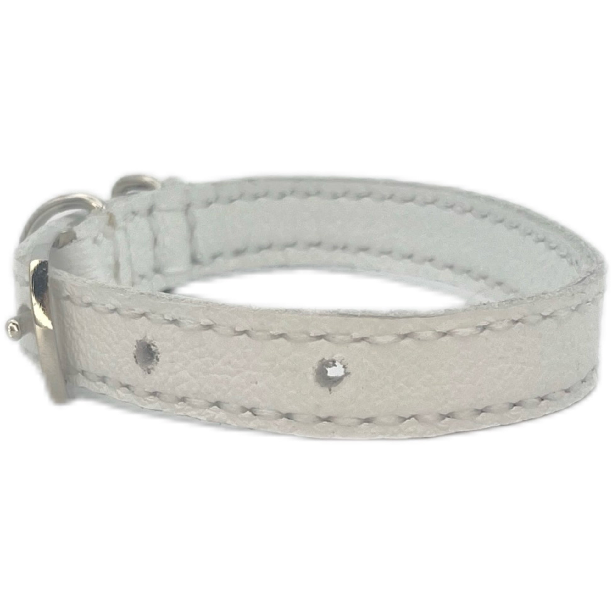 This collar is made using super Soft Leather and is all hand stitched, it is made to fit neck size 7.5-10.5 inches and is 14mm wide, and has a silver buckle, D ring and loop,