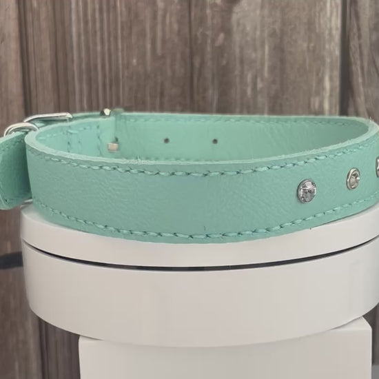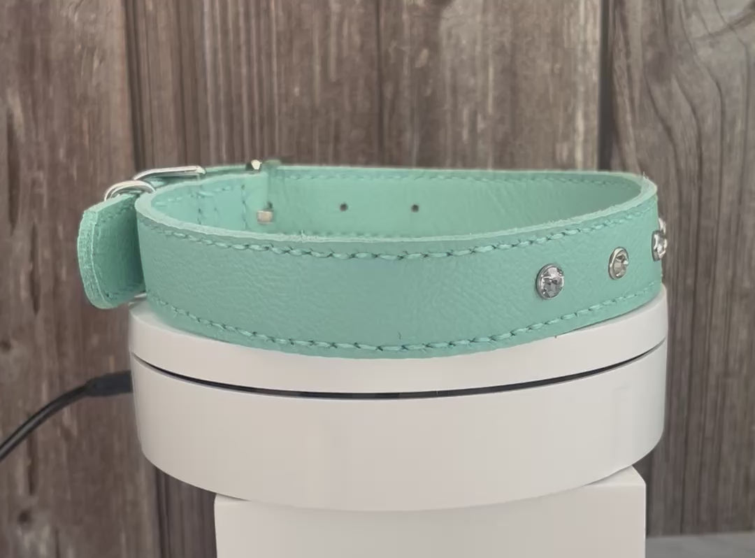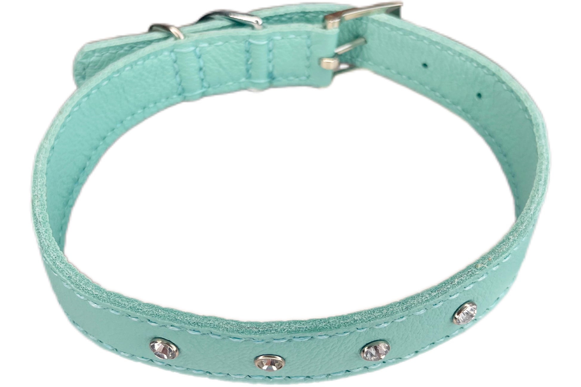 This Aqua Green leather collar is handmade and hand stitched in Green waxed thread, It has 4 Clear Diamante Rivets