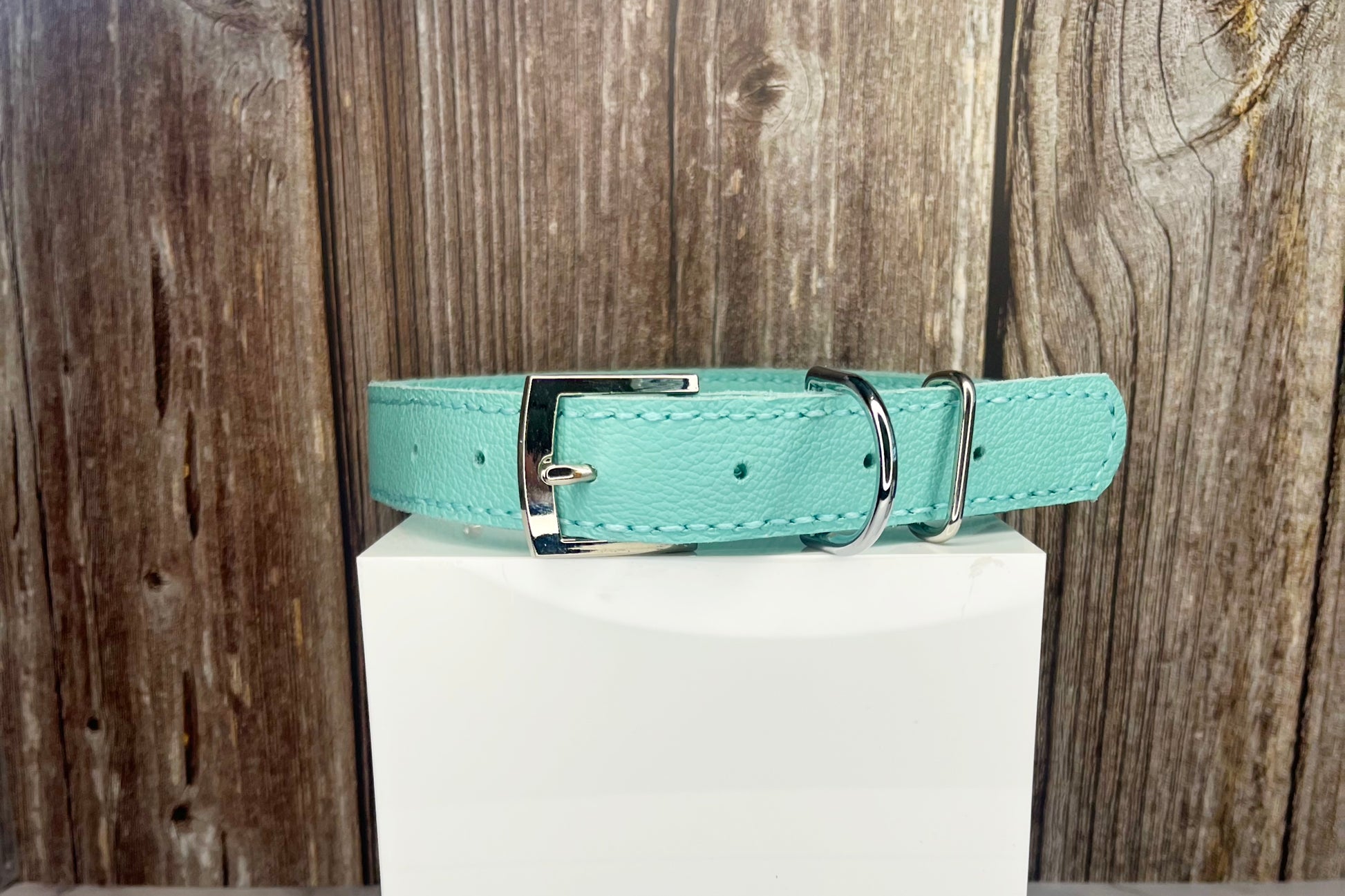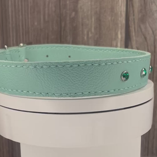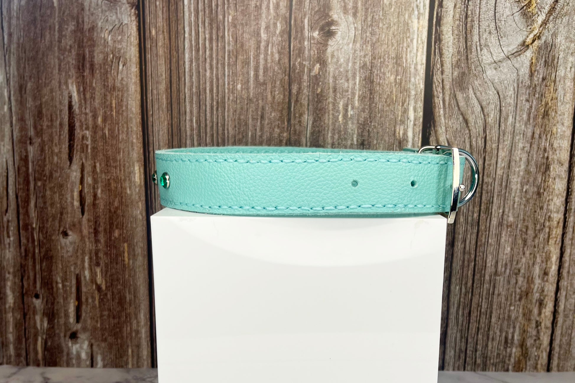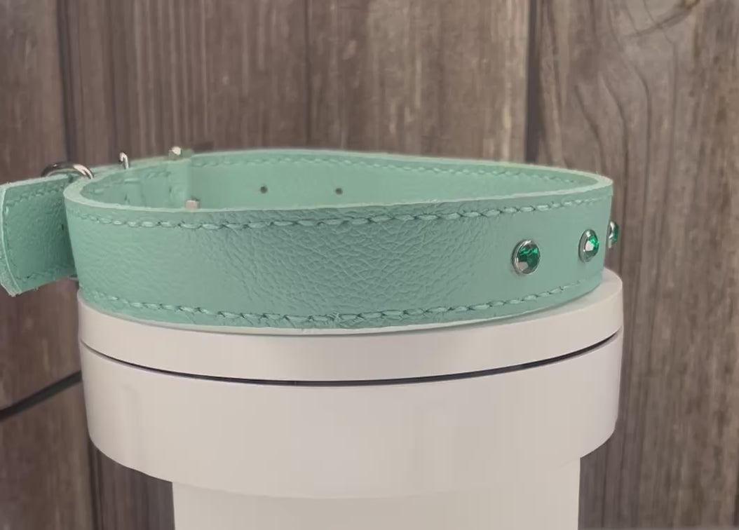 This Aqua Green leather collar is handmade and hand stitched in Green waxed thread, It has 4 Jade Green Diamante Rivets