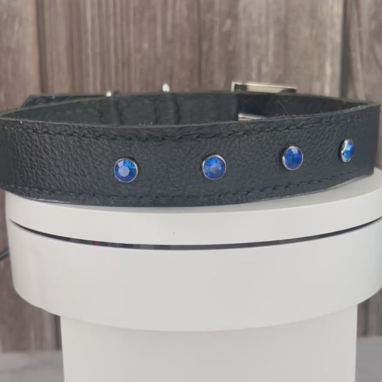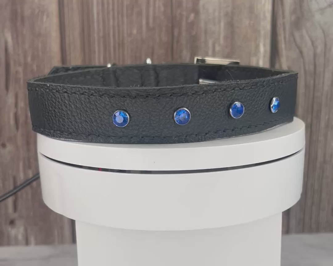 This Black leather collar is handmade and hand stitched in Black waxed thread, It has 4 Royal Blue Diamante Rivets