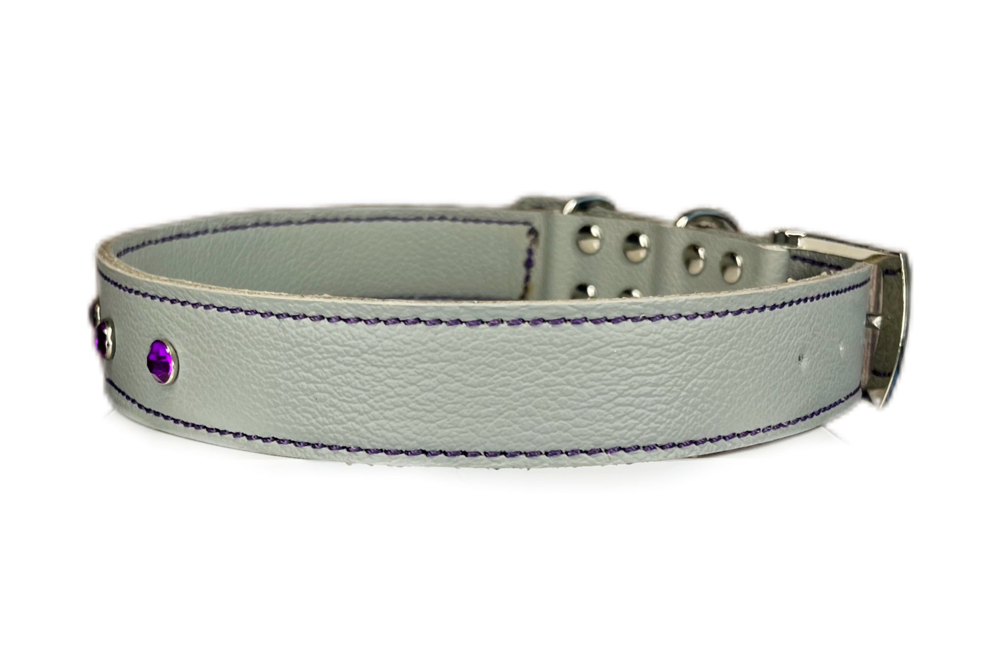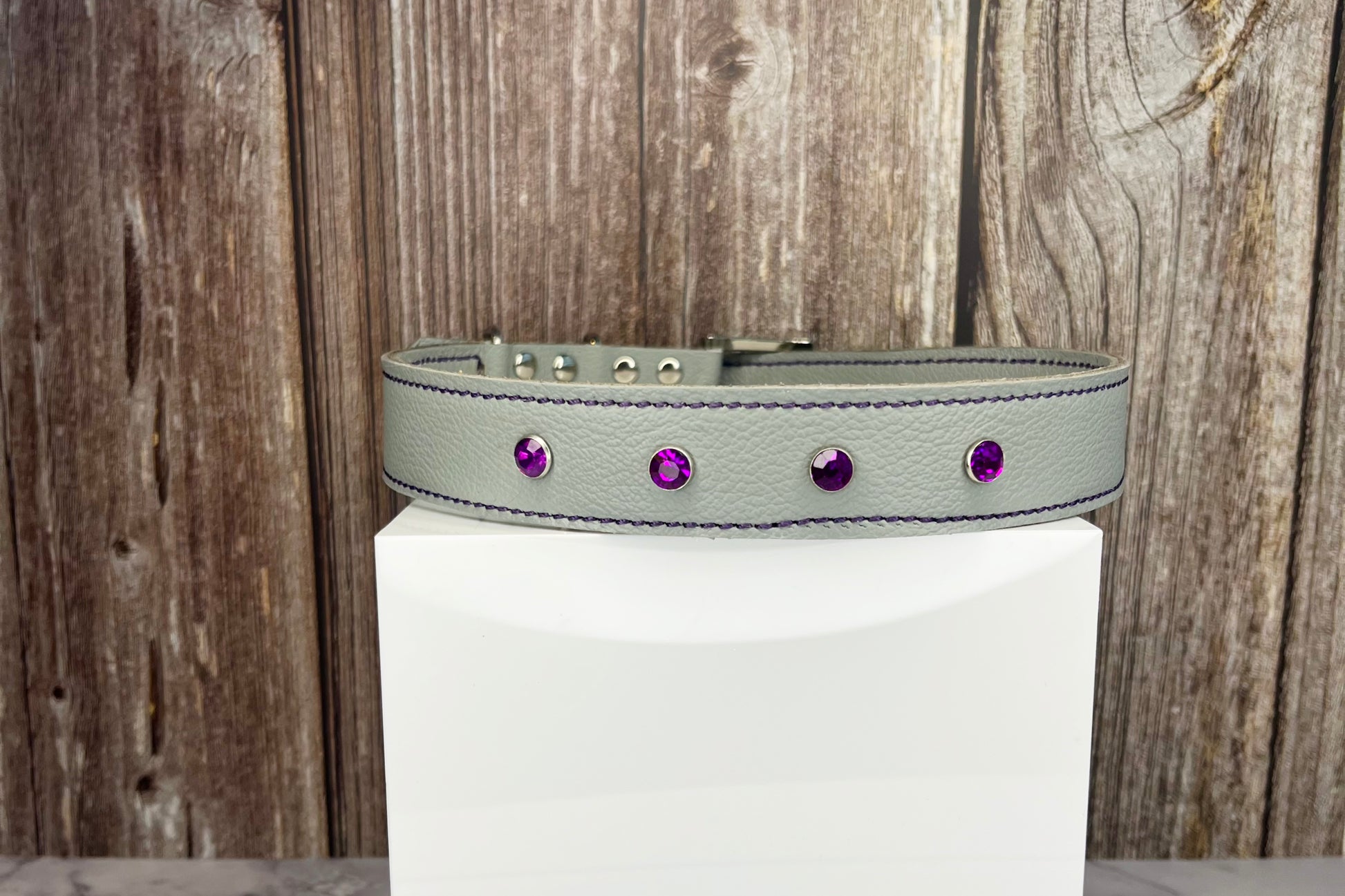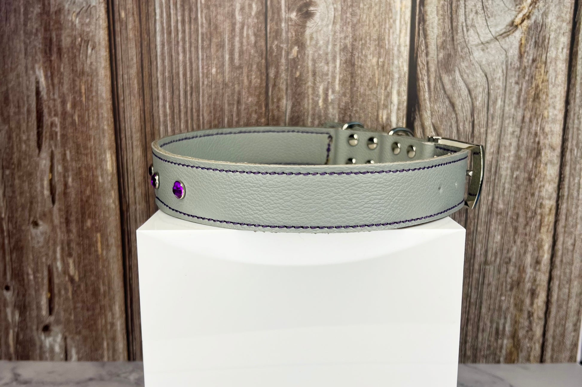 This Grey leather collar is handmade and stitched in Purple bonded nylon thread, It has 4 violet Diamante Rivets