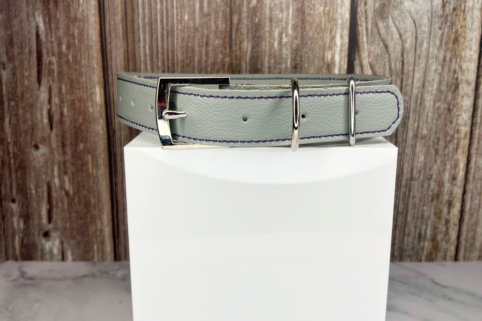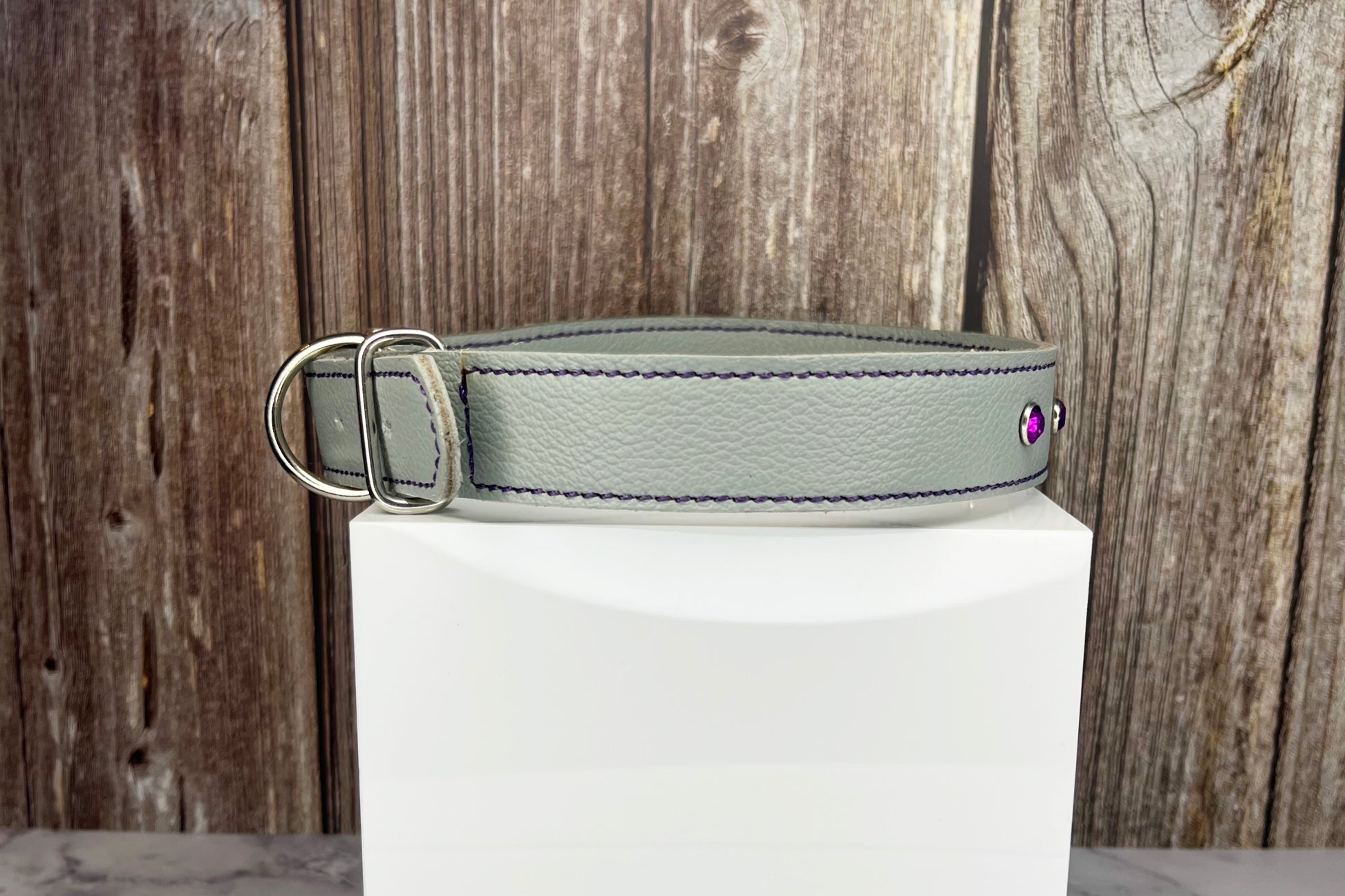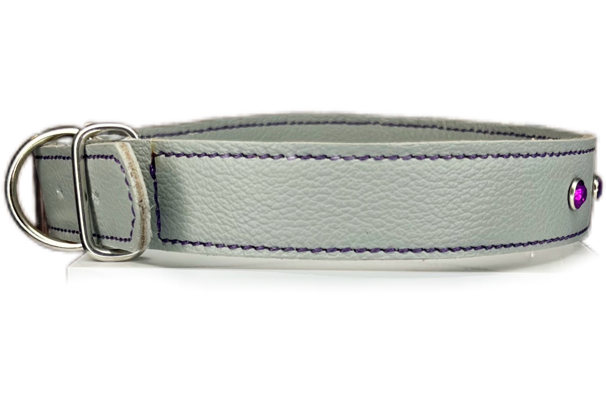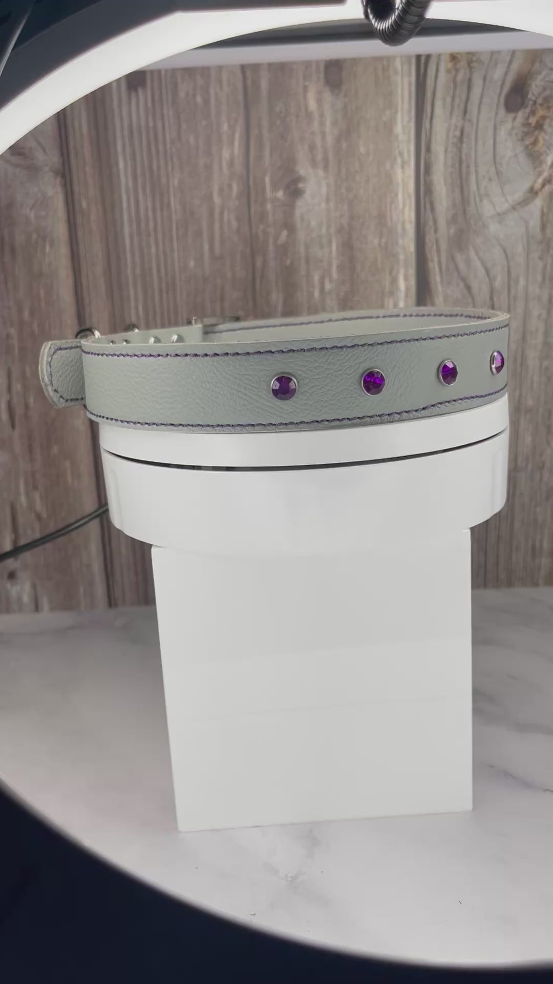 This Grey leather collar is handmade and stitched in Purple bonded nylon thread, It has 4 violet Diamante Rivets