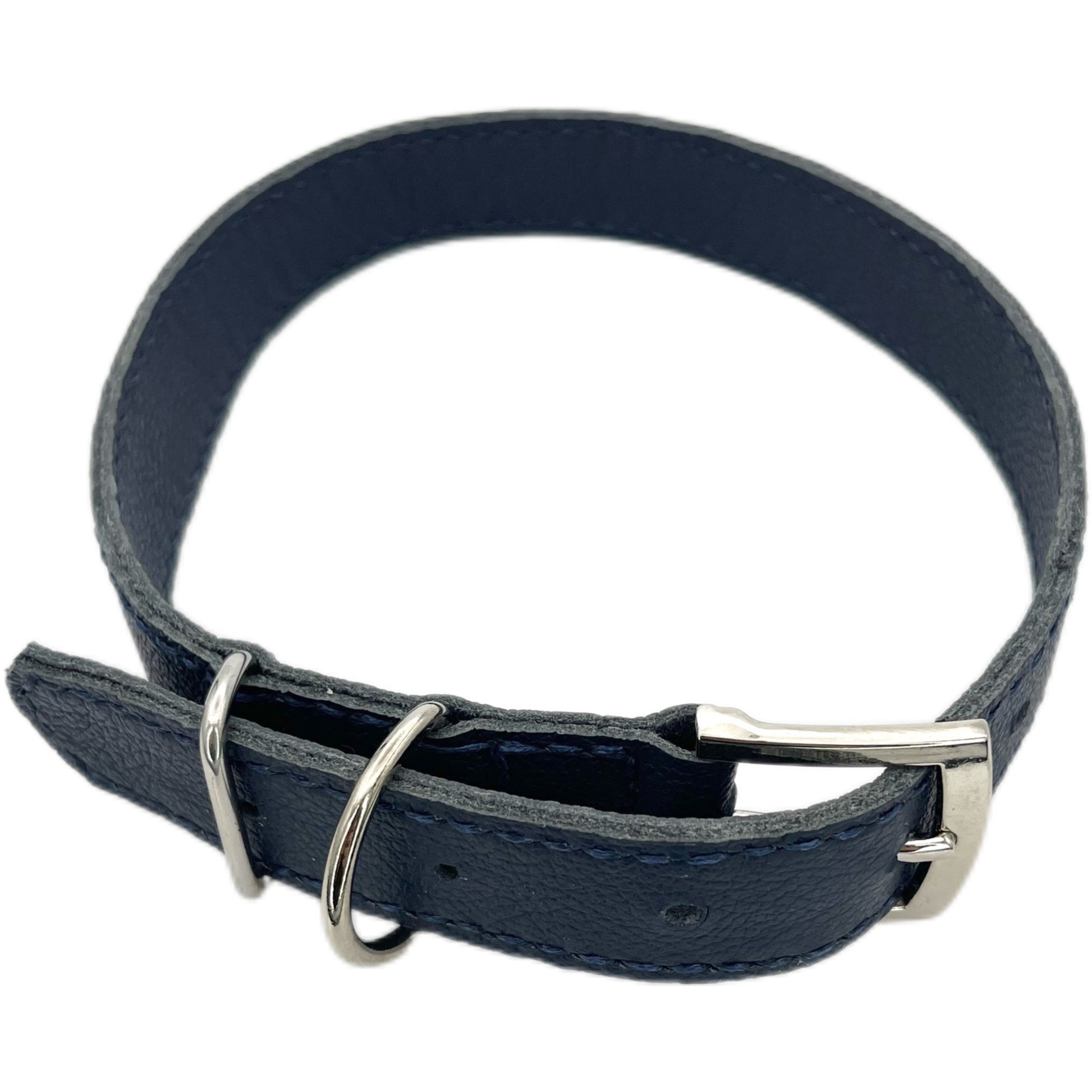 This collar is made using super Soft Leather and is all hand stitched, it is made to fit neck size 16-19 inches and is 25mm wide, and has a silver buckle, D ring and loop,