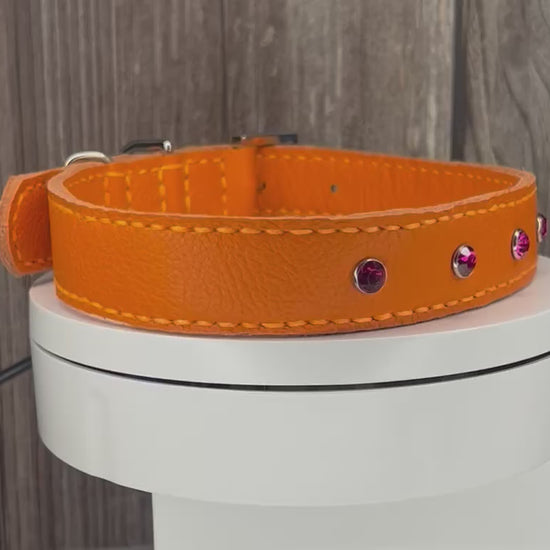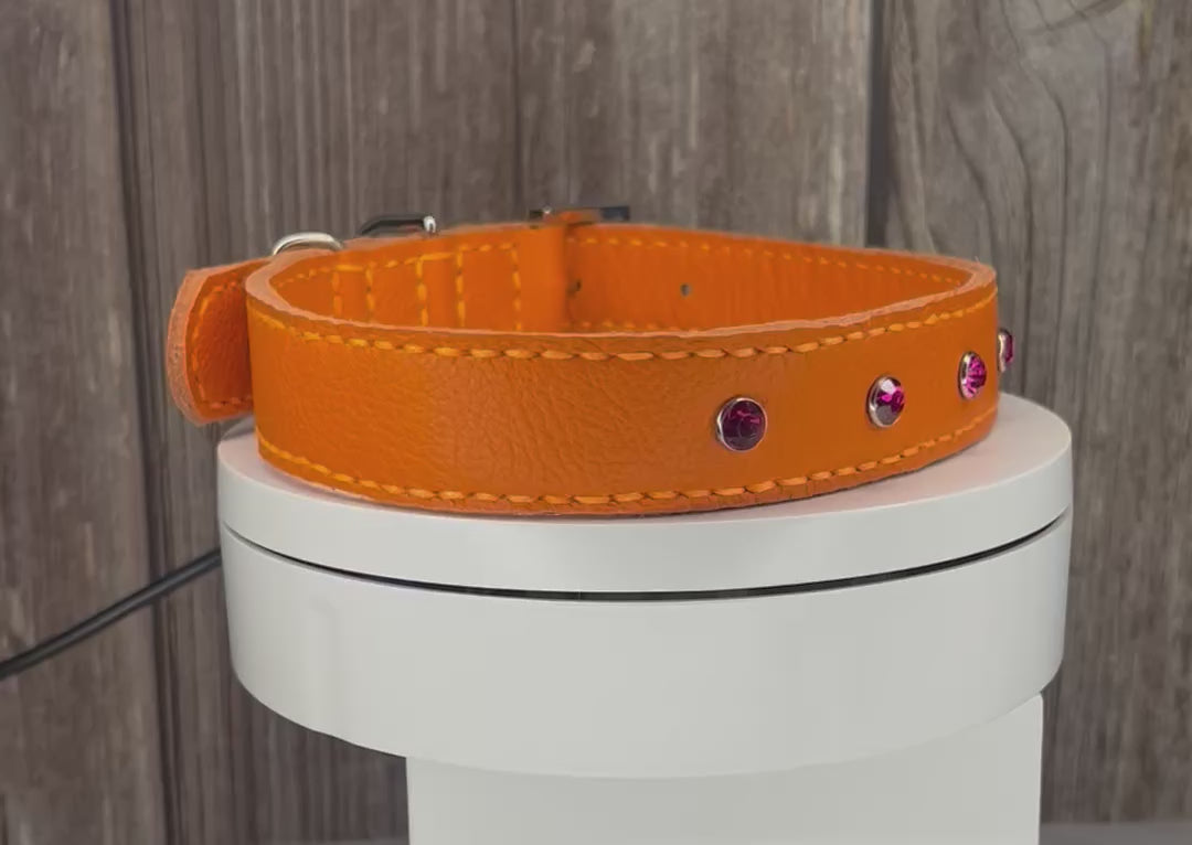 This Orange leather collar is handmade and hand stitched in Orange waxed thread, It has 4 Hot Pink Diamante Rivets
