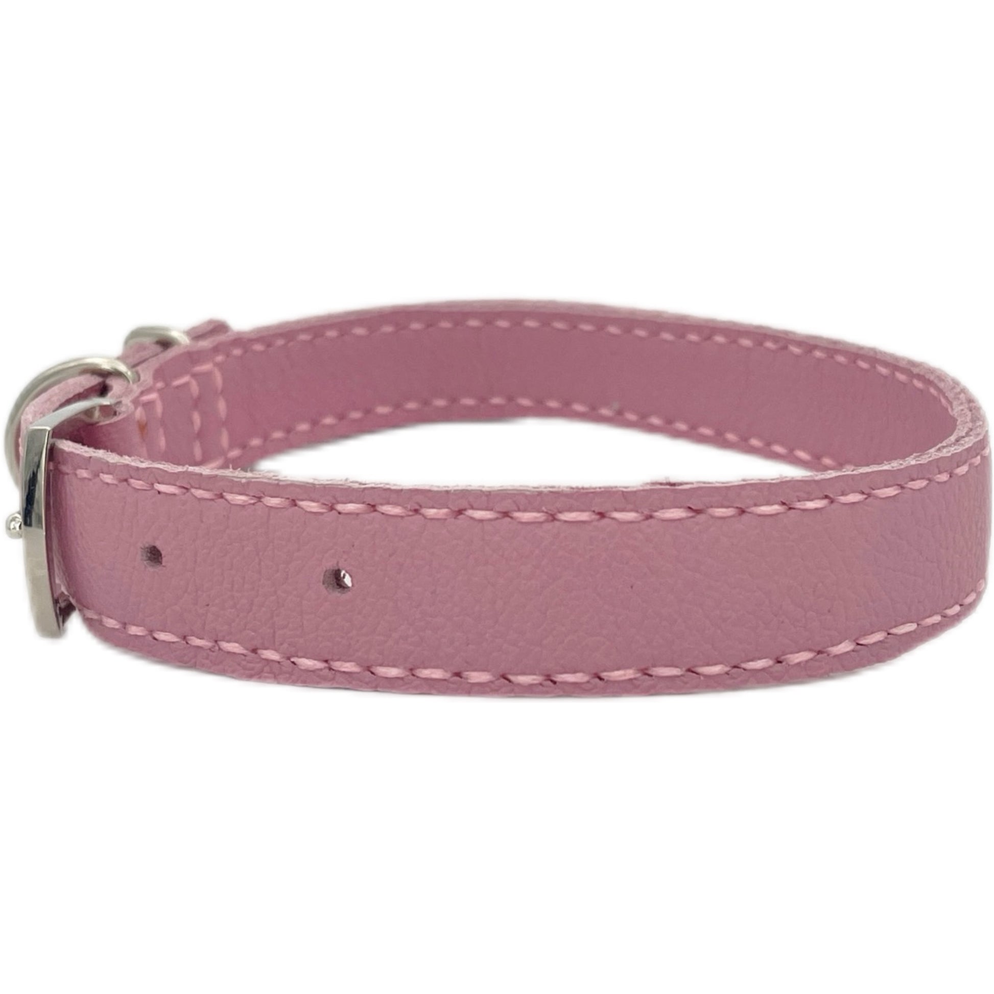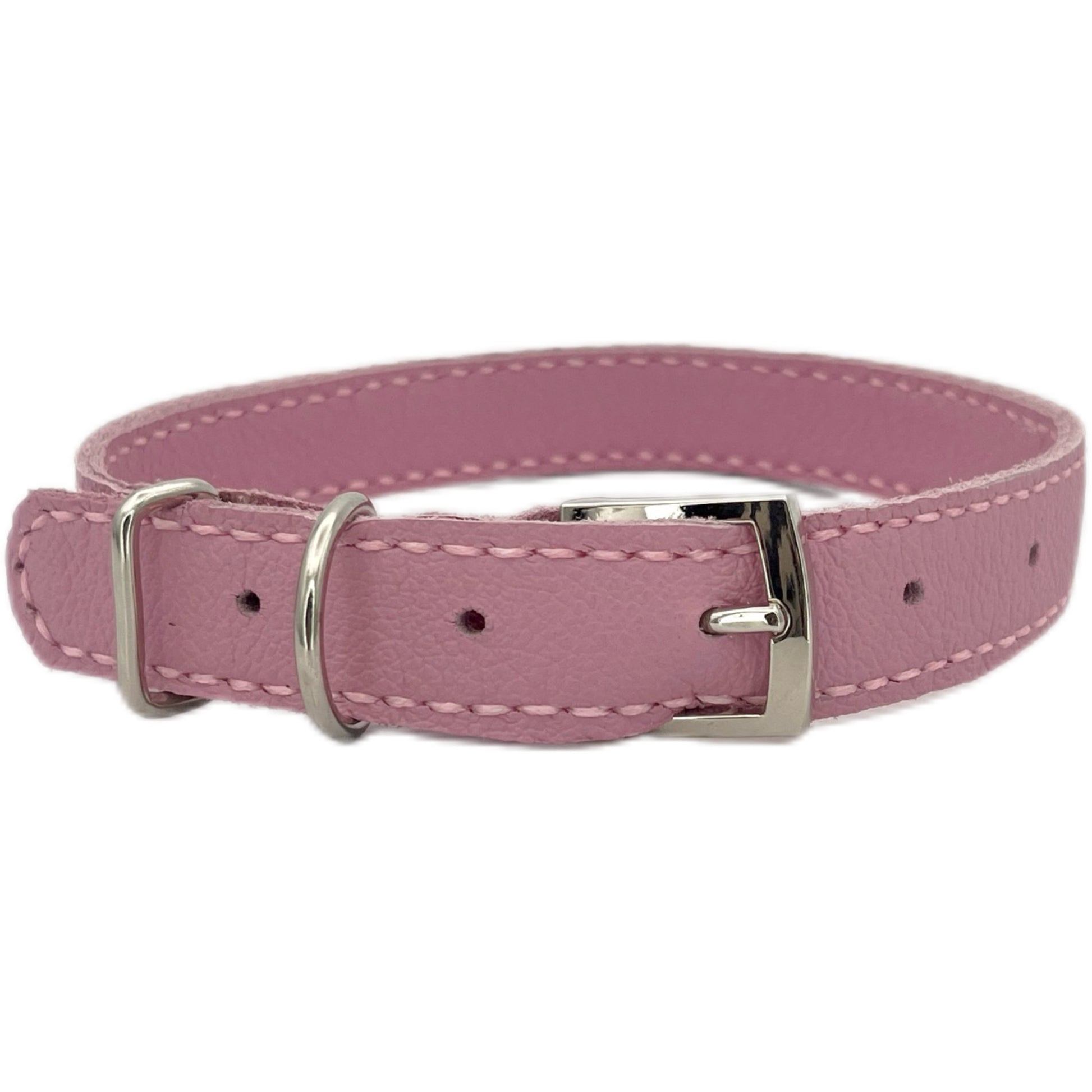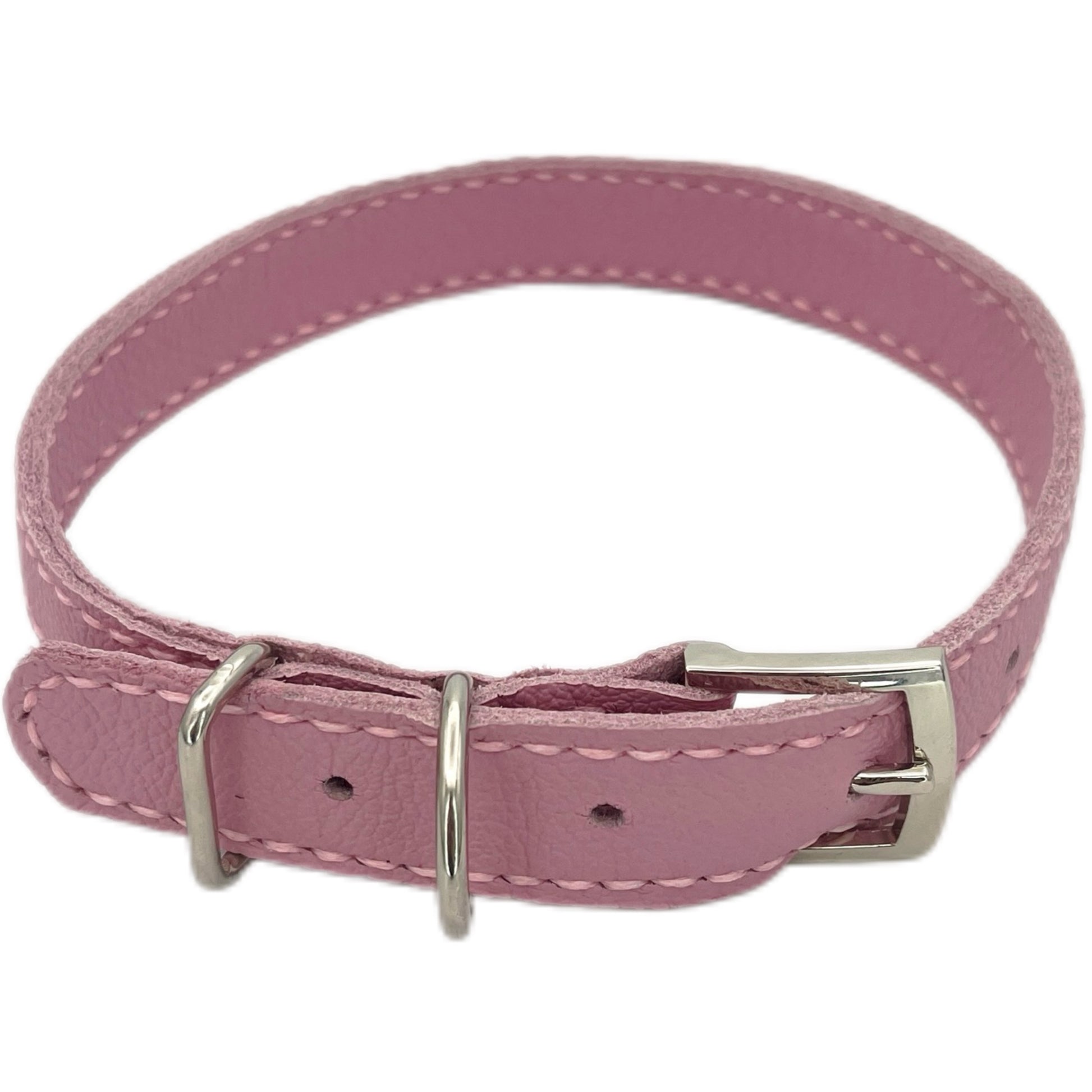 This collar is made using super Soft Leather and is all hand stitched, it is made to fit neck size 16-20 inches and is 25mm wide, and has a silver buckle, D ring and loop,