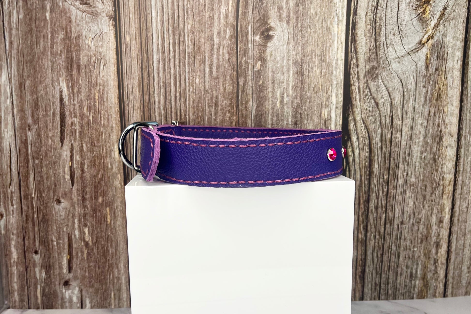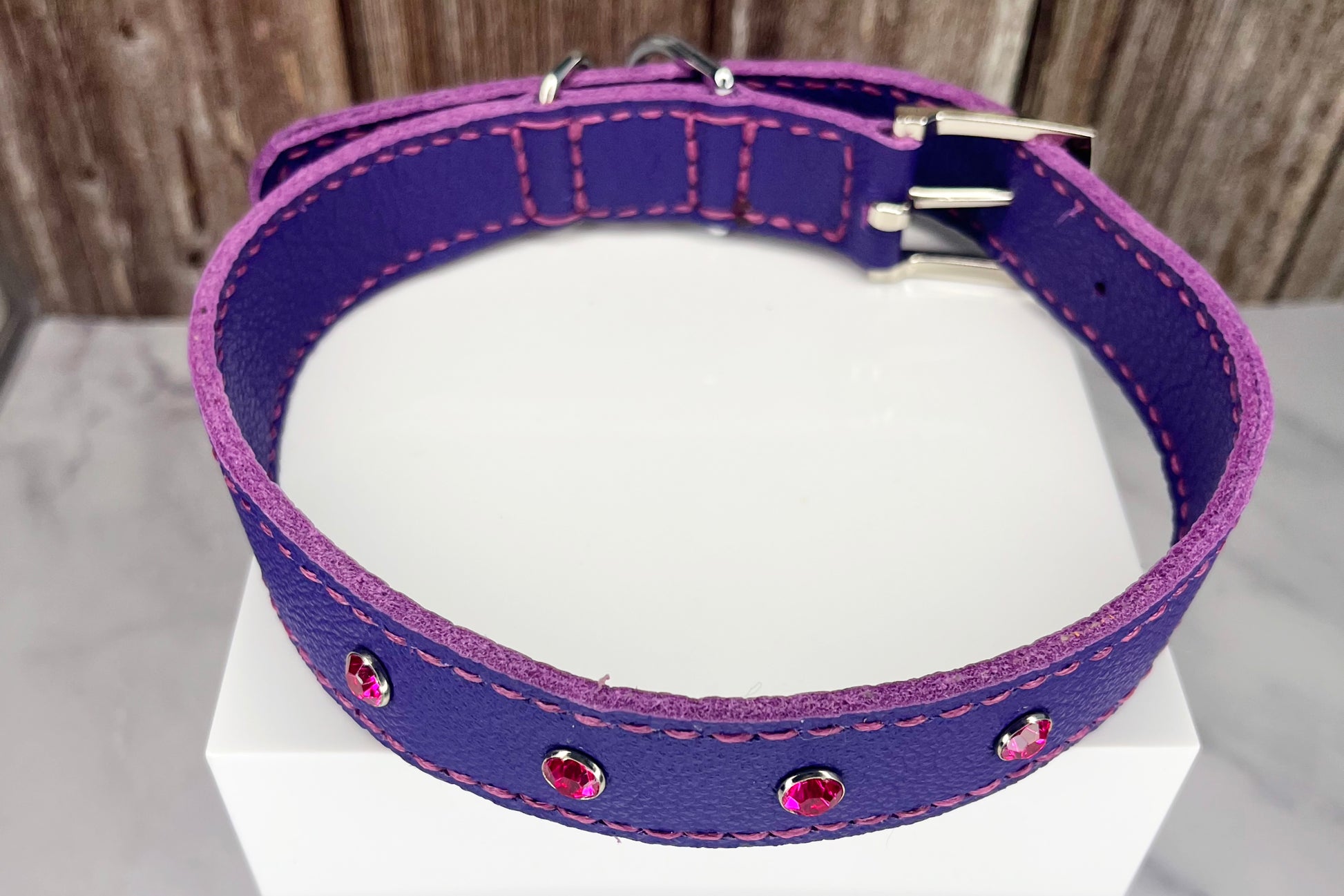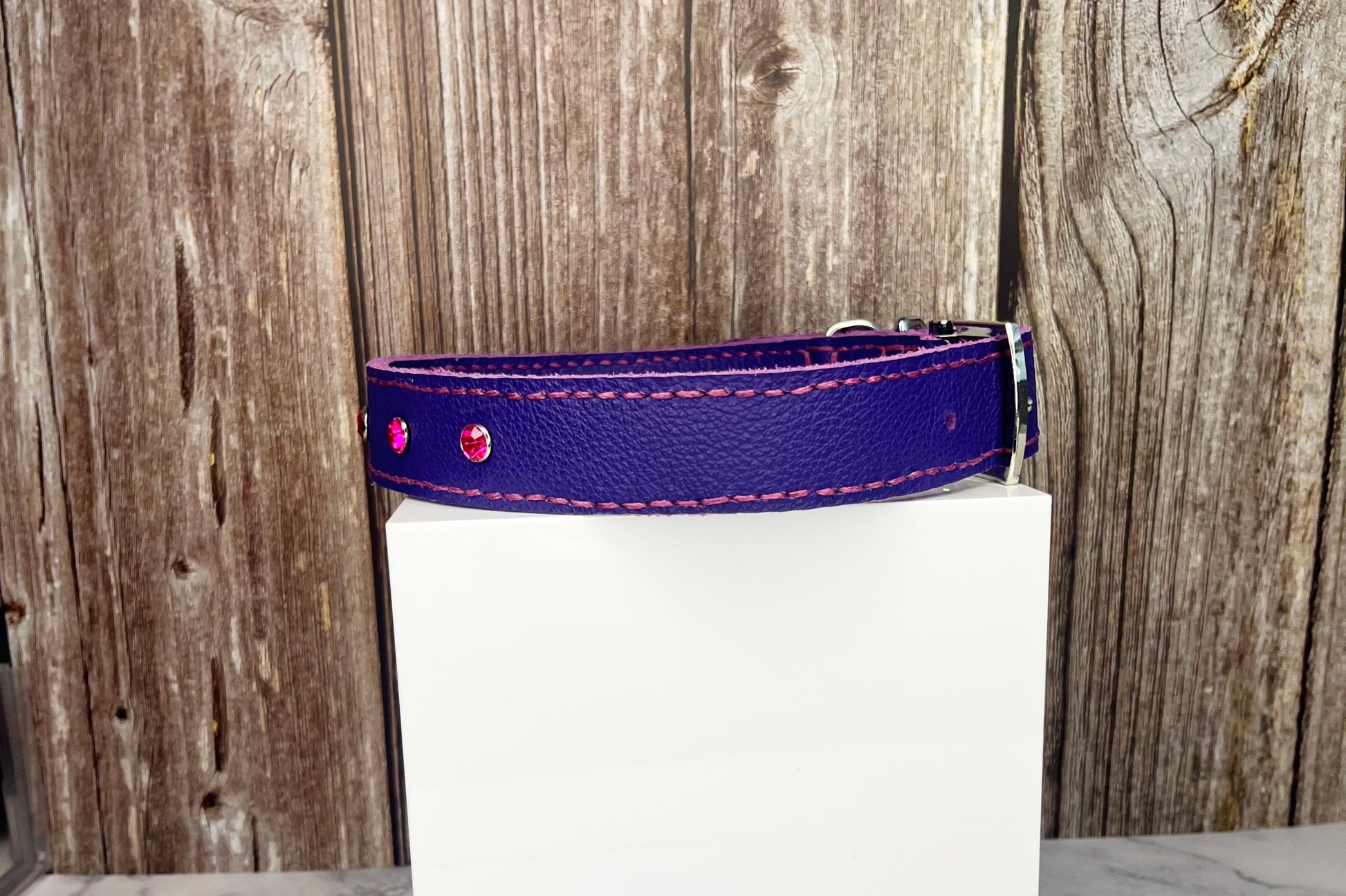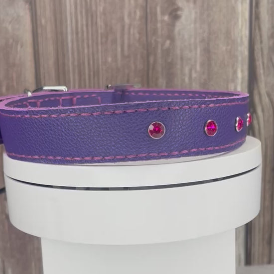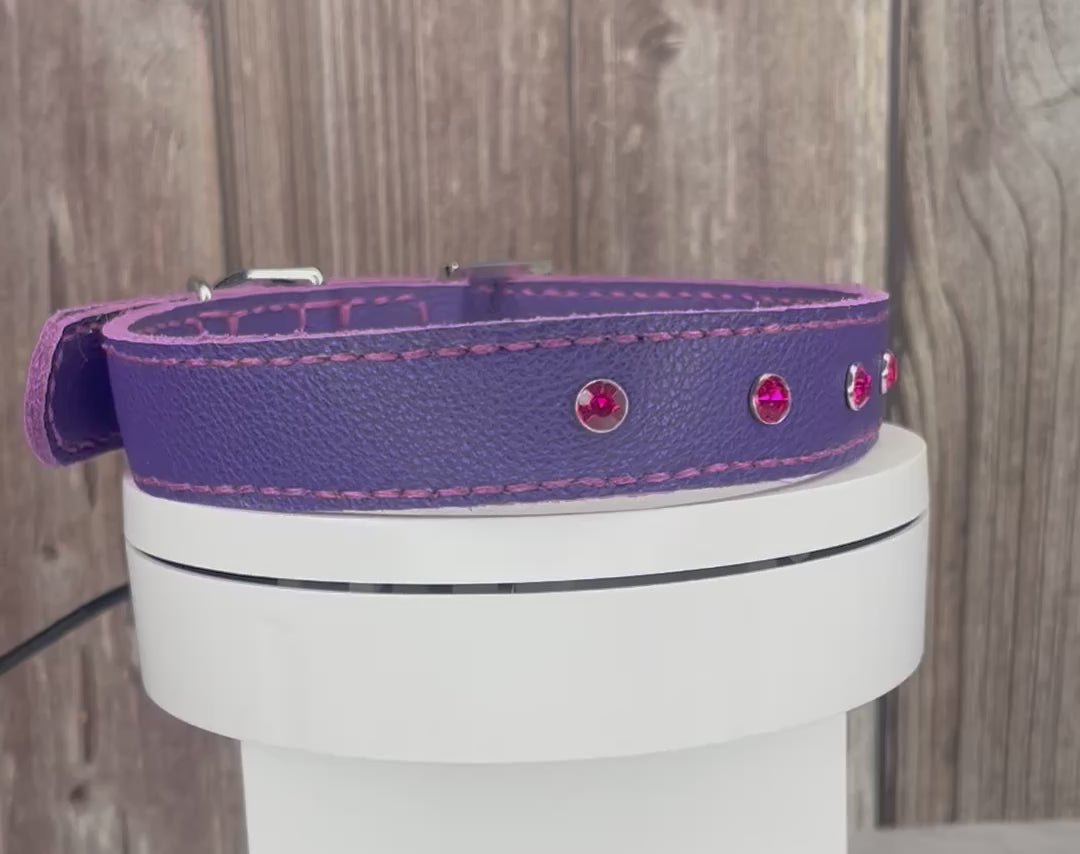 This Purple leather collar is handmade and hand stitched in Purple waxed thread, It has 4 Hot Pink Diamante Rivets
