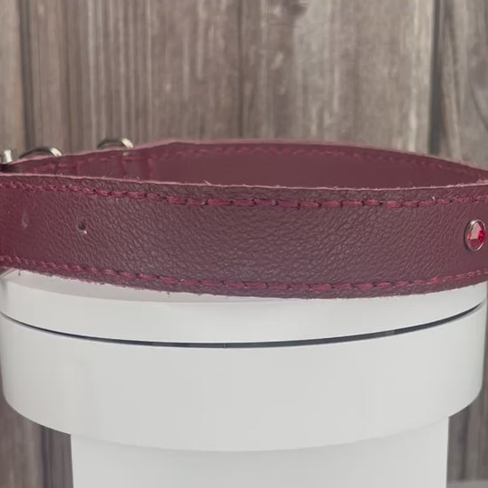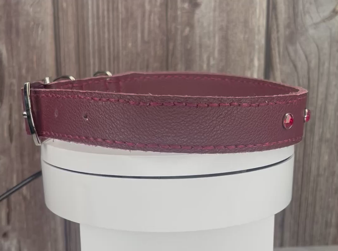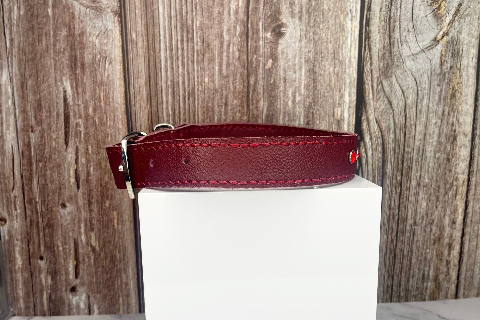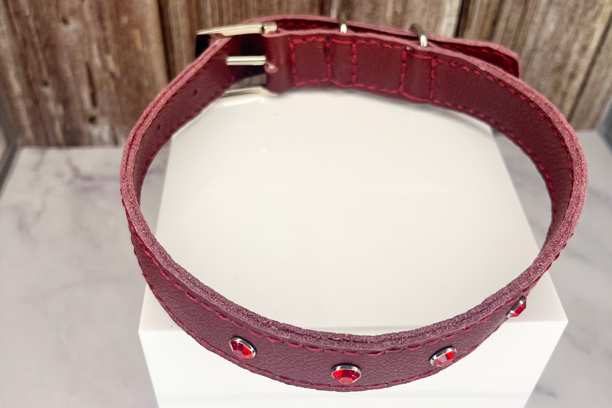 This Red leather collar is handmade and hand stitched in Red waxed thread, It has 4 Red Diamante Rivets
