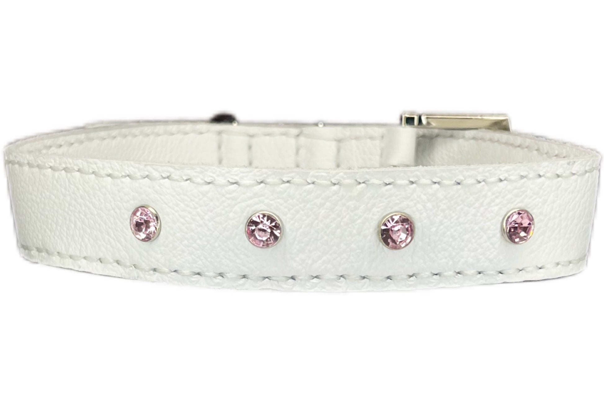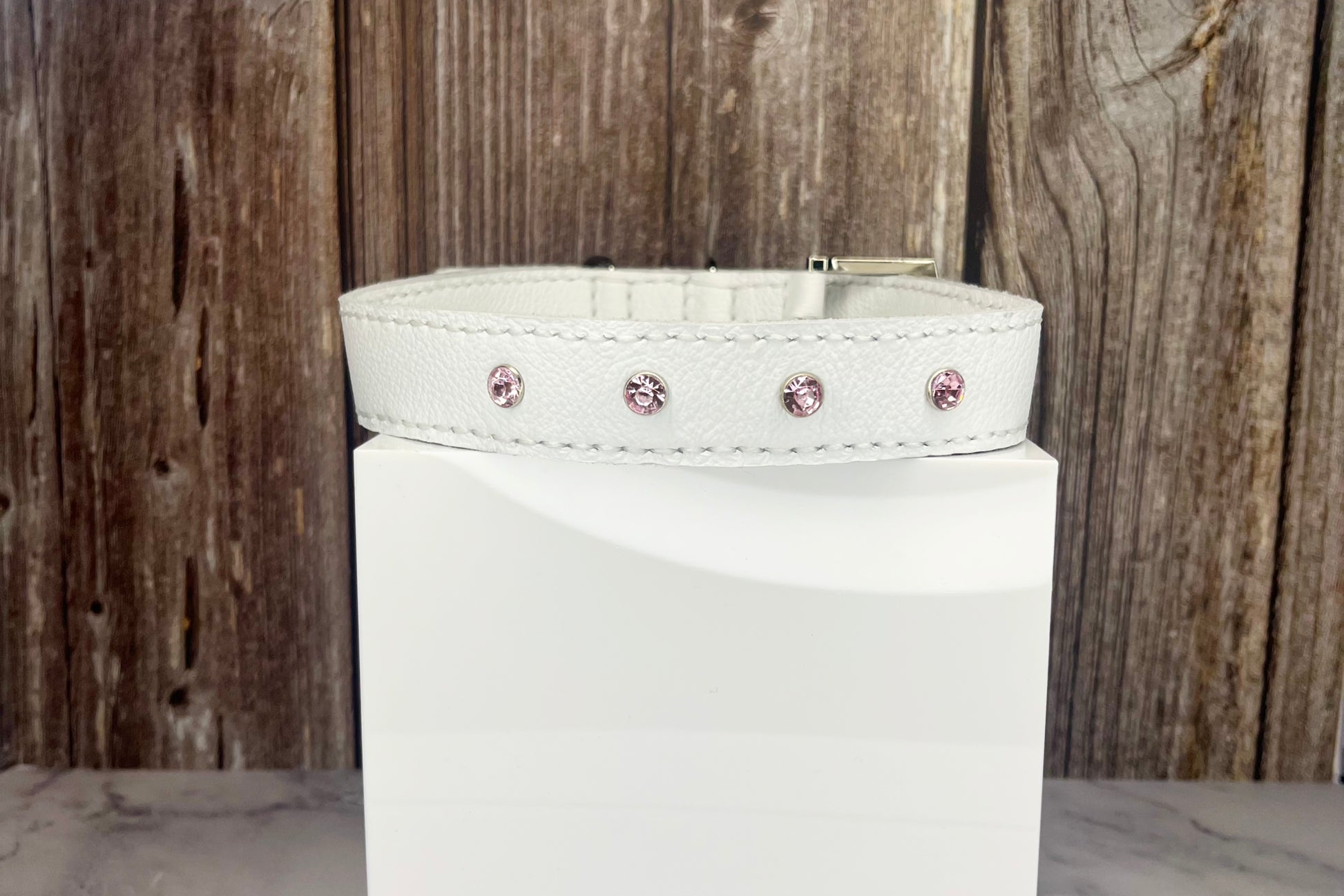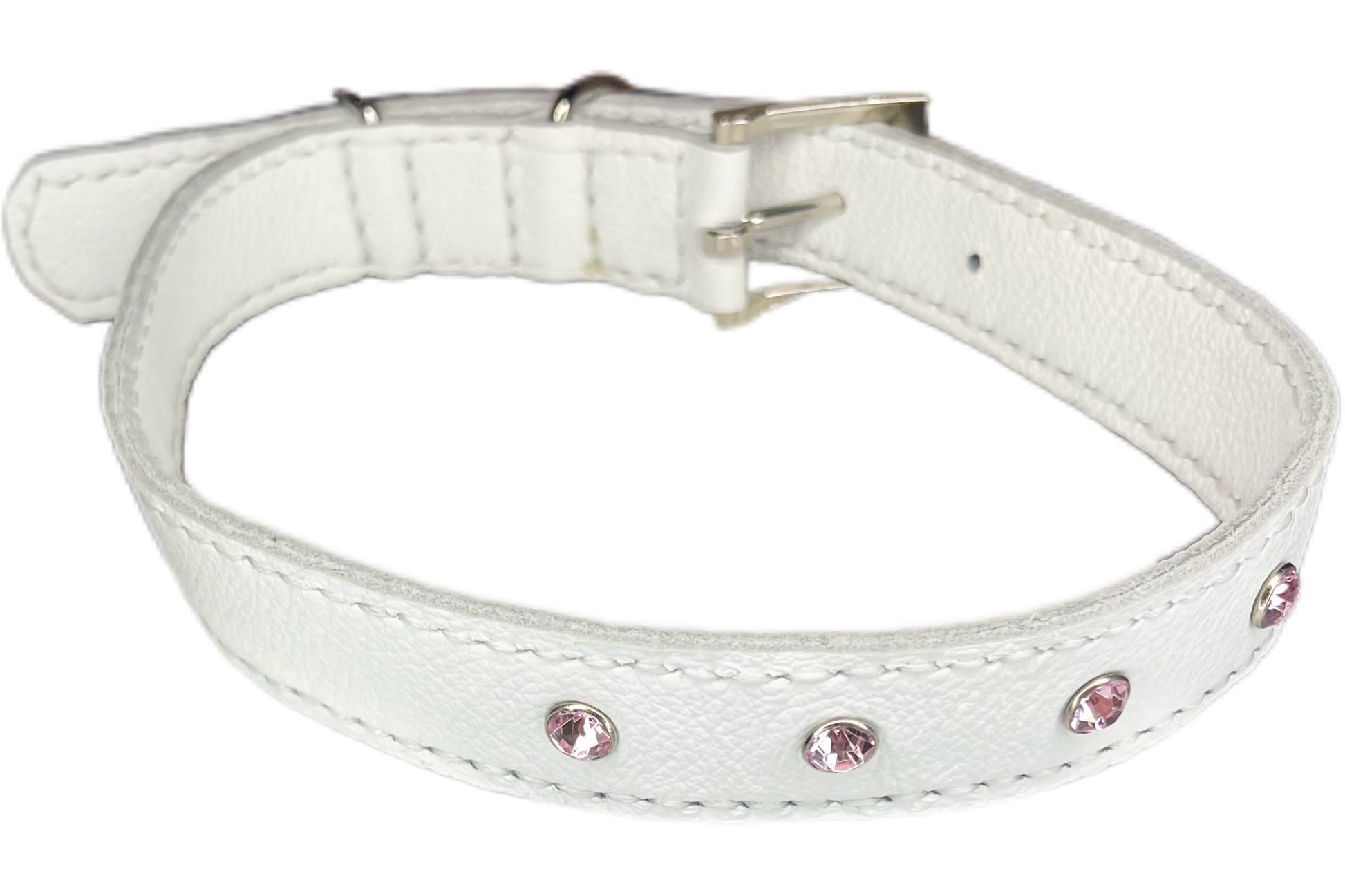 This White leather collar is handmade and hand stitched in White waxed thread, It has 4 Light Pink Diamante Rivets