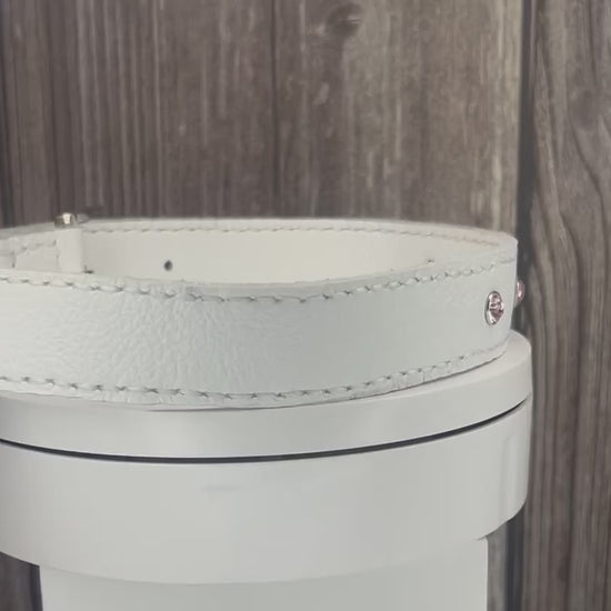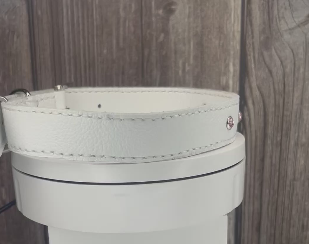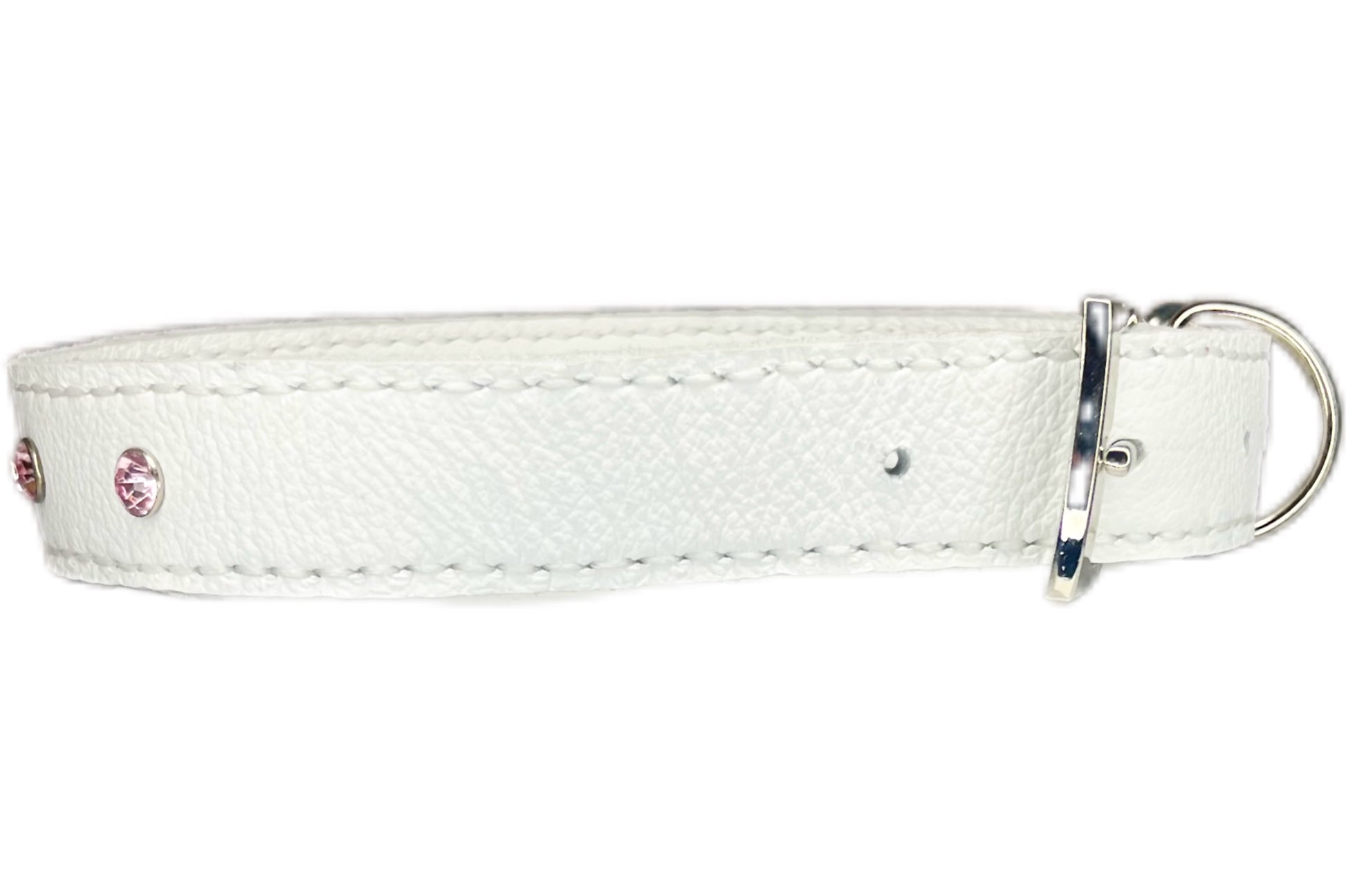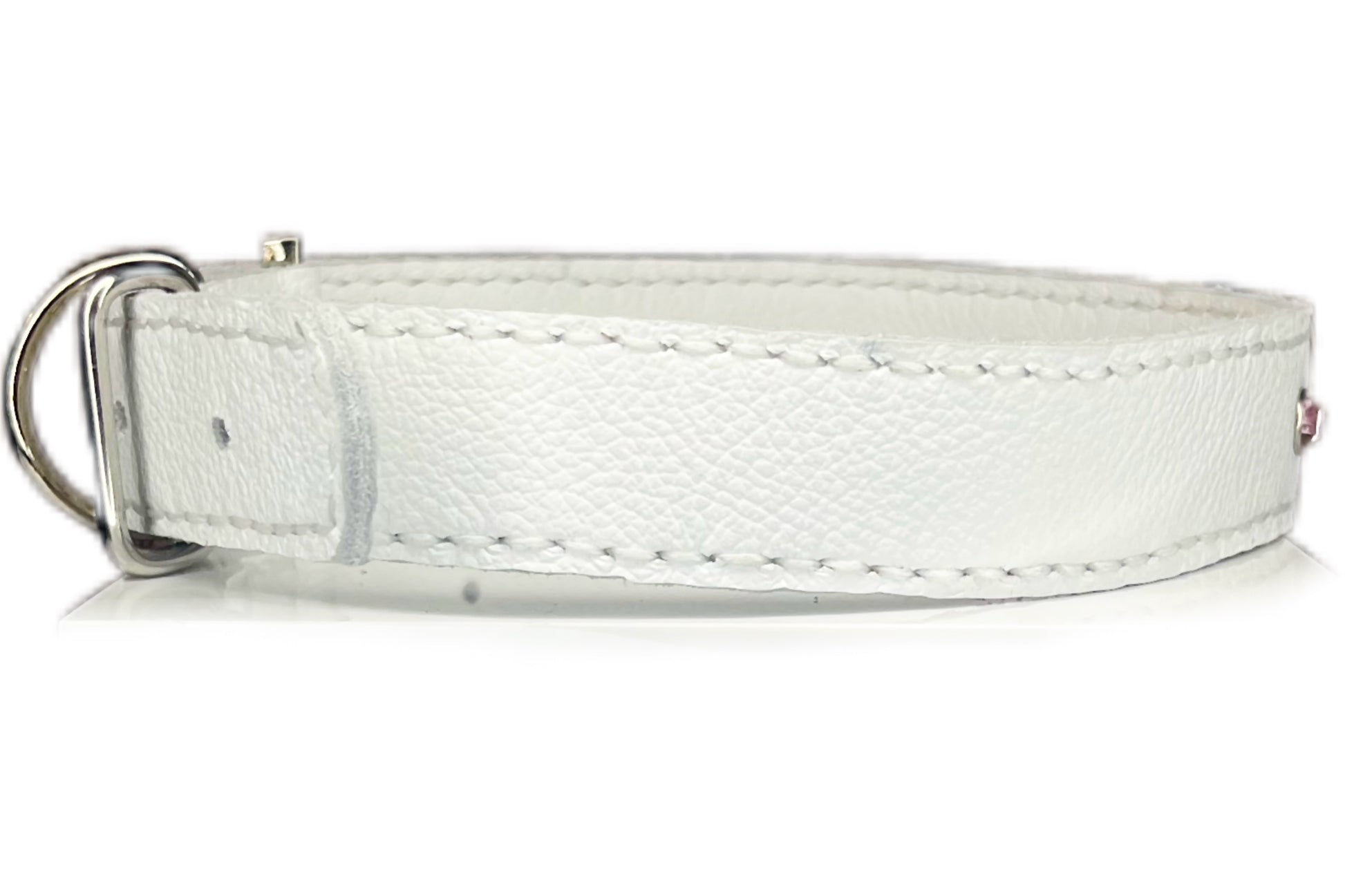 This White leather collar is handmade and hand stitched in White waxed thread, It has 4 Light Pink Diamante Rivets