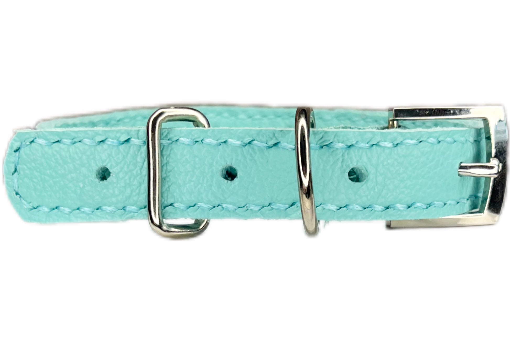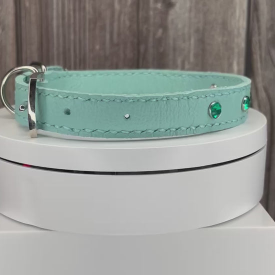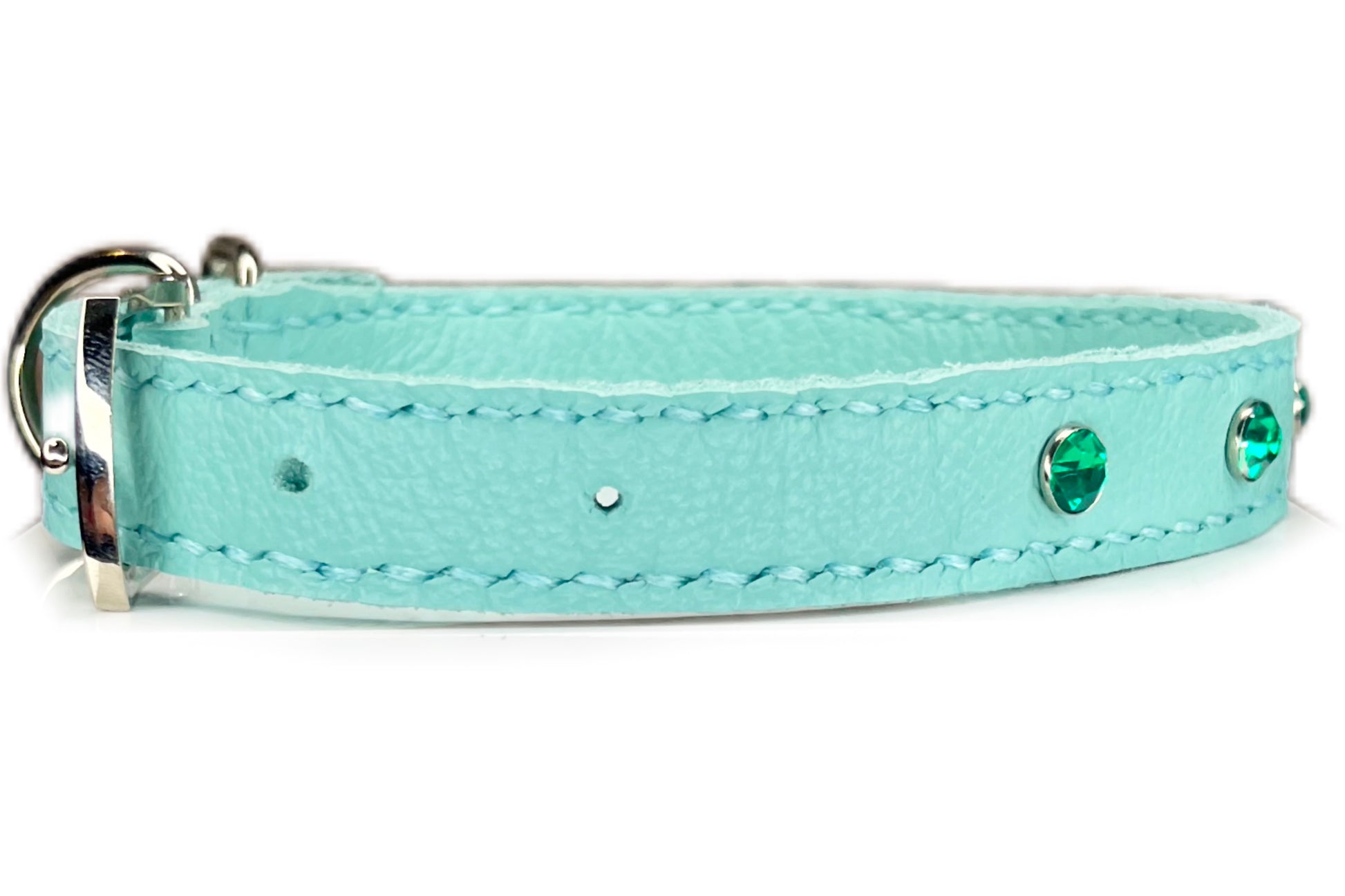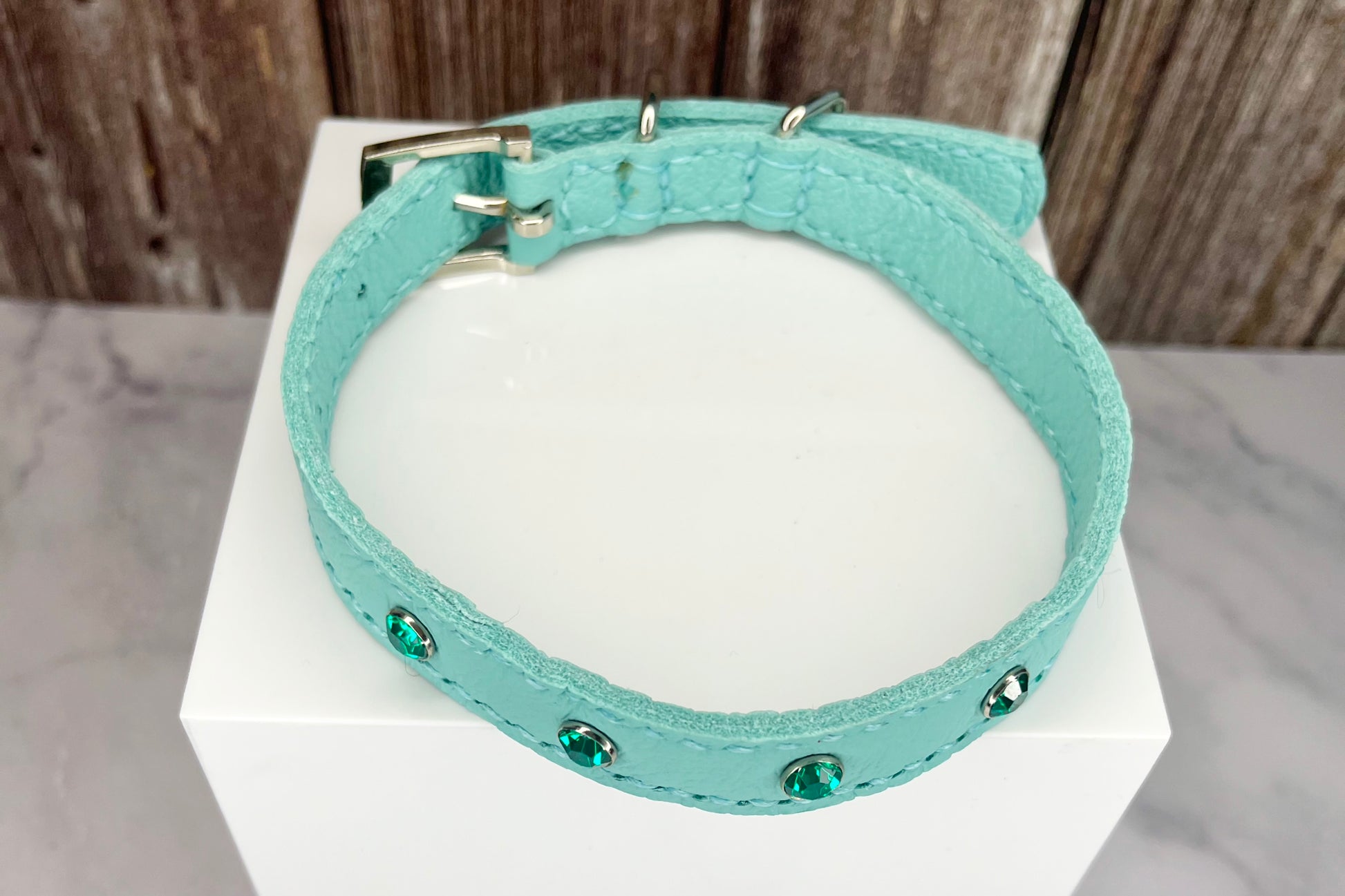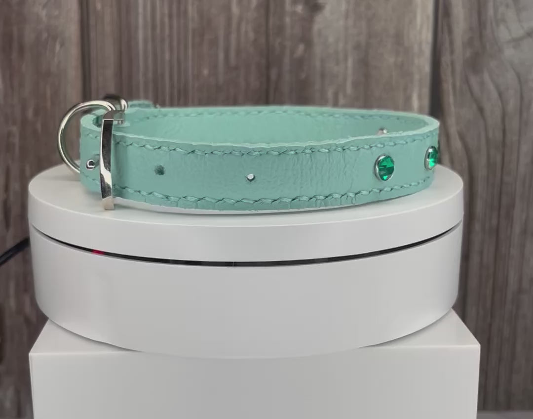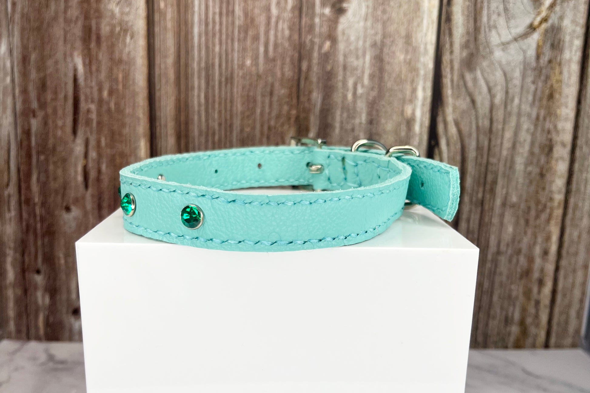 This Aqua Green leather collar is handmade and hand stitched in Green waxed thread, It has 4 Jade Diamante Rivets
