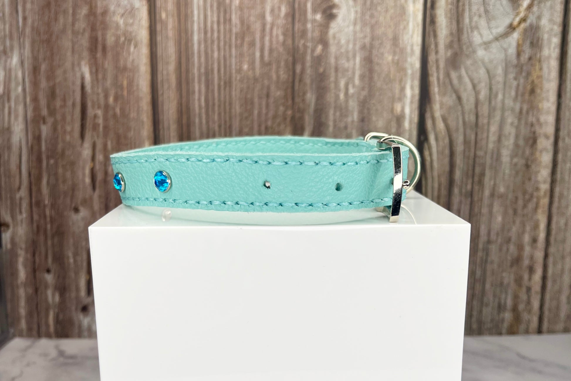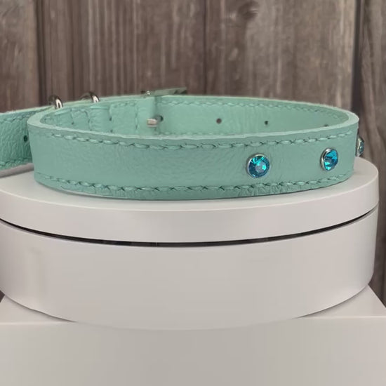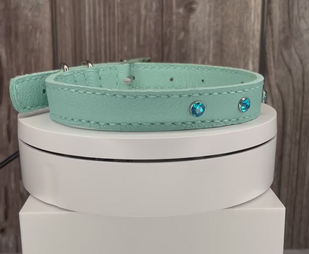 This Aqua Green leather collar is handmade and hand stitched in Green waxed thread, It has 4 Turquoise Diamante Rivets