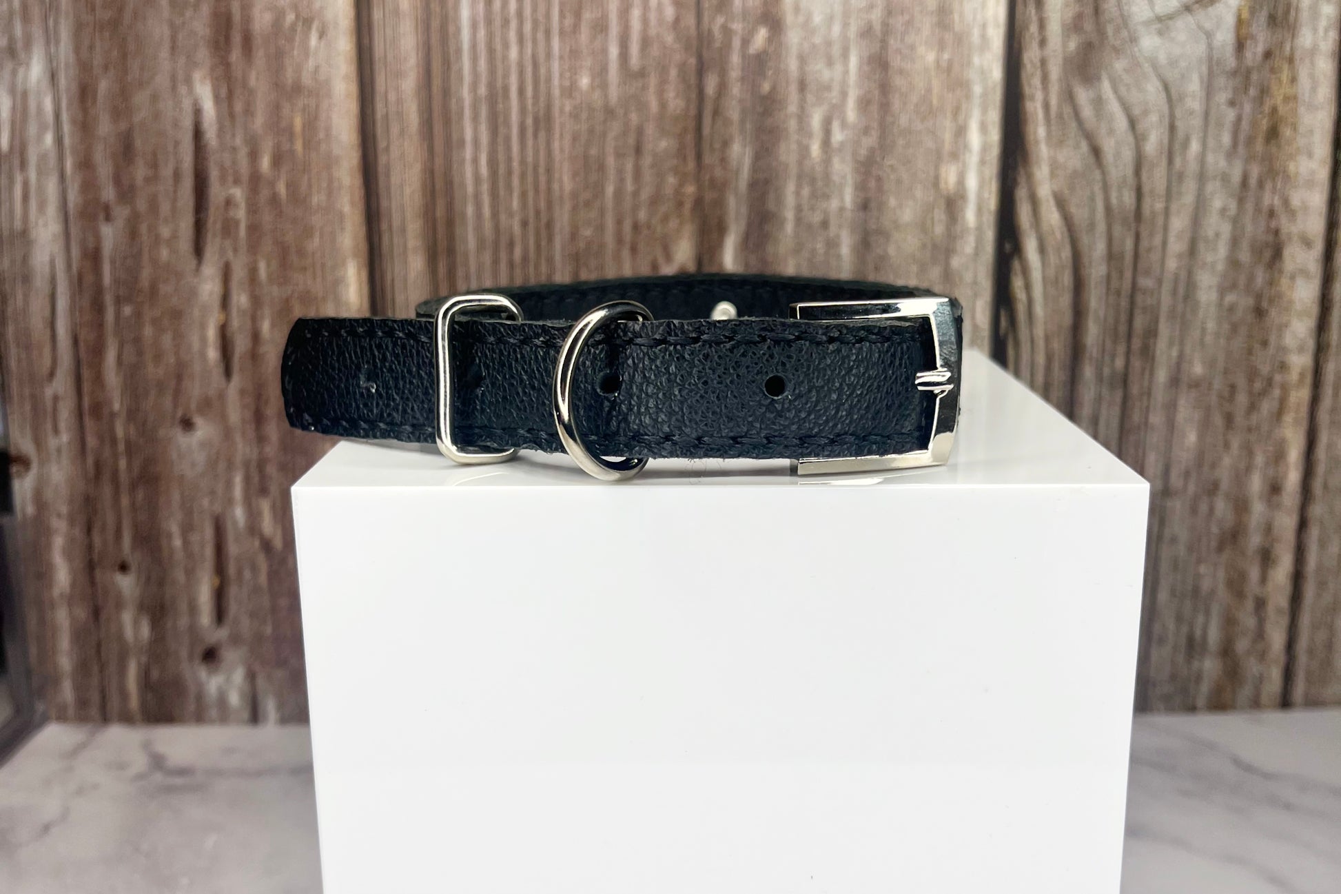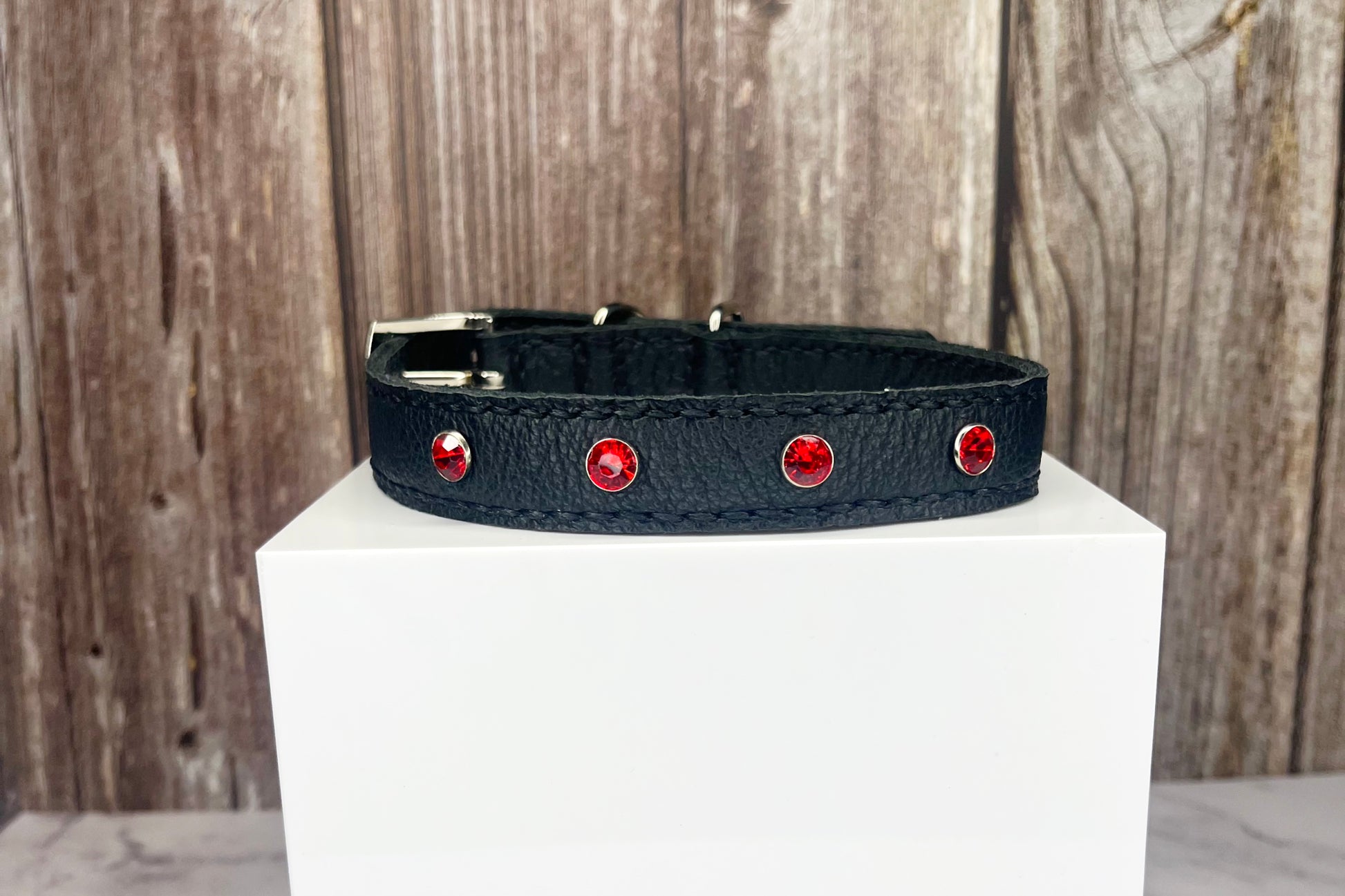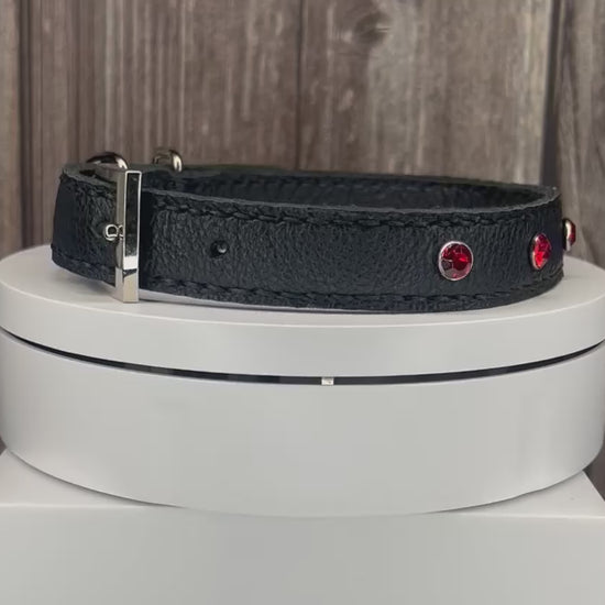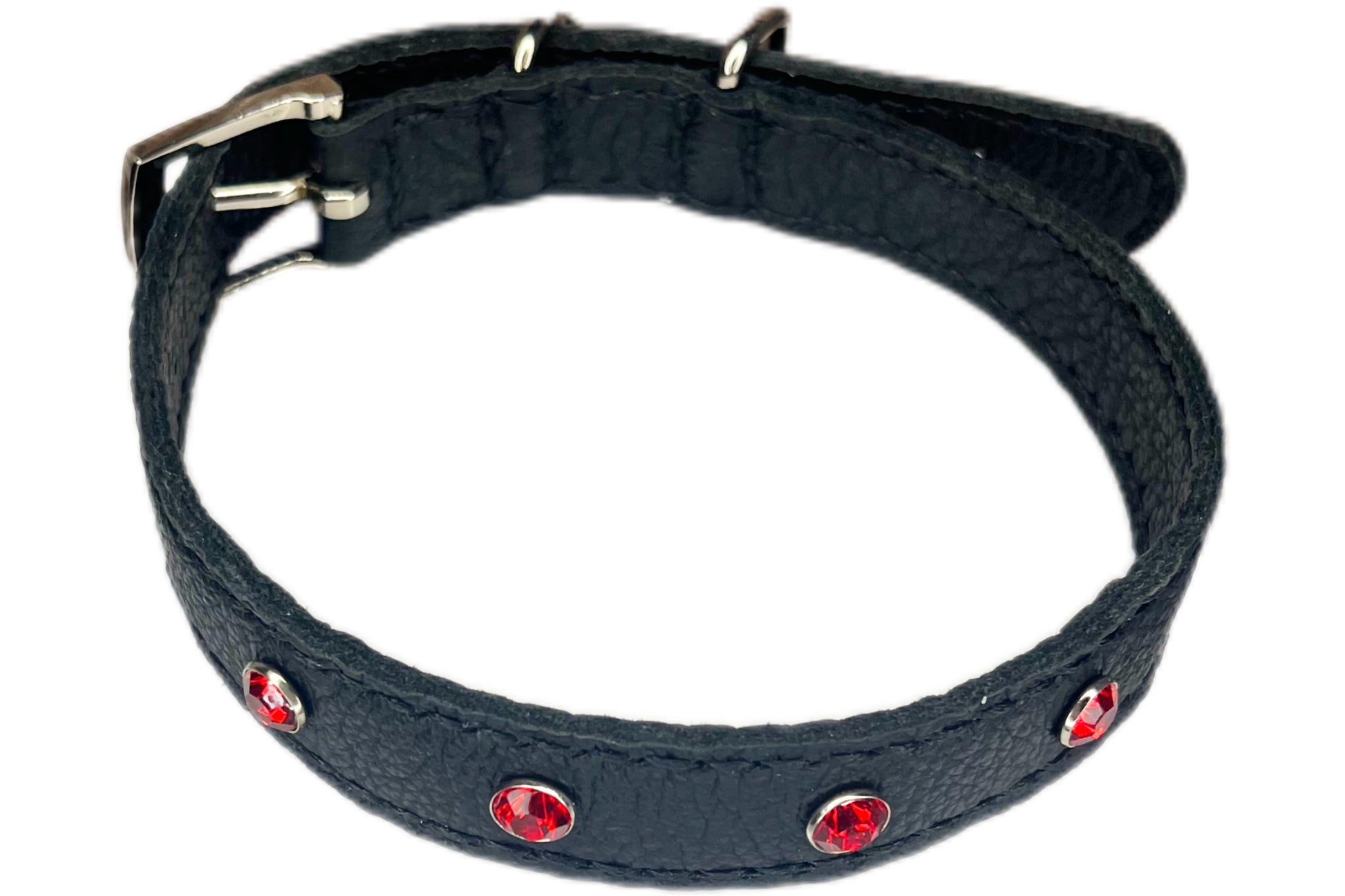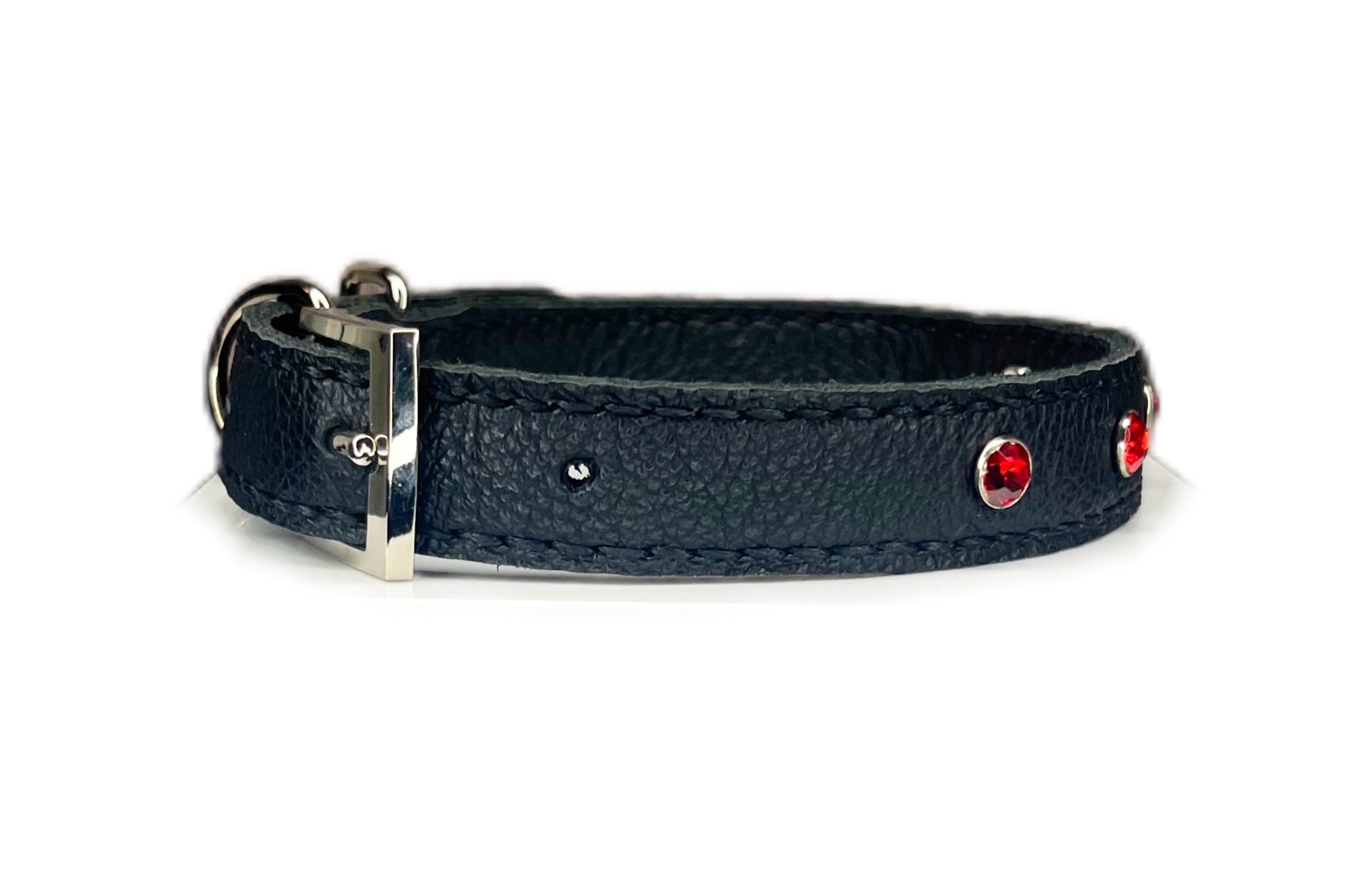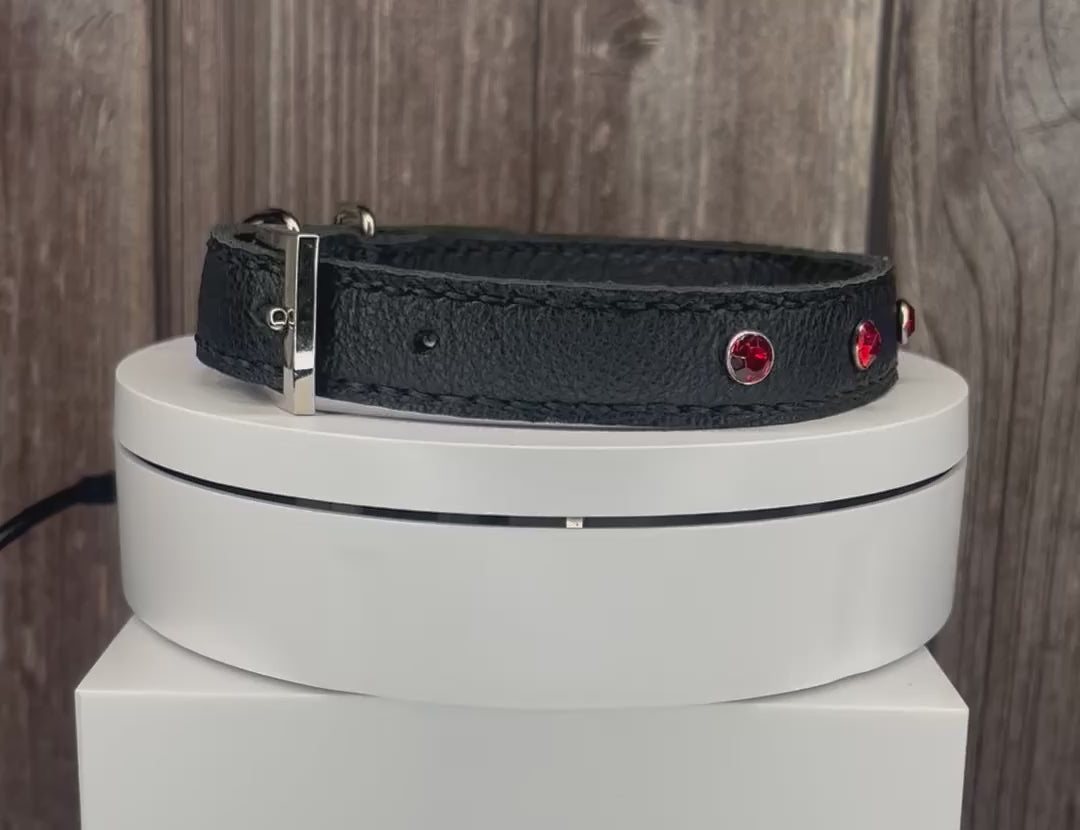 This Black leather collar is handmade and hand stitched in black waxed thread, It has 4 Red diamante Rivets