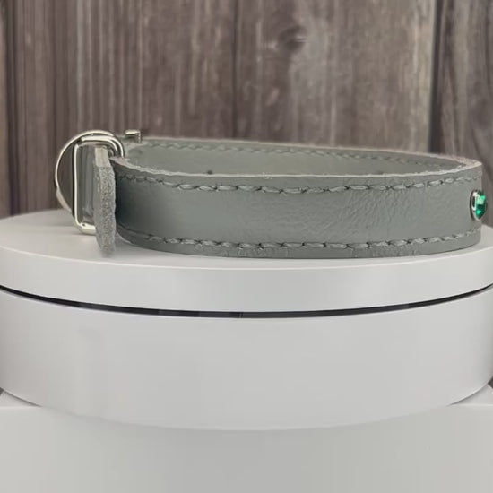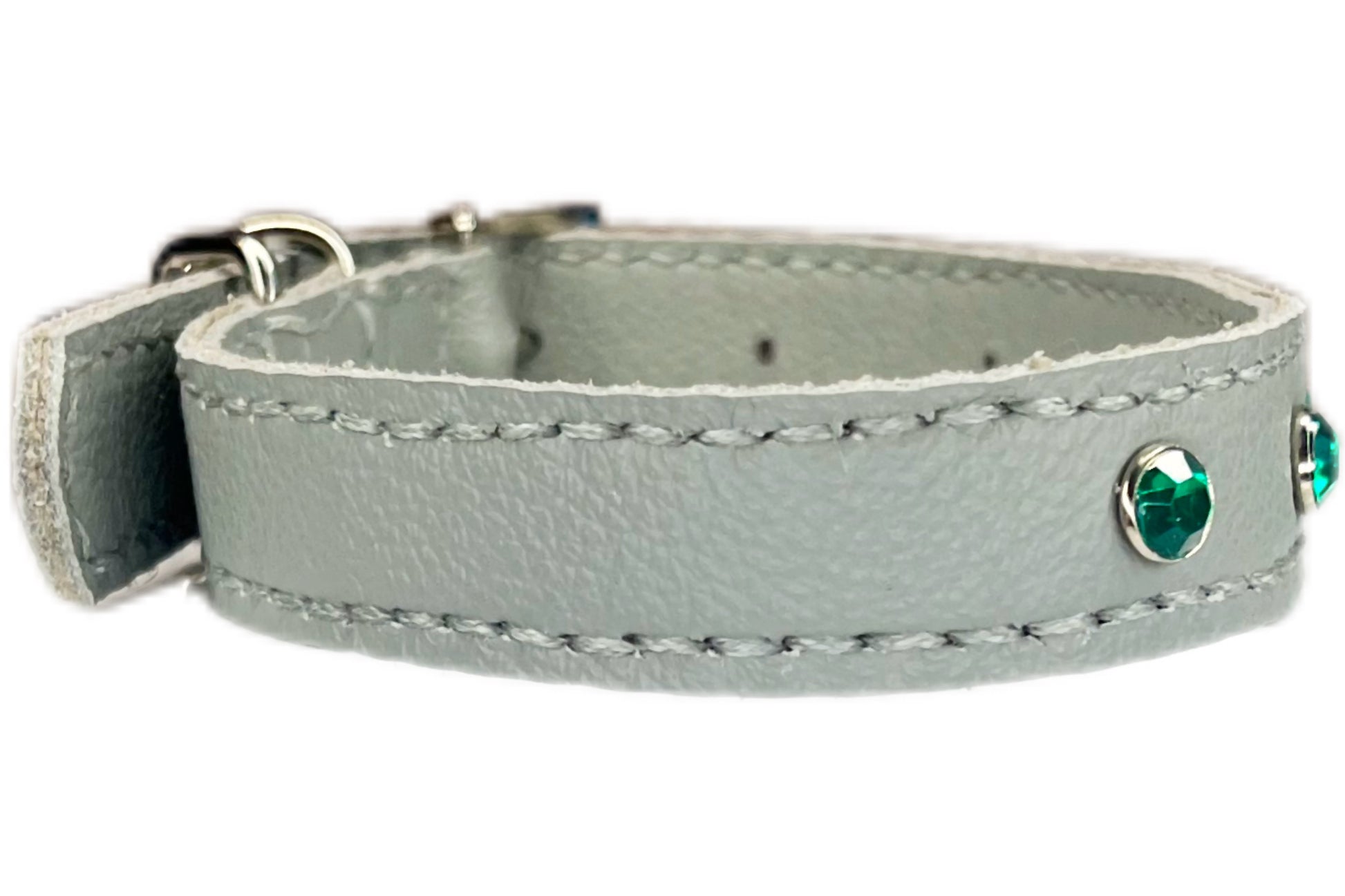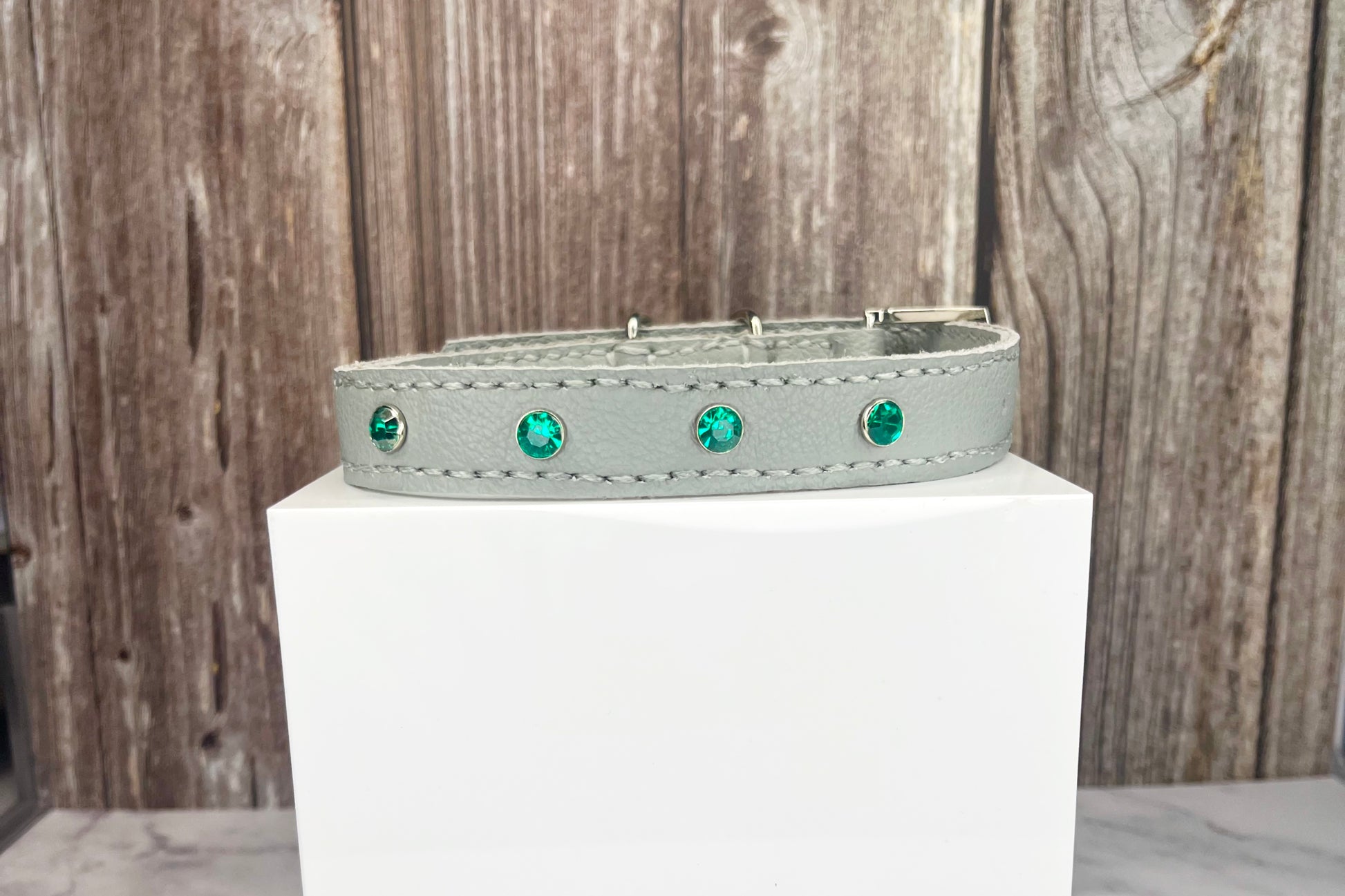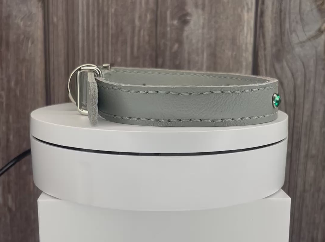 This Grey leather collar is handmade and hand stitched in grey waxed thread, It has 4 jade Diamante Rivets