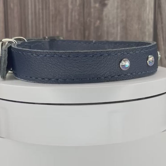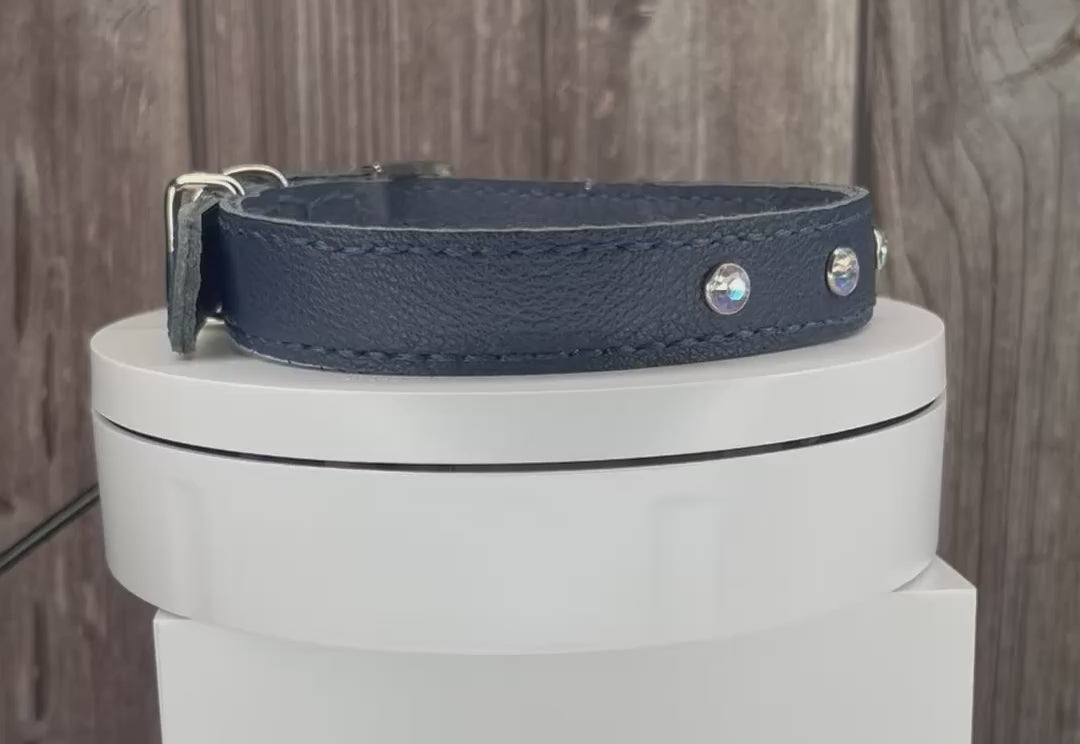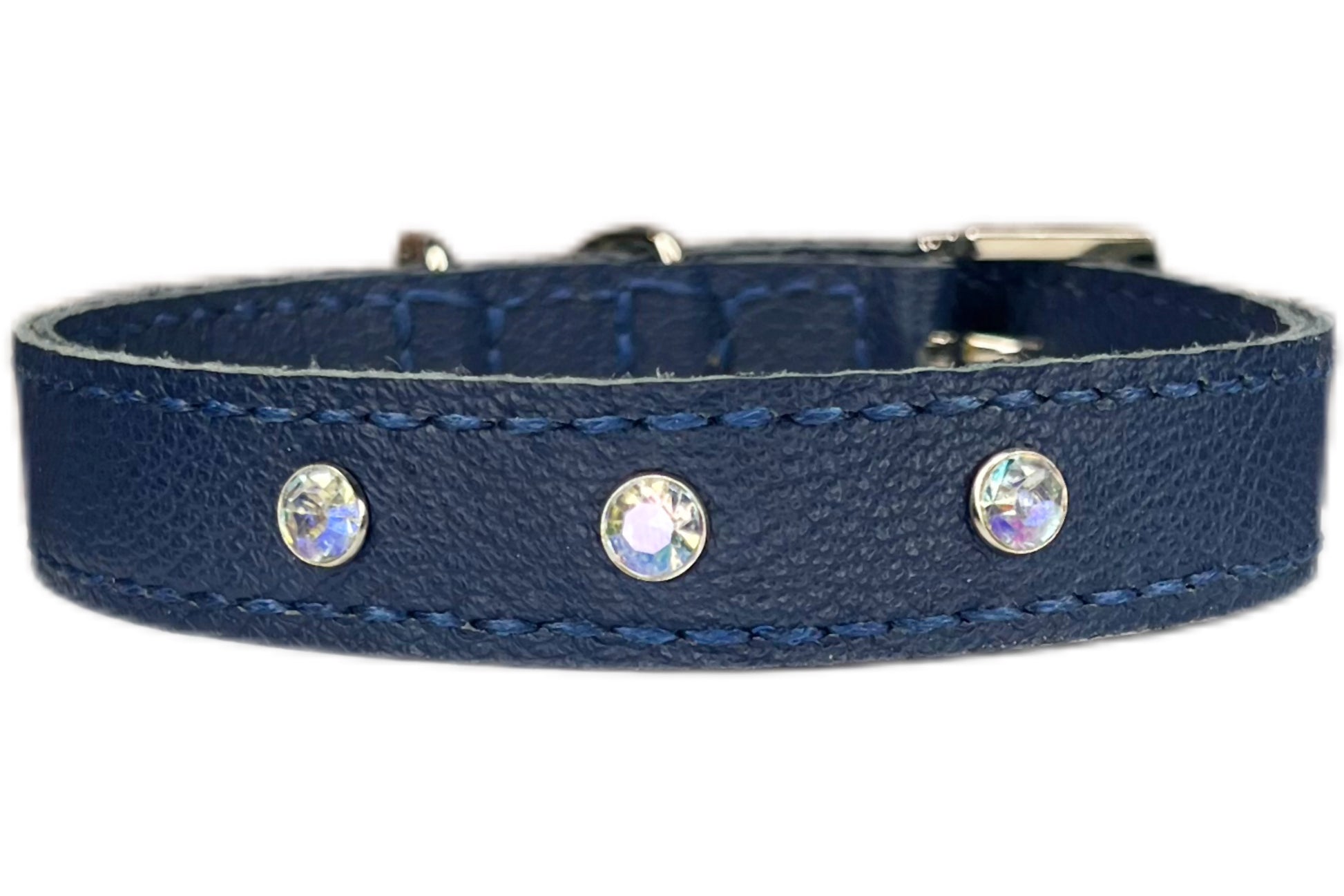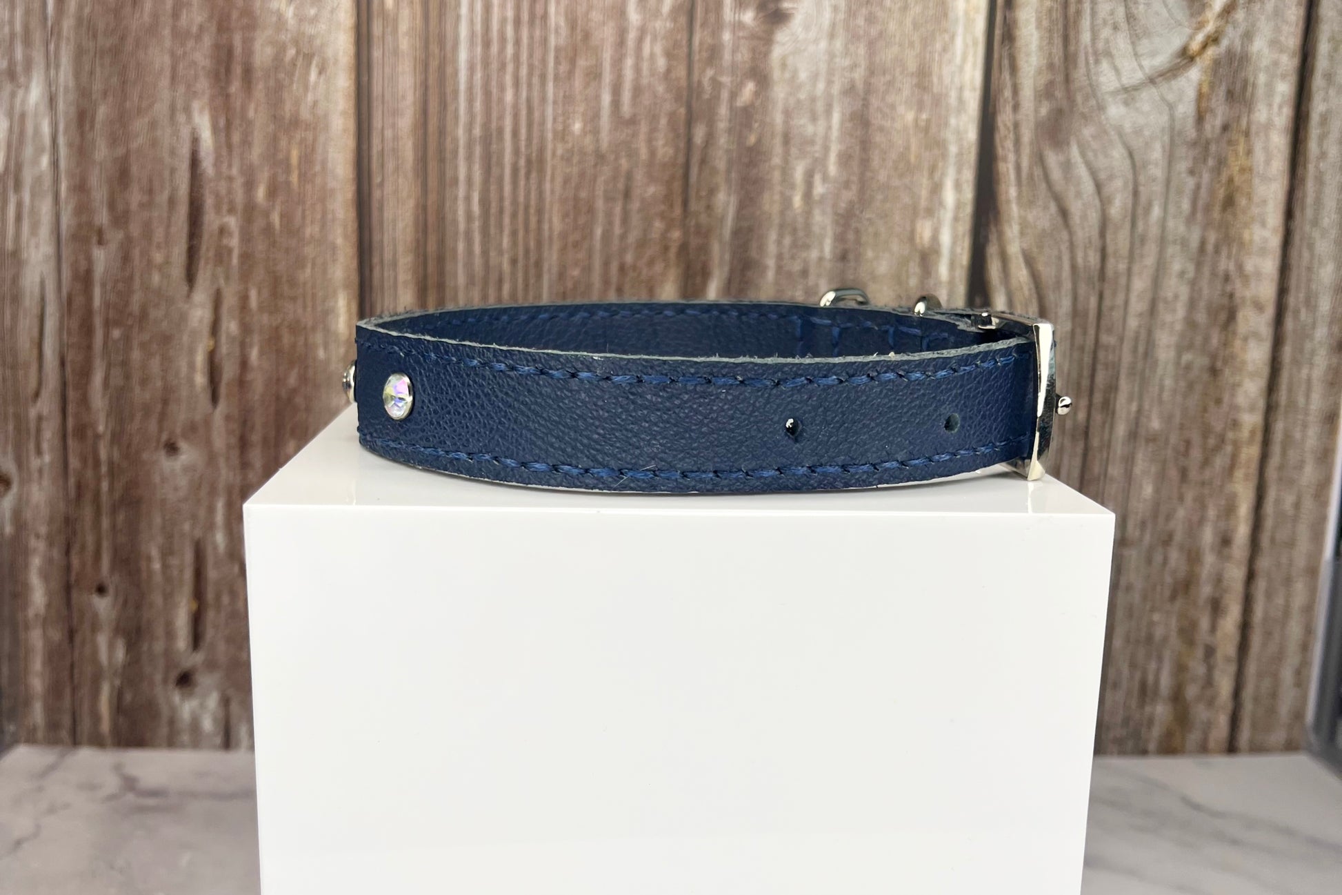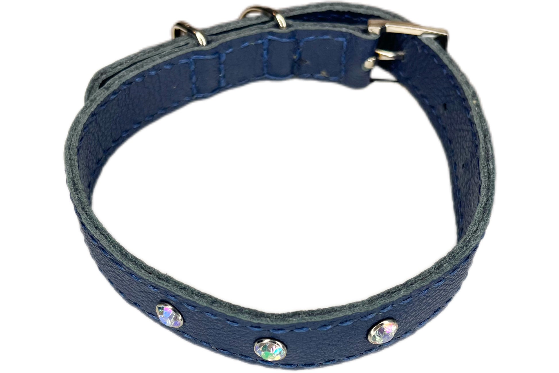 This Navy Blue leather collar is handmade and hand stitched in Blue waxed thread, It has 3 AB Diamante Rivets