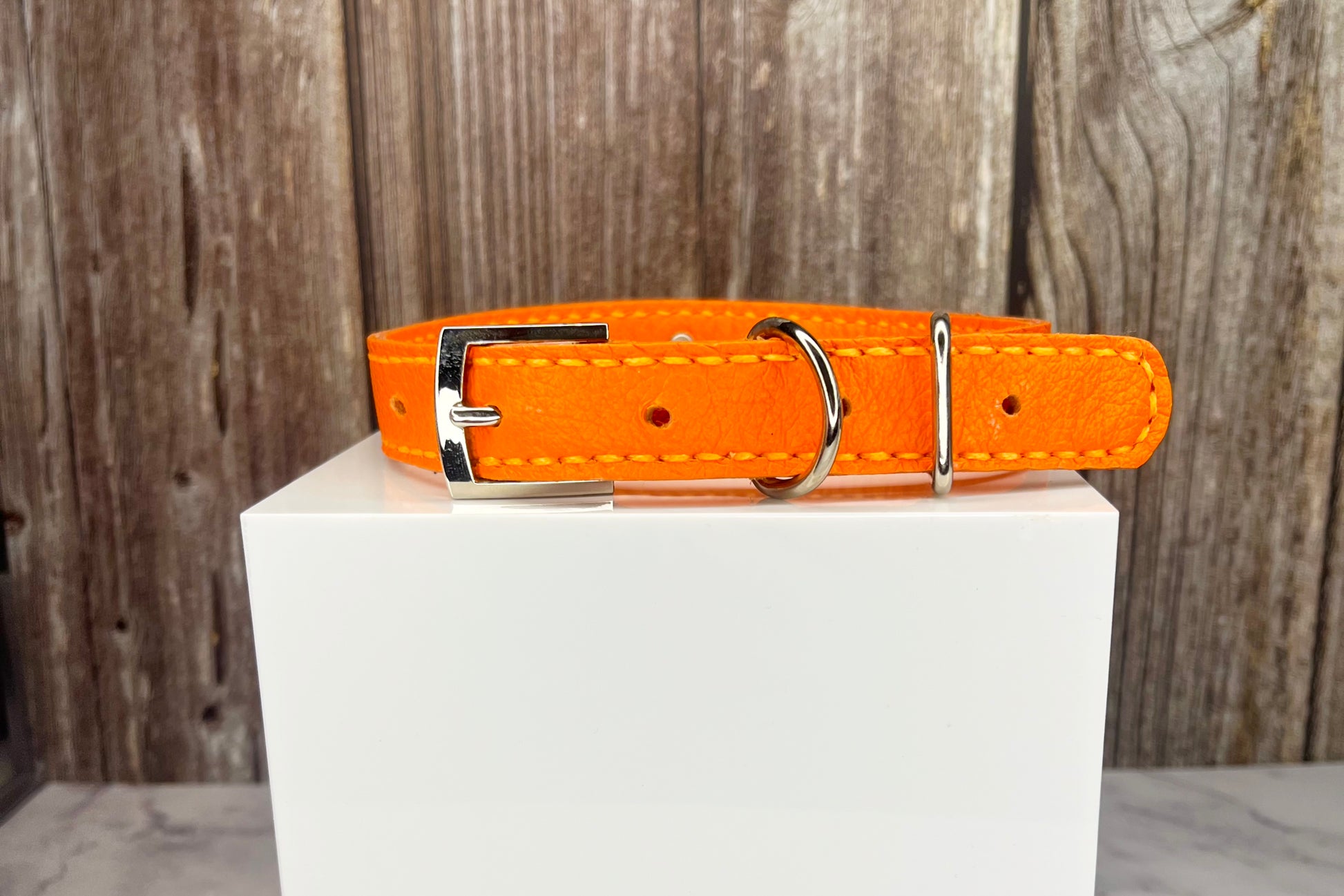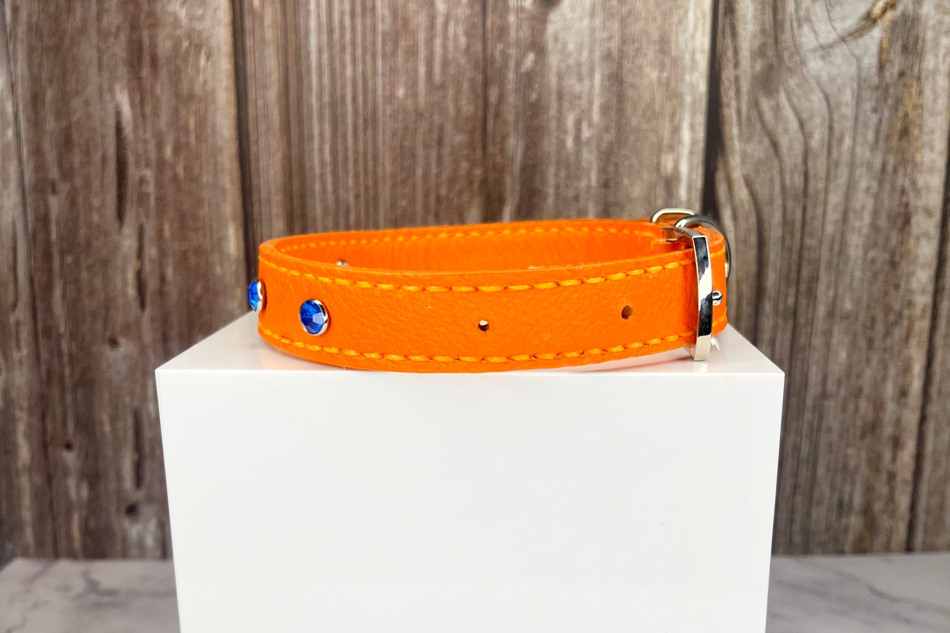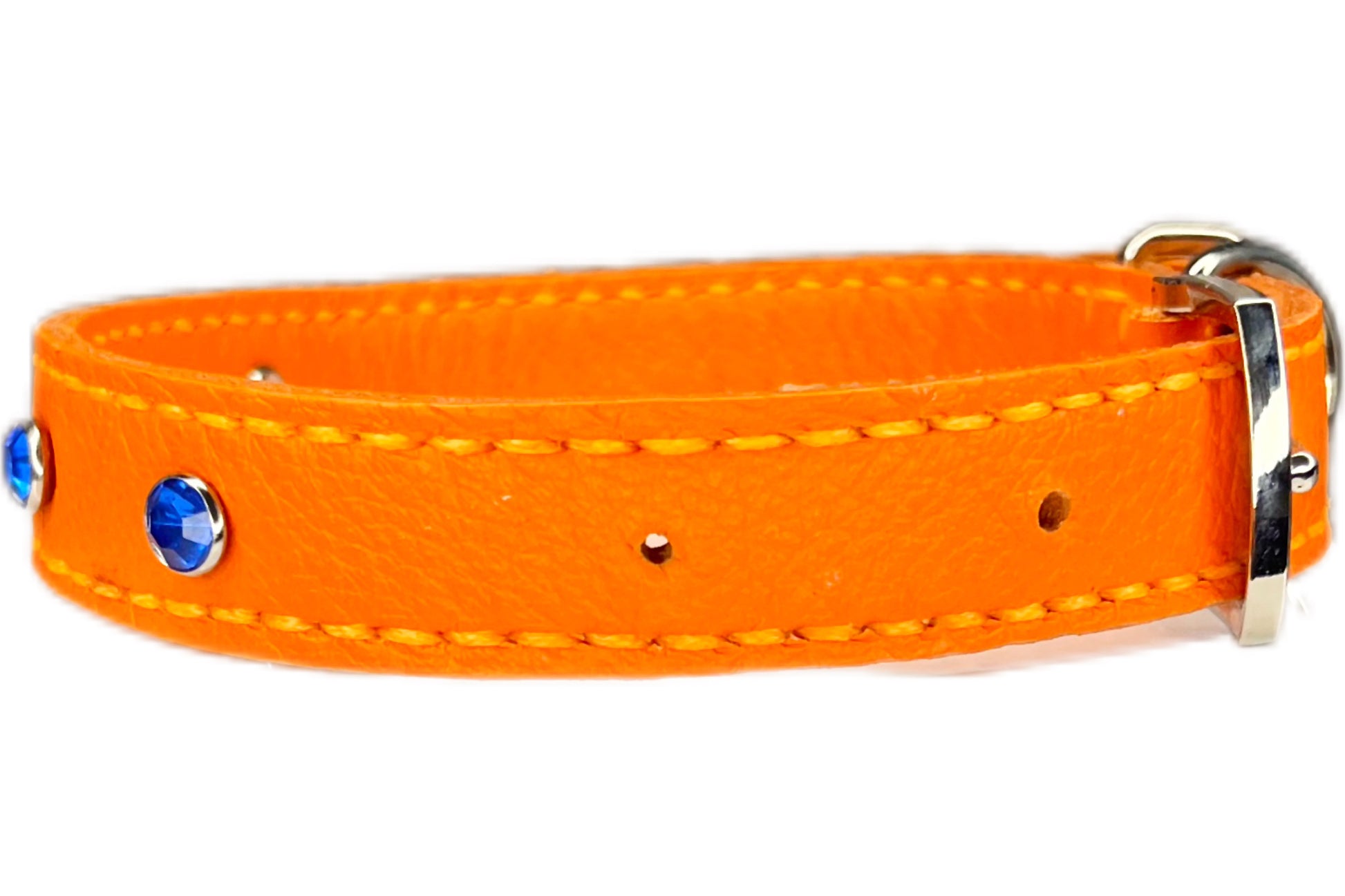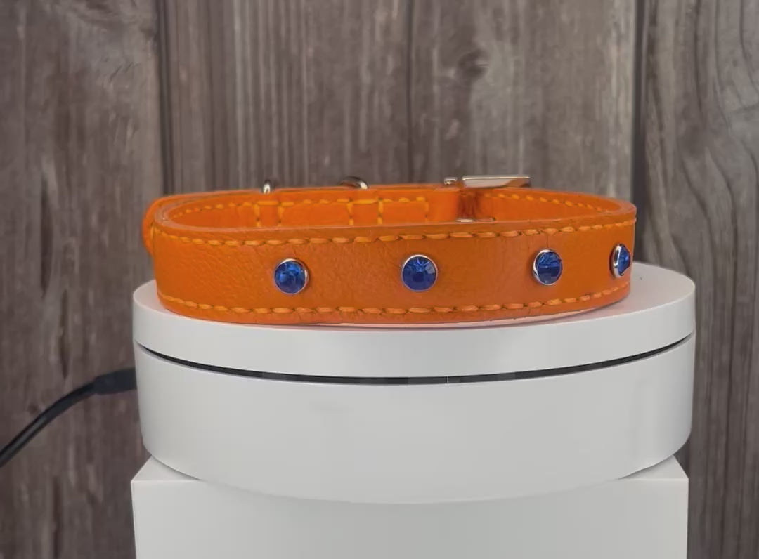 This Orange leather collar is handmade and hand stitched in Orange waxed thread, It has 4 Royal Blue diamante Rivets