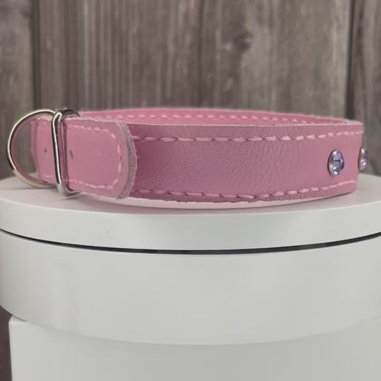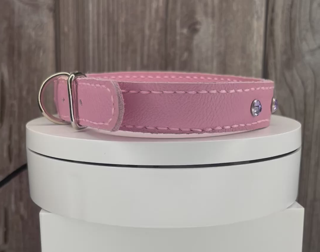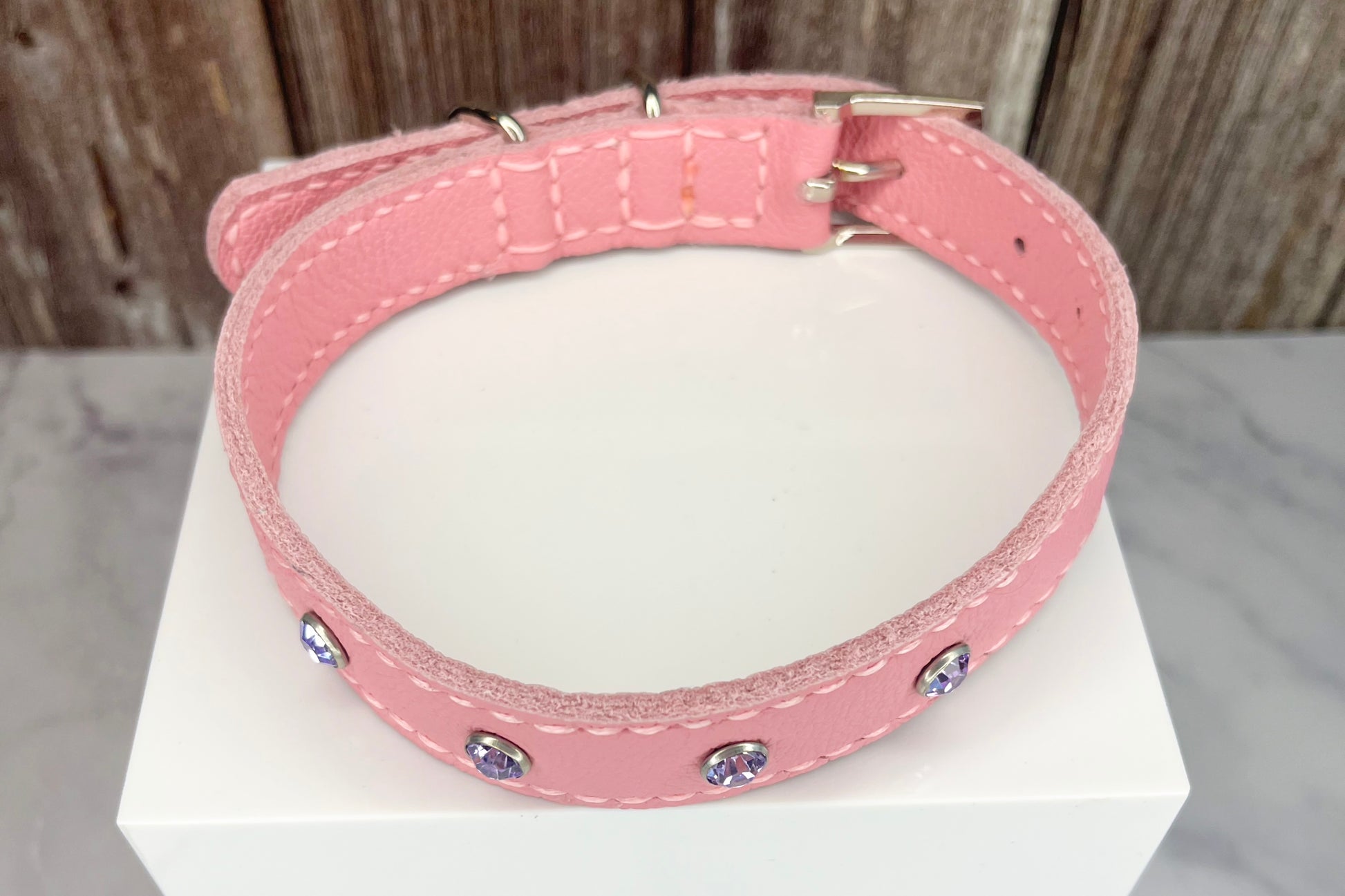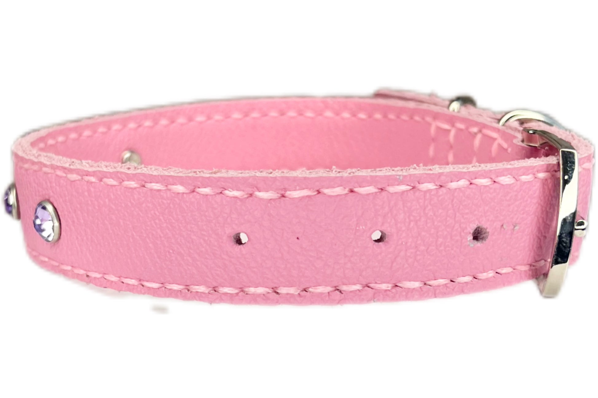 This Pink leather collar is handmade and hand stitched in Pink waxed thread, It has 4 Lilac Diamante Rivets