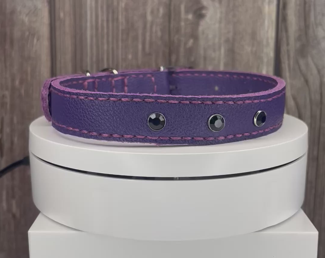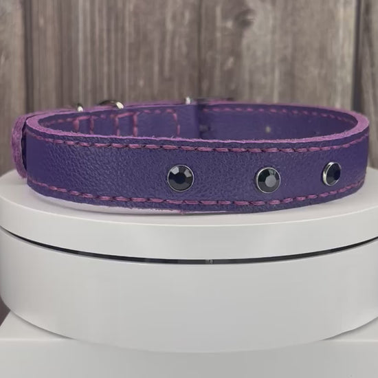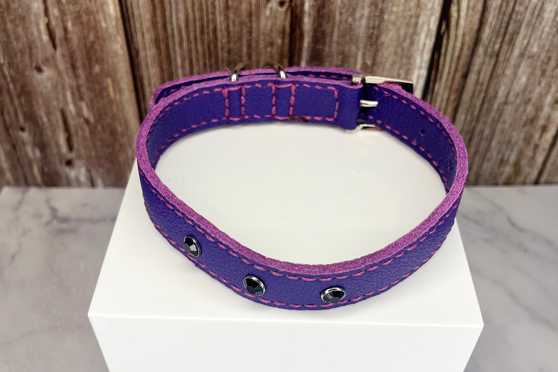 This Purple leather collar is handmade and hand stitched in purple waxed thread, It has 4 Black diamante Rivets