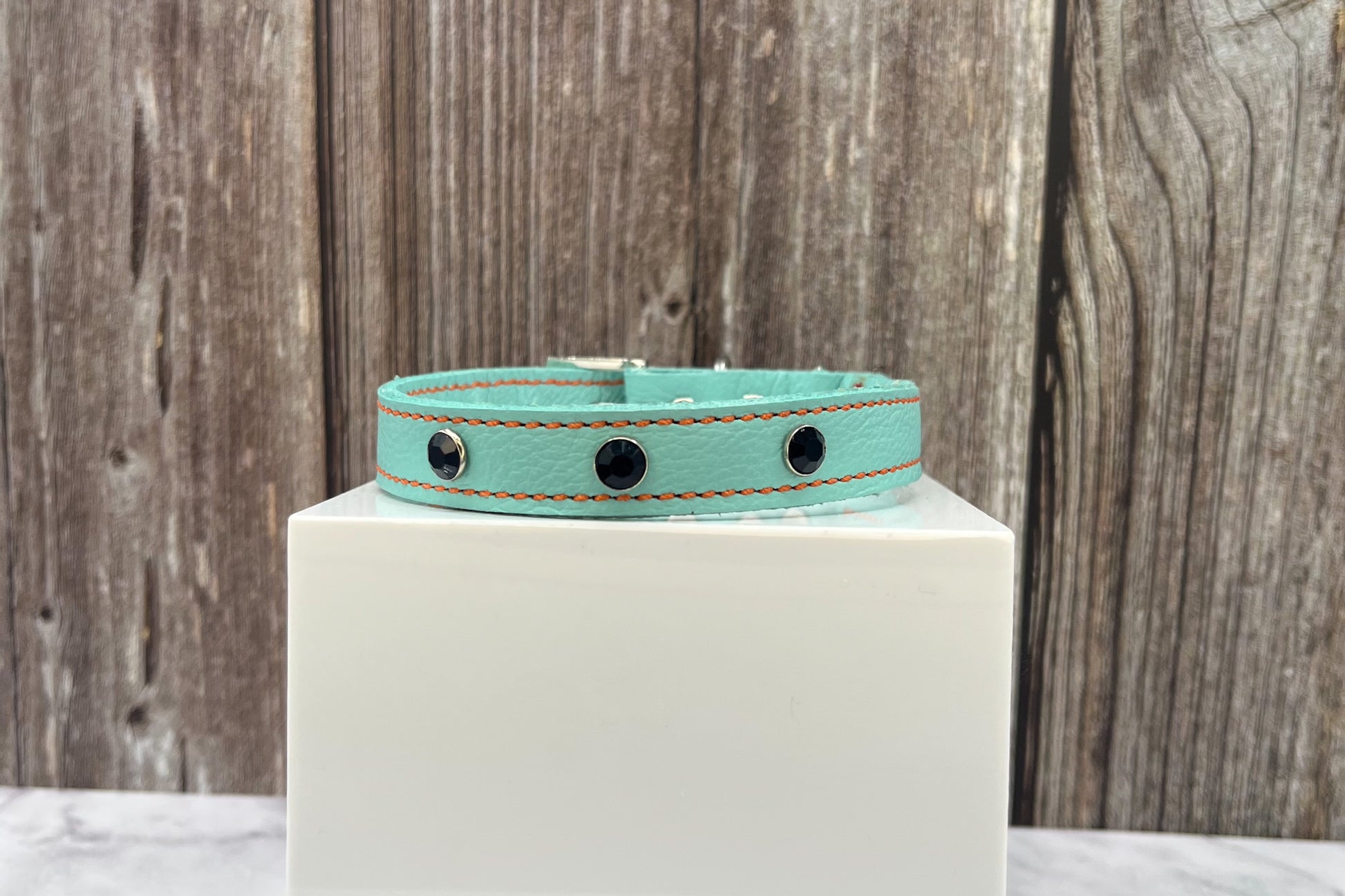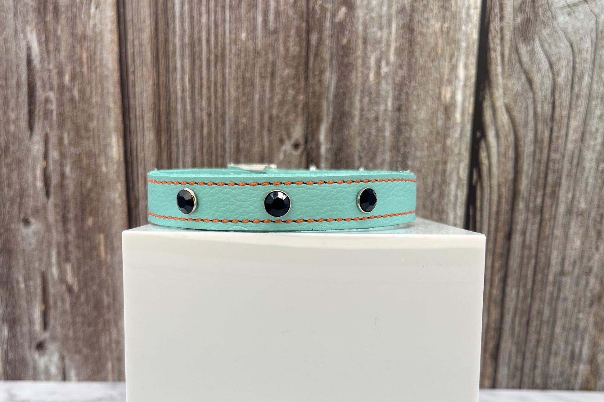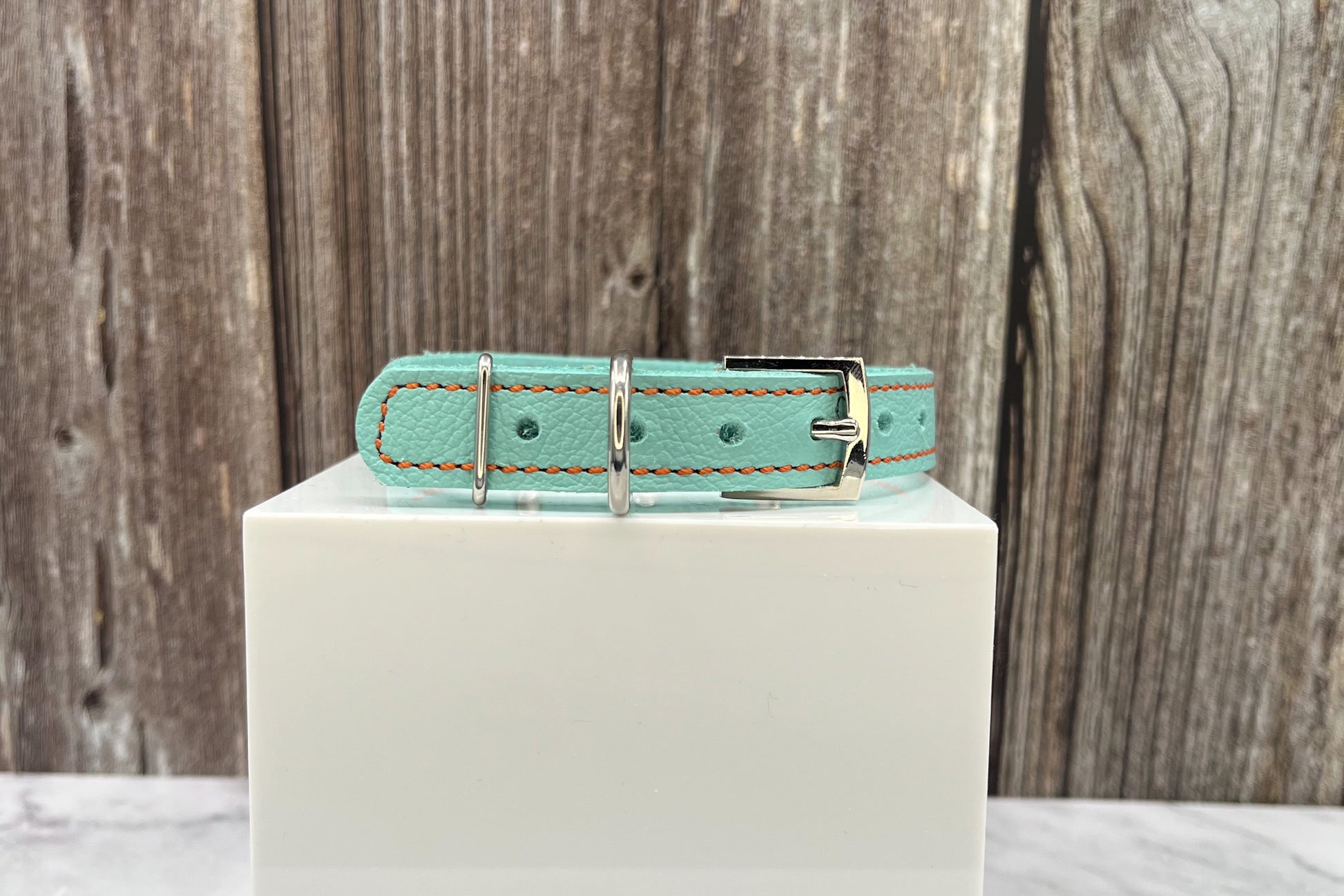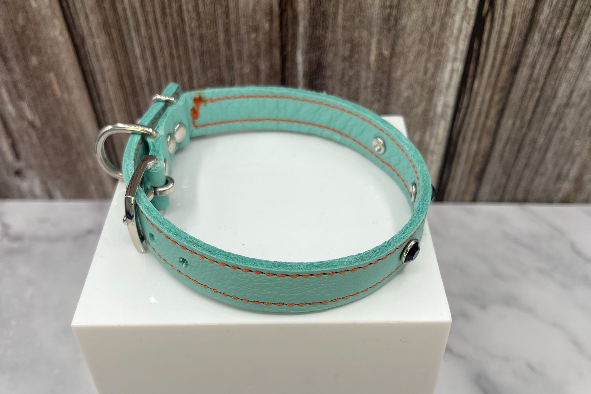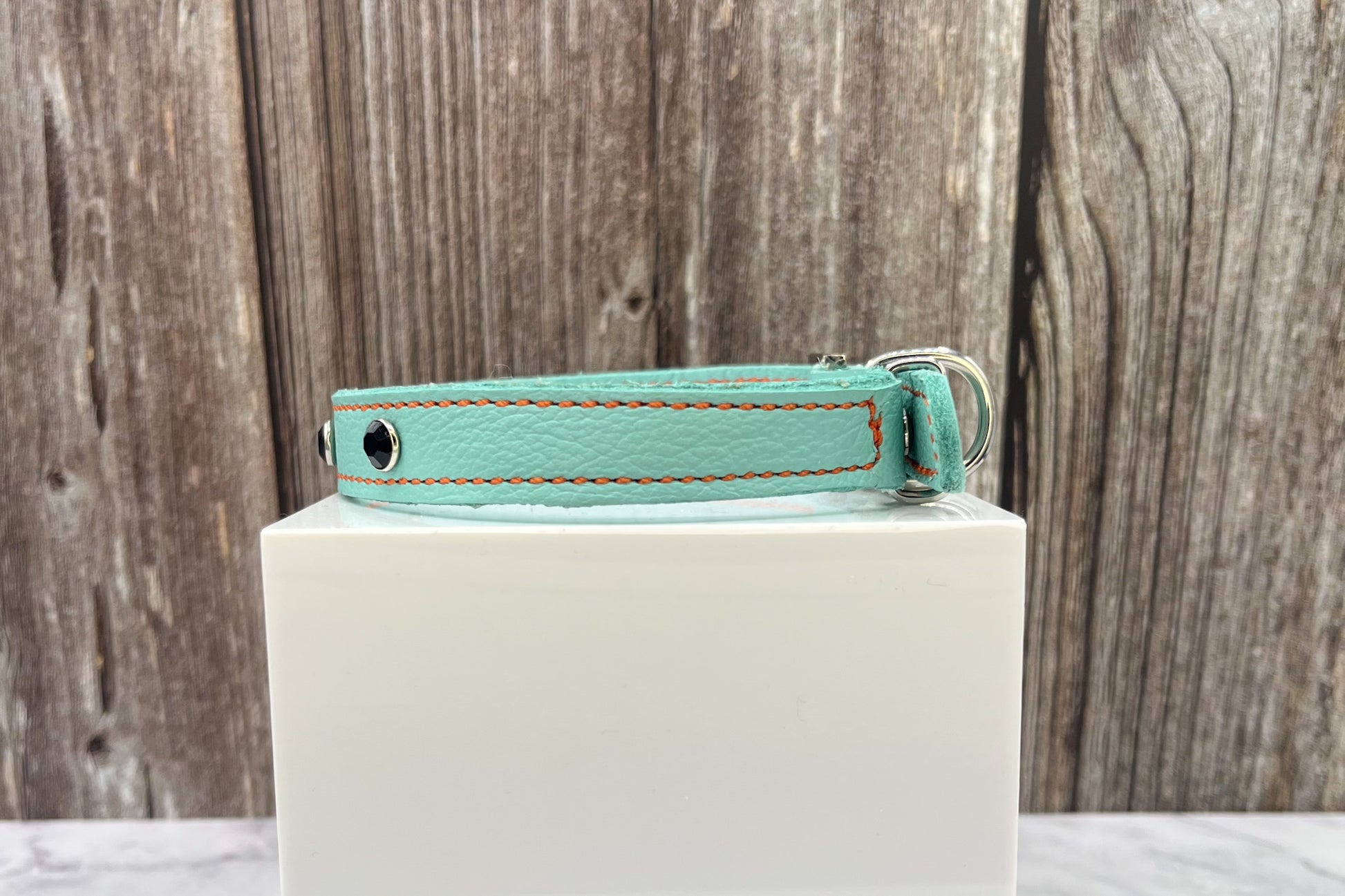 This collar is all handmade and stitched with Orange bonded nylon thread, the leather is biker leather so is really soft and super durable,