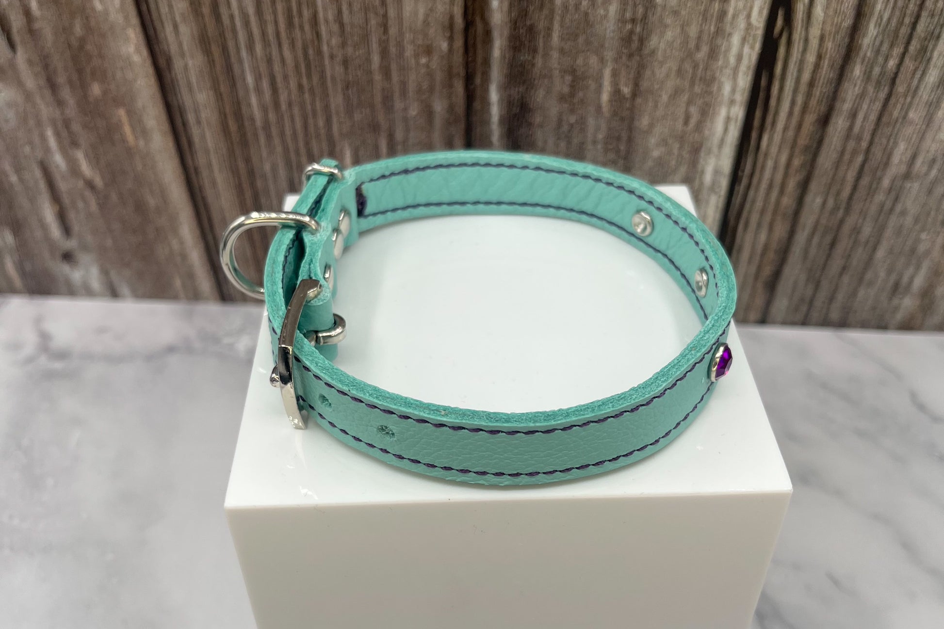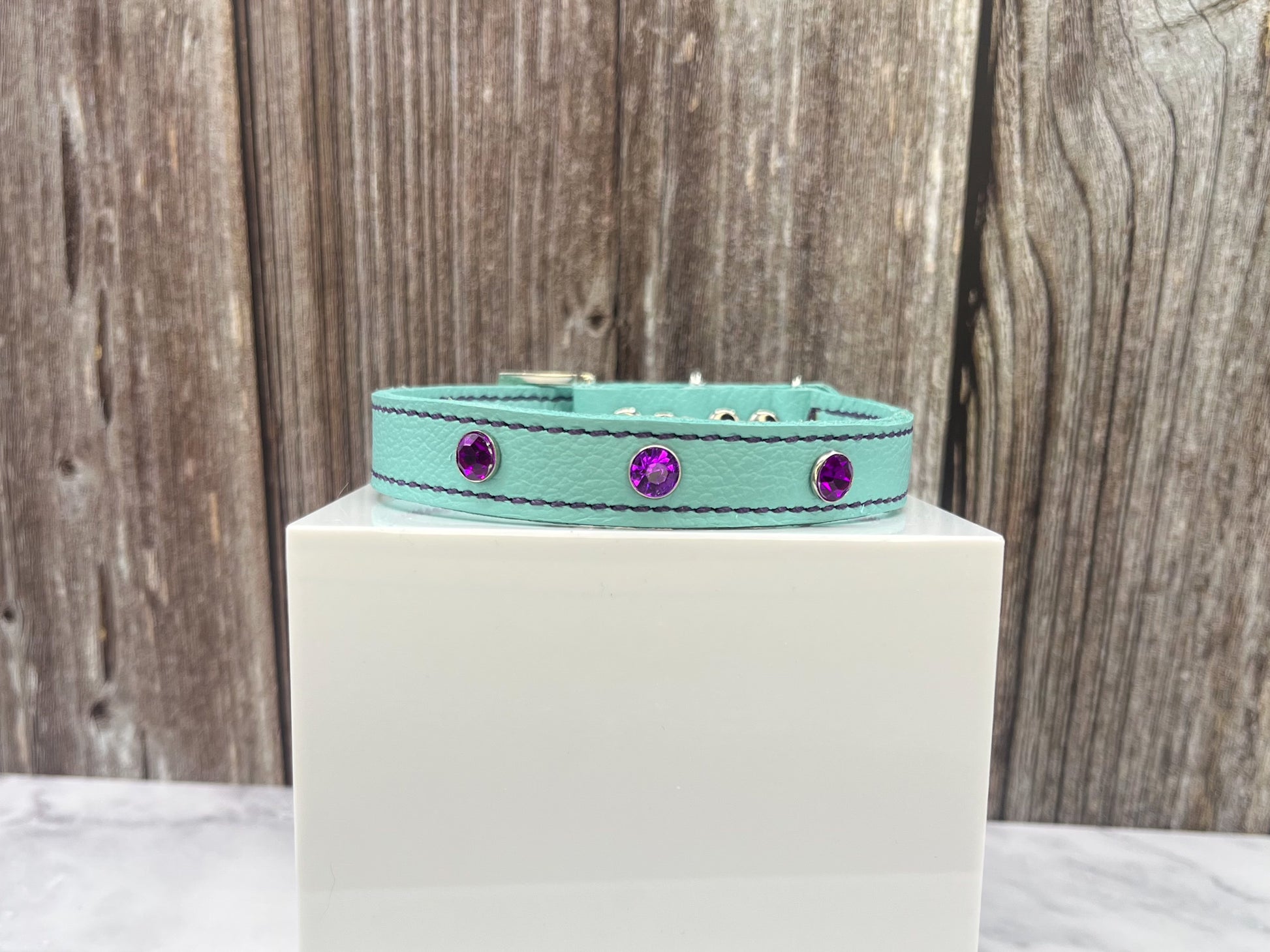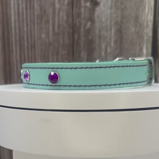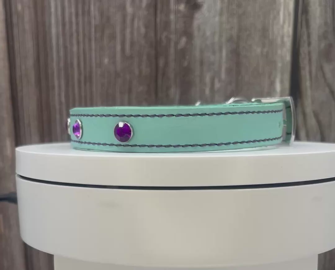 Aqua Green Leather Collar with Violet gem rivets,