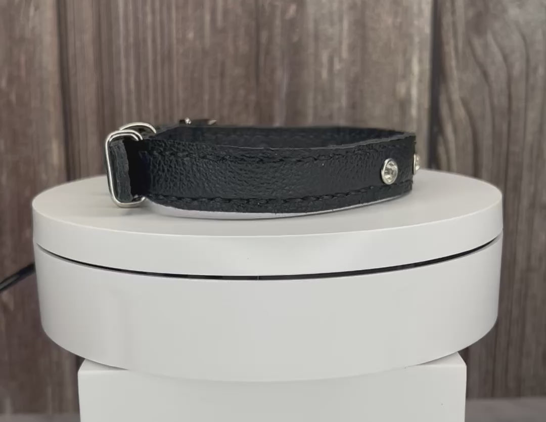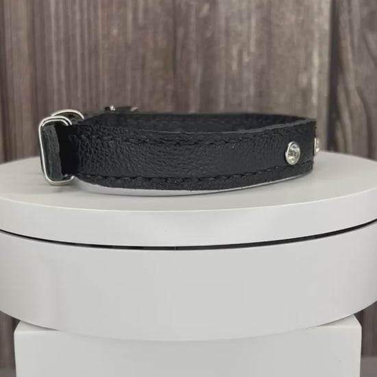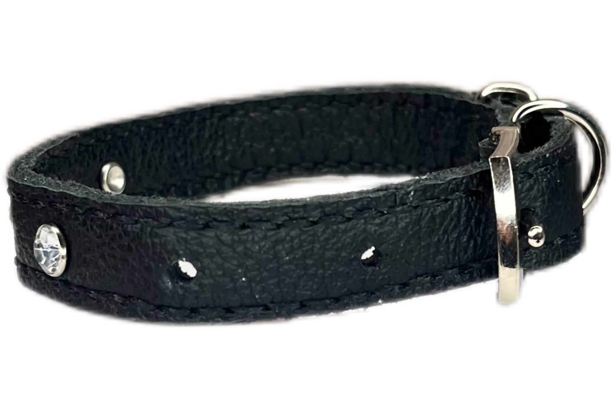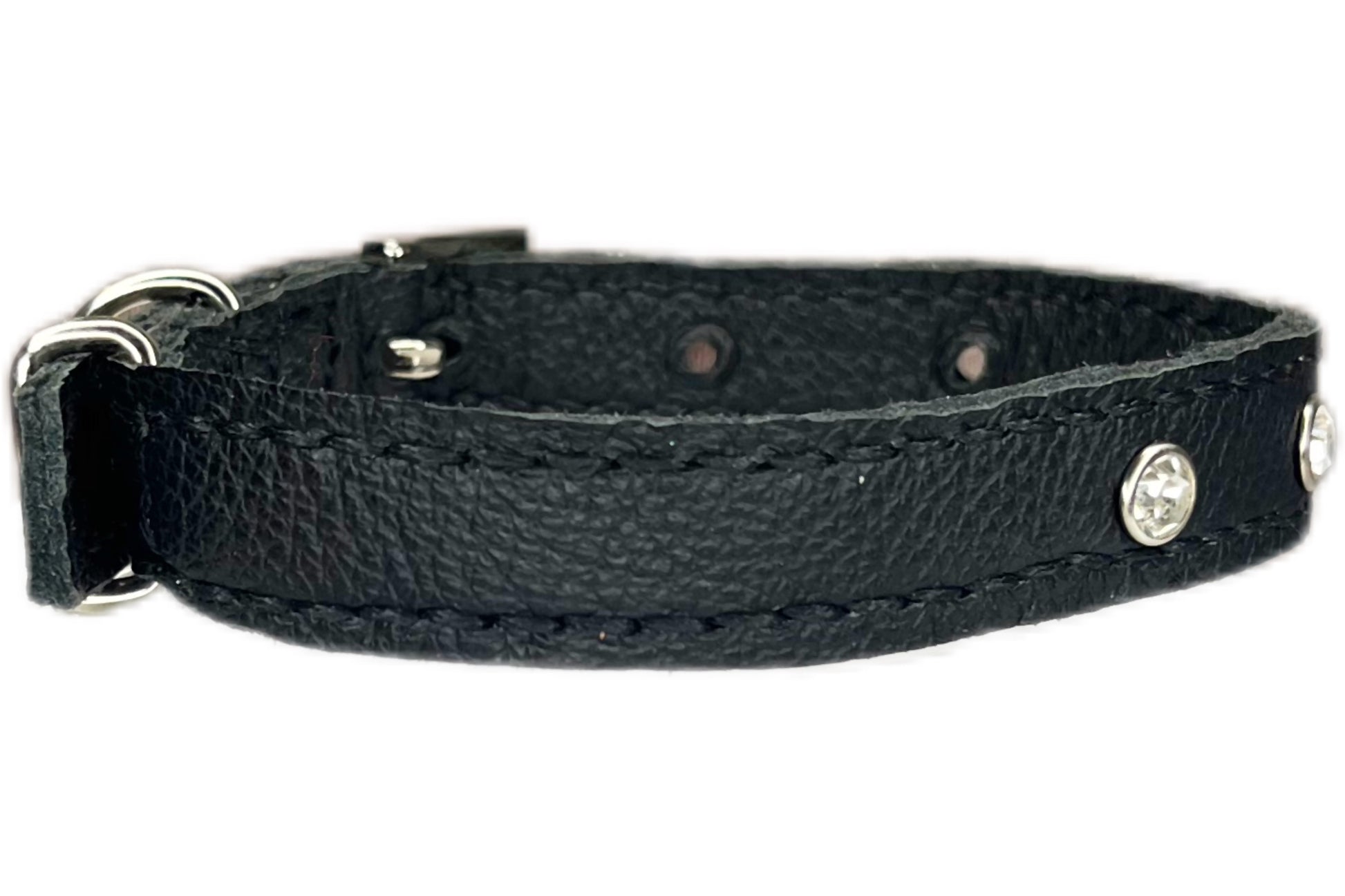 This Black leather collar is handmade and hand stitched in Black waxed thread, It has 3 Clear Diamante Rivets