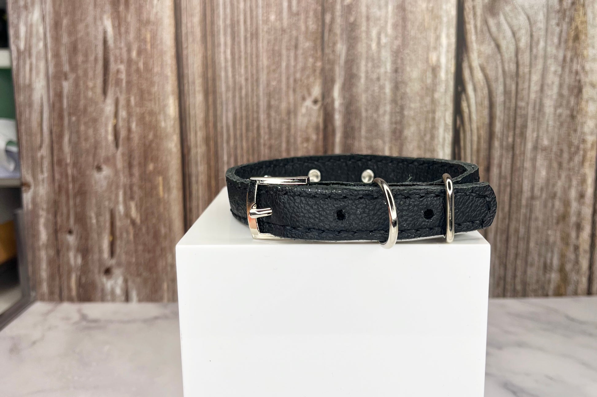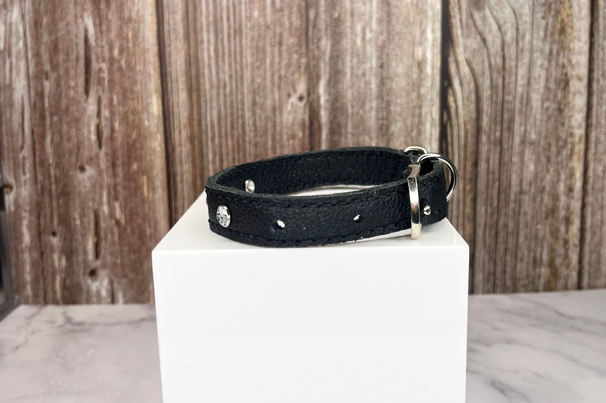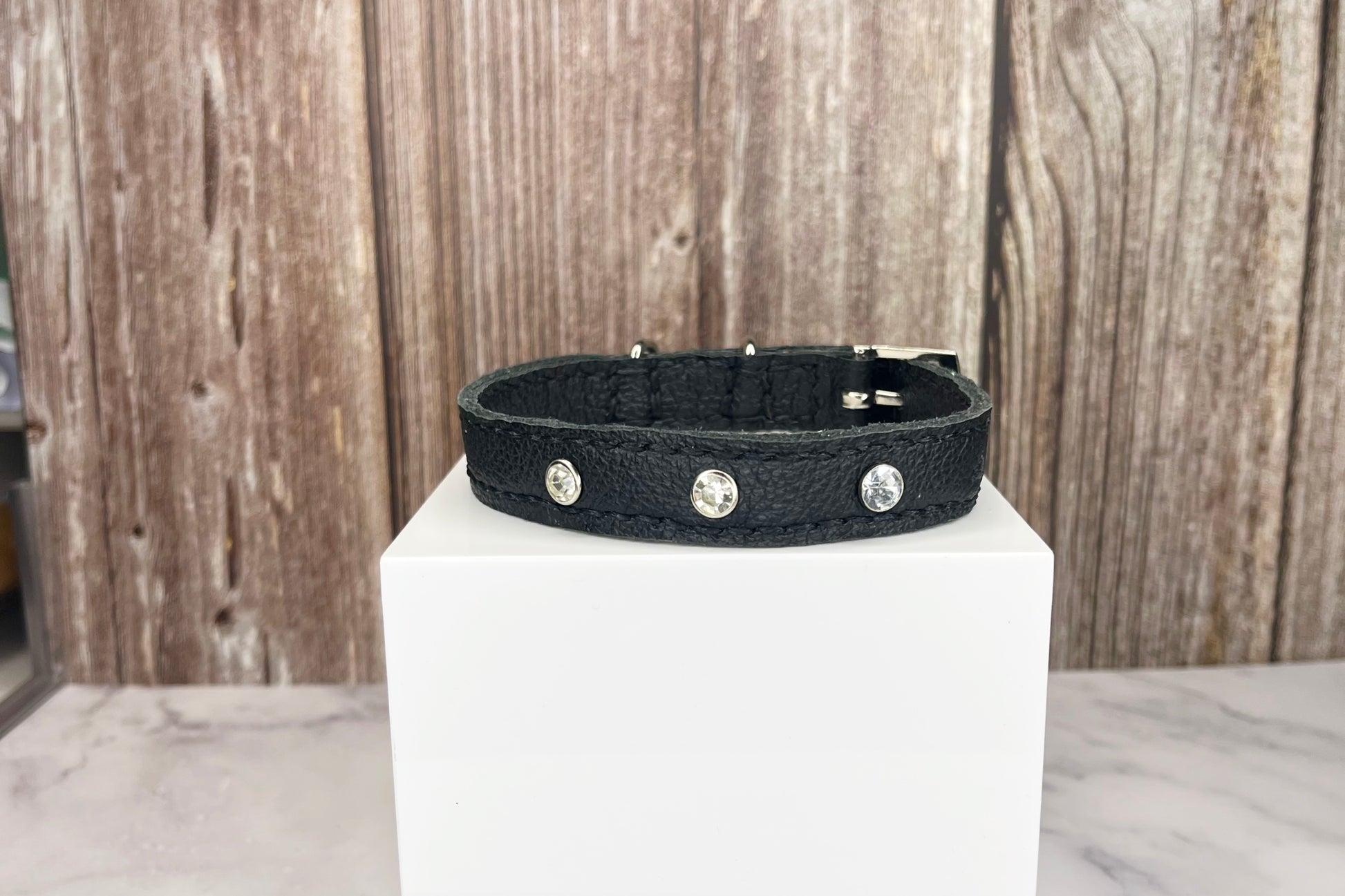 This Black leather collar is handmade and hand stitched in Black waxed thread, It has 3 Clear Diamante Rivets
