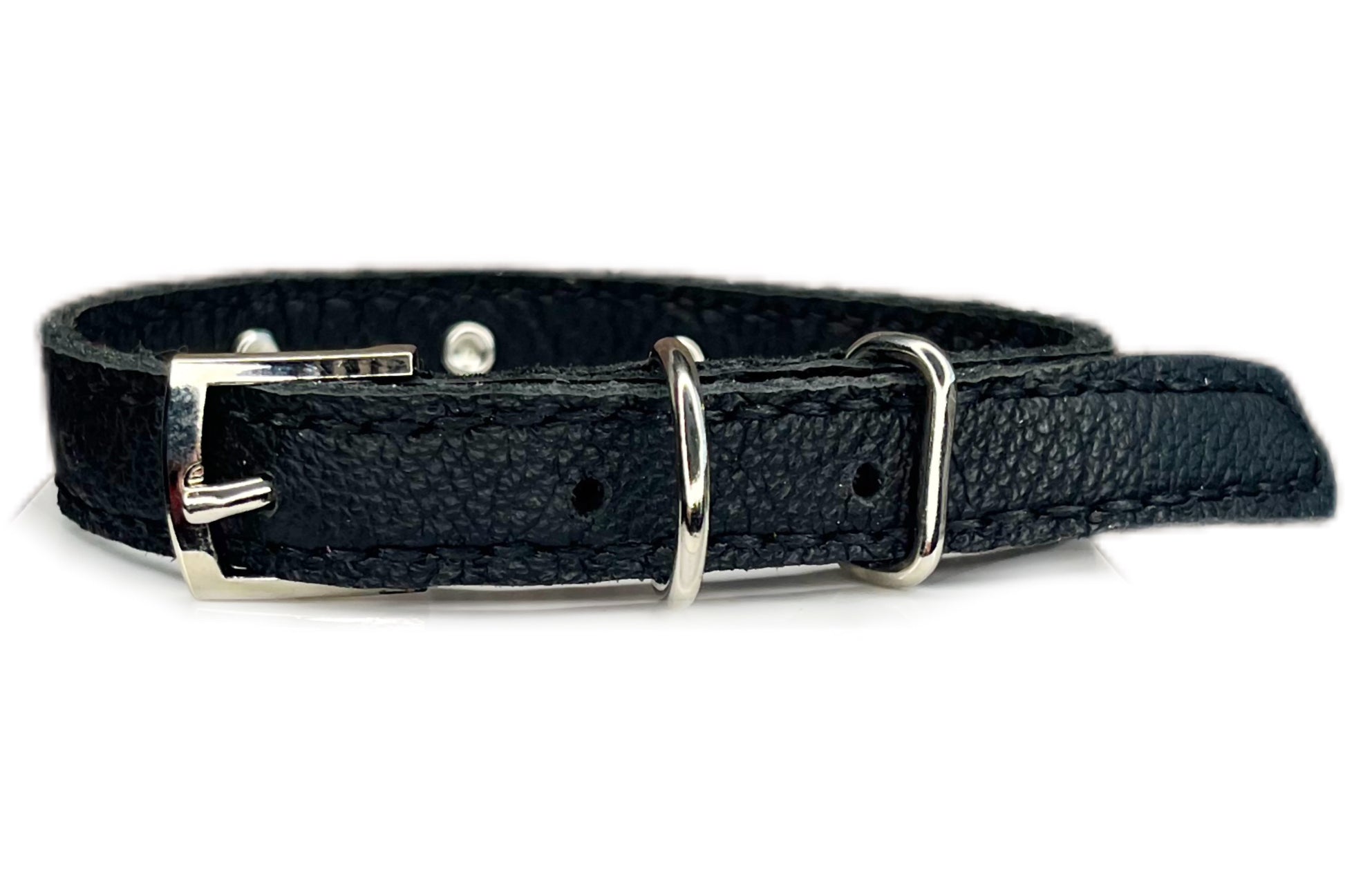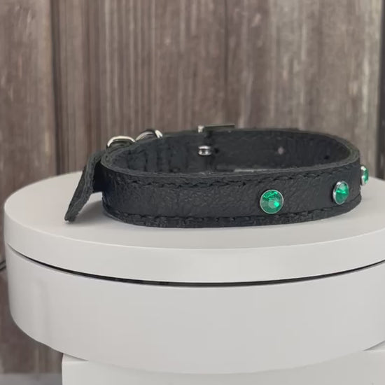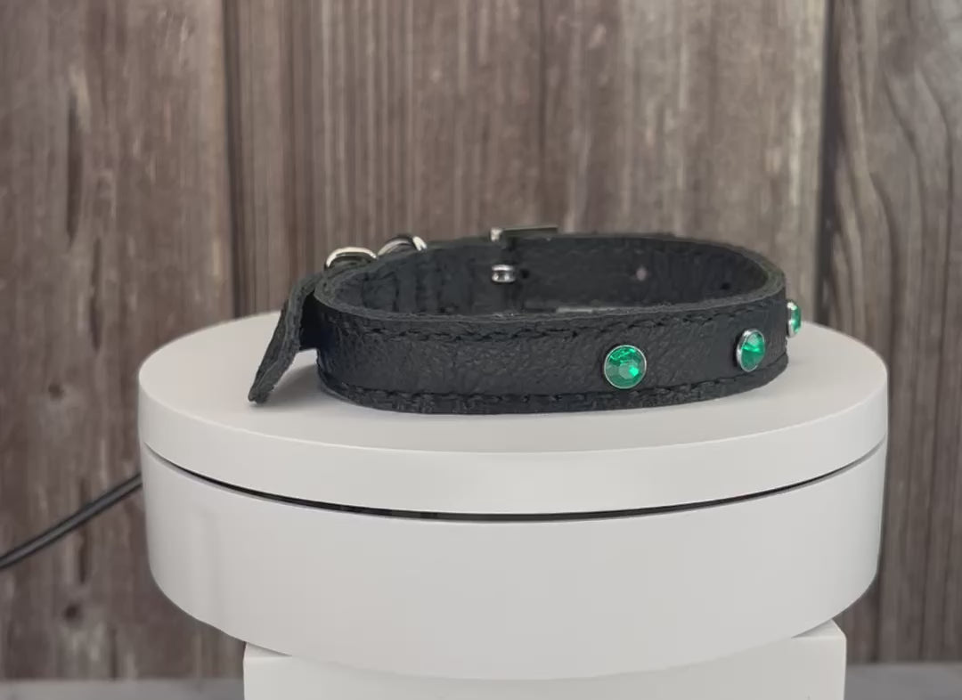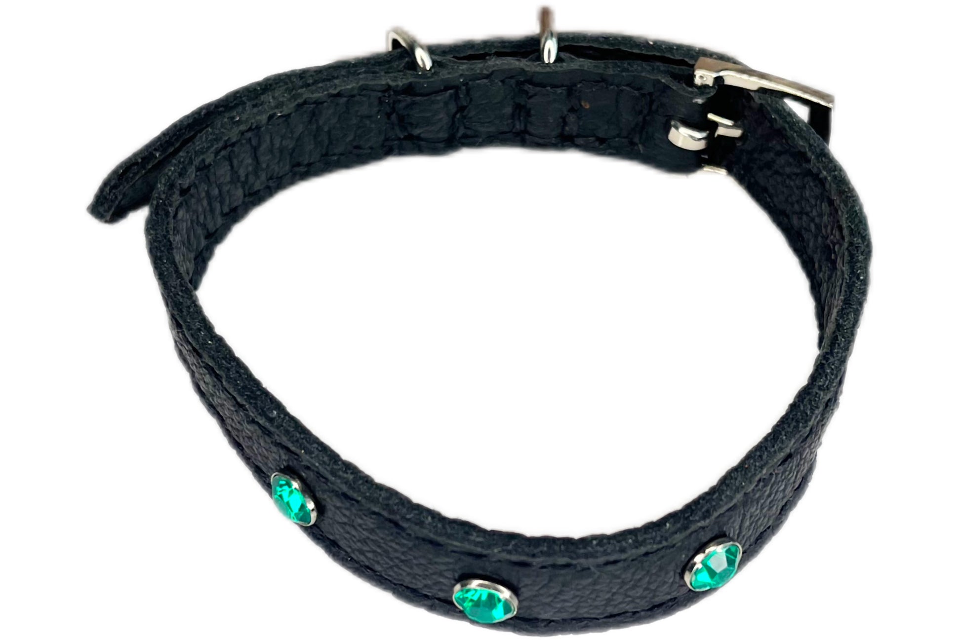 This Black leather collar is handmade and hand stitched in Black waxed thread, It has 3 Jade Green Diamante Rivets