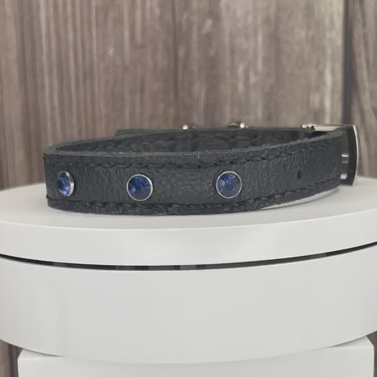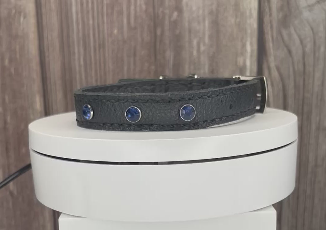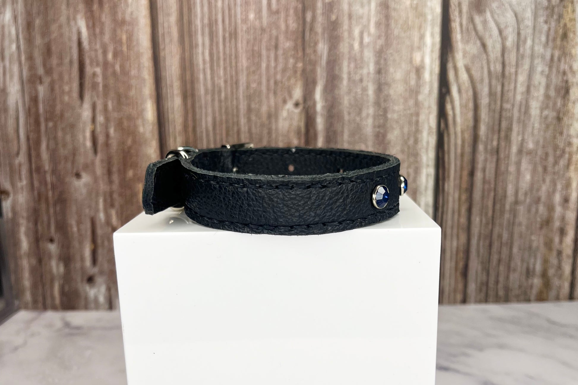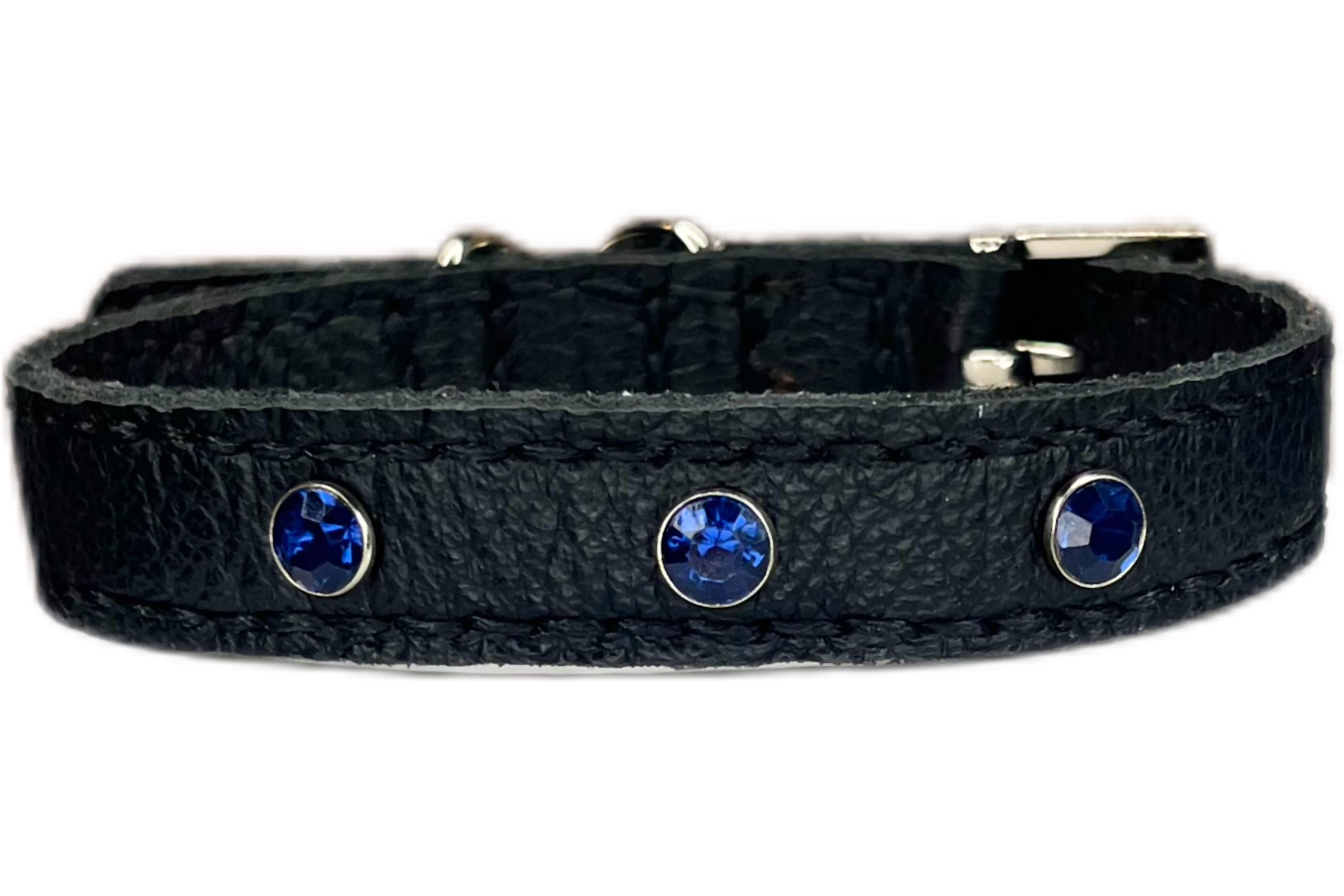 This Black leather collar is handmade and hand stitched in Black waxed thread, It has 3 Midnight Blue Diamante Rivets