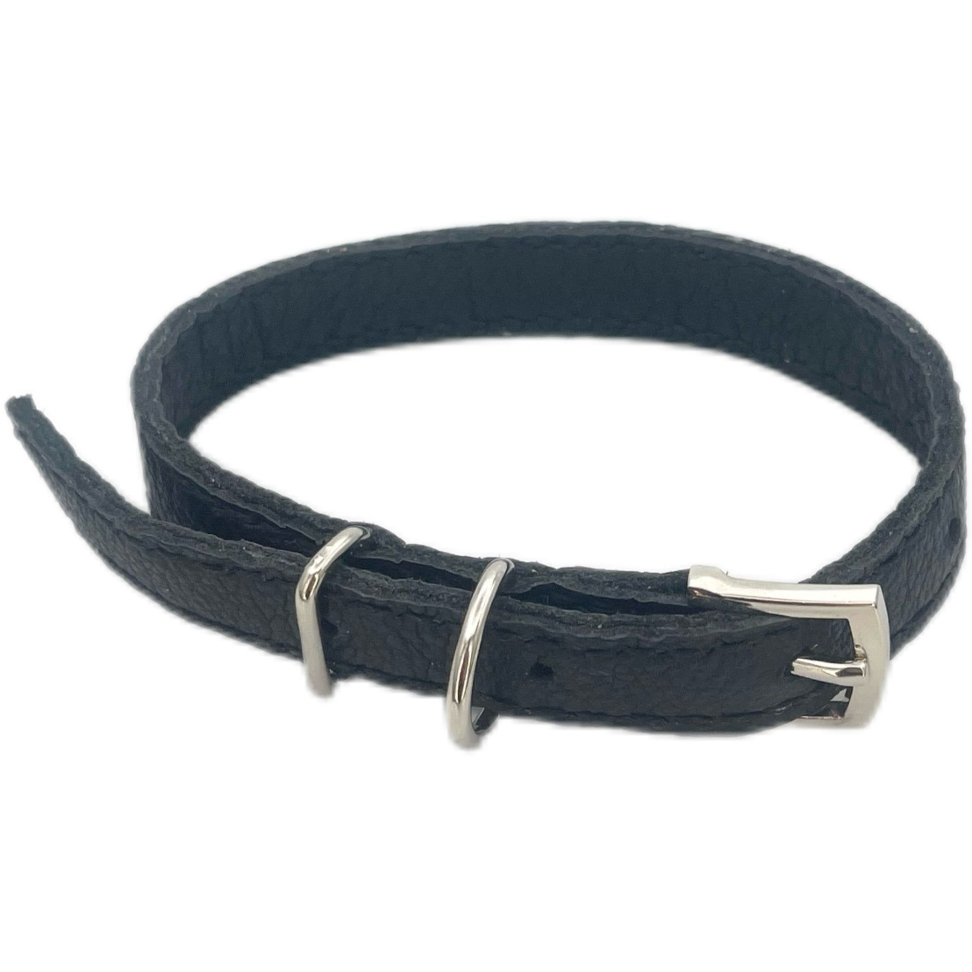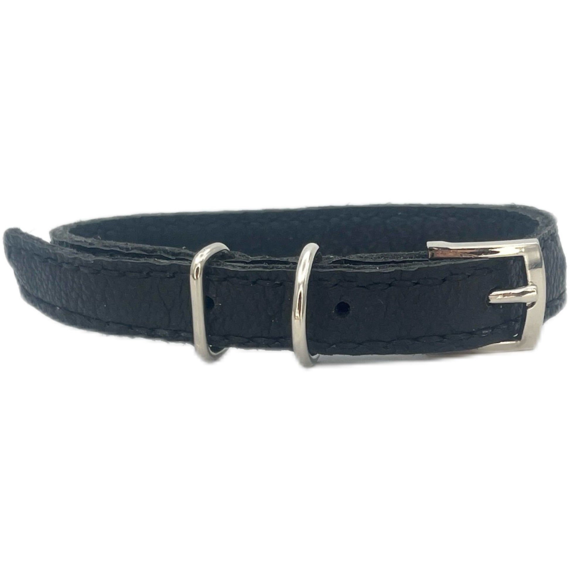 This collar is made using super Soft Leather and is all hand stitched, it is made to fit neck size 9-12 inches and is 16mm wide, and has a silver buckle, D ring and loop,
