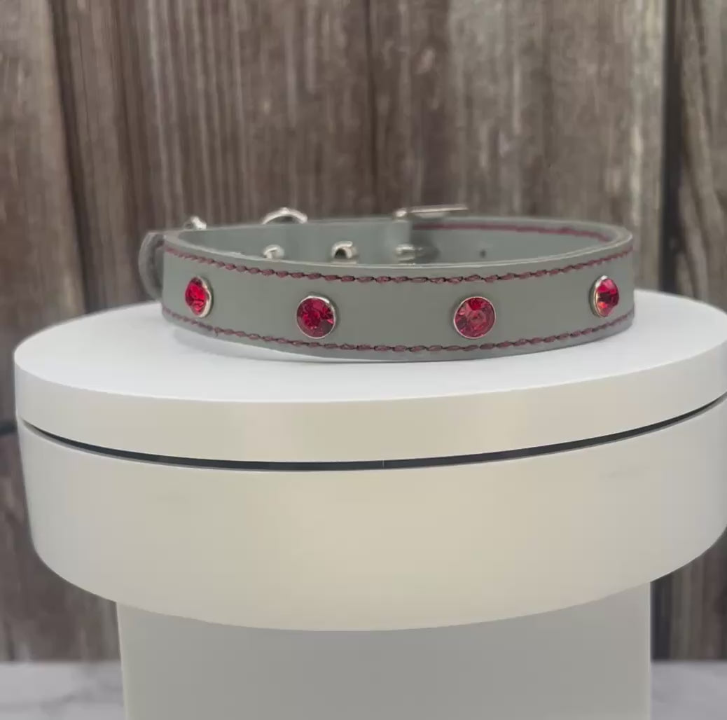 Grey Leather Collar wtih Red Gem Rivets
