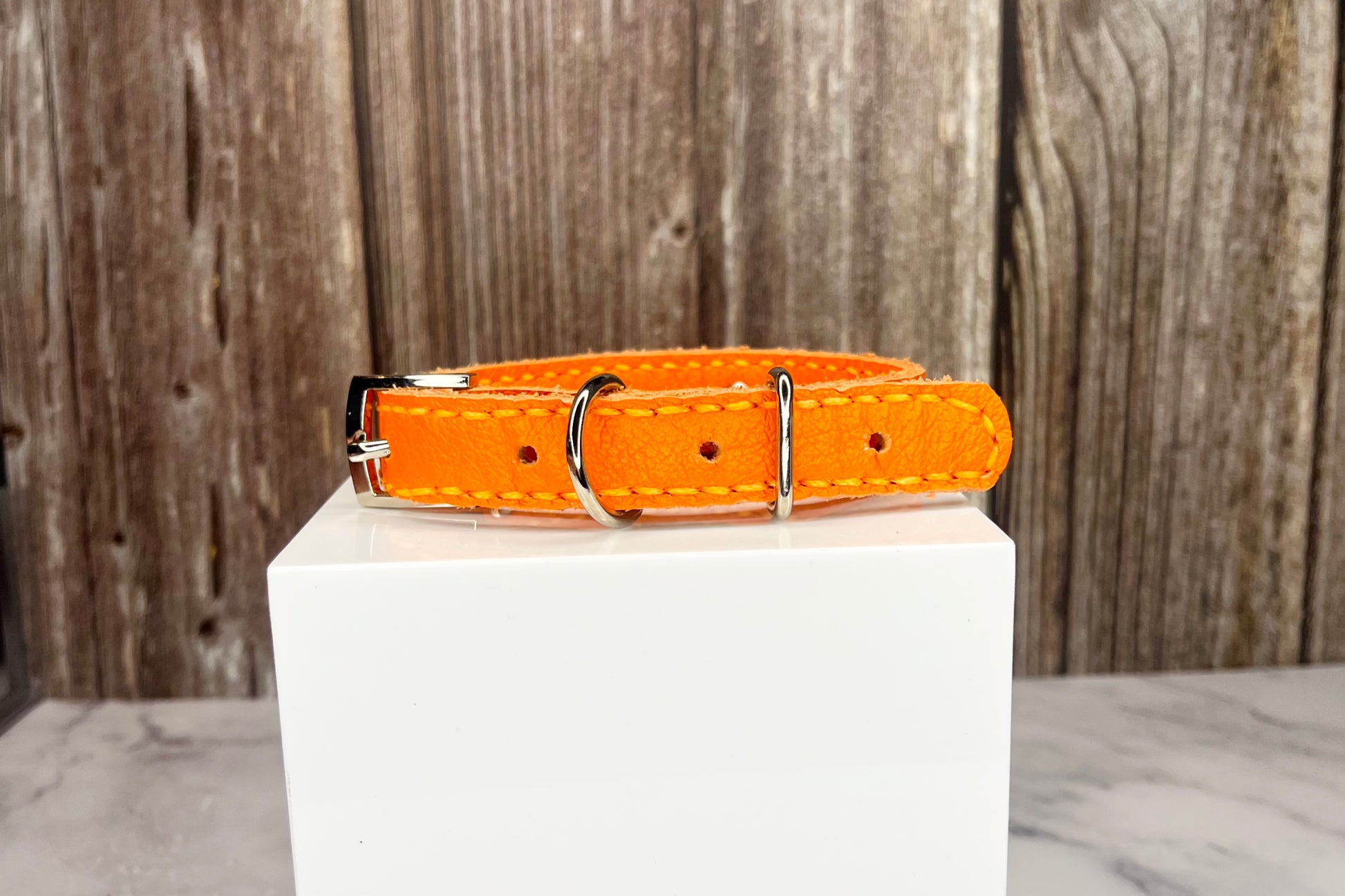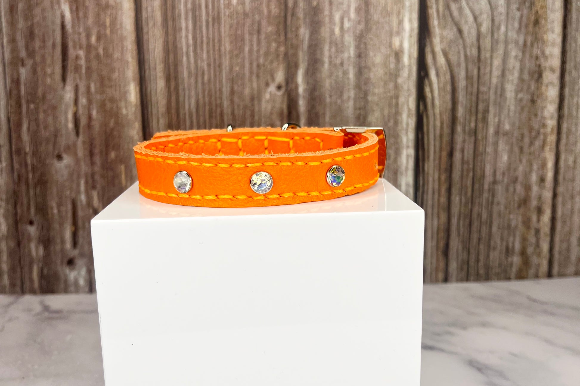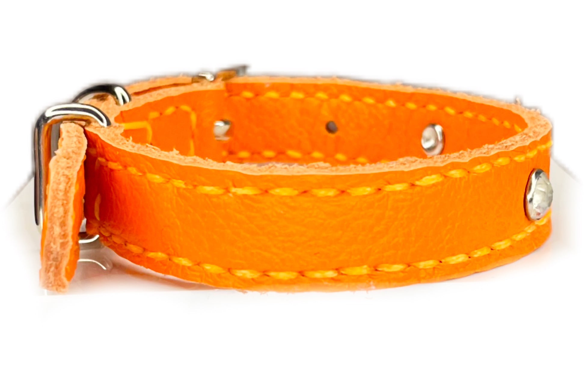 This Orange leather collar is handmade and hand stitched in Orange waxed thread, It has 3 Clear Diamante Rivets