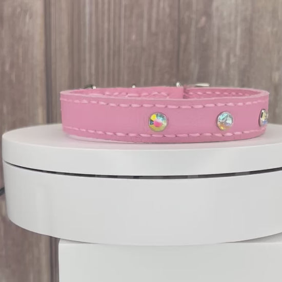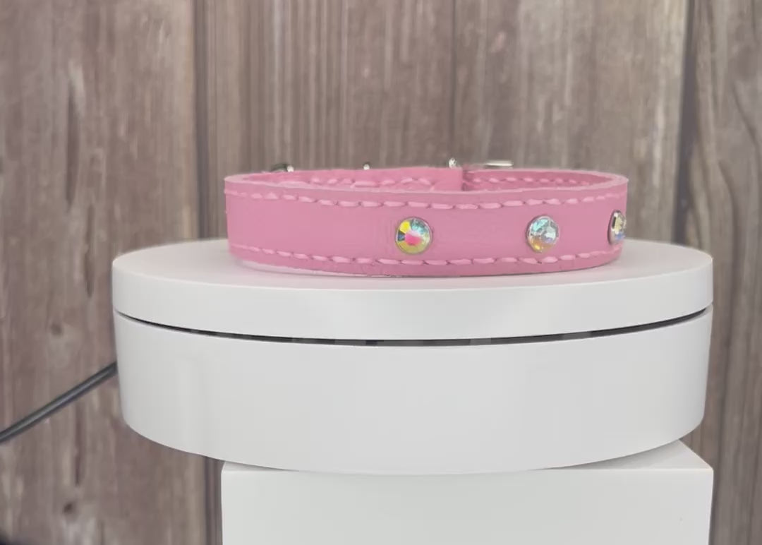 This Pink leather collar is handmade and hand stitched in Pink waxed thread, It has 3 AB Diamante Rivets