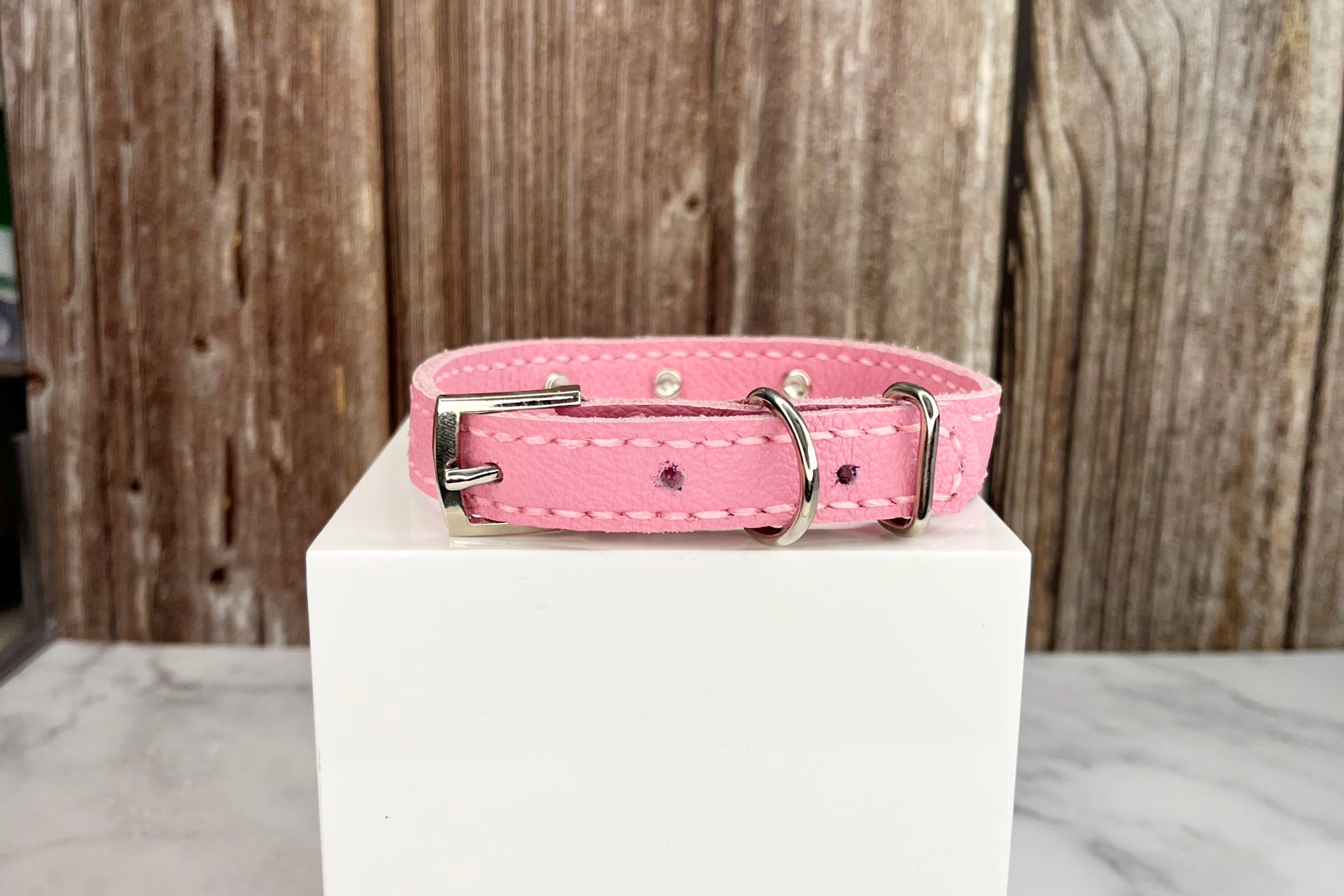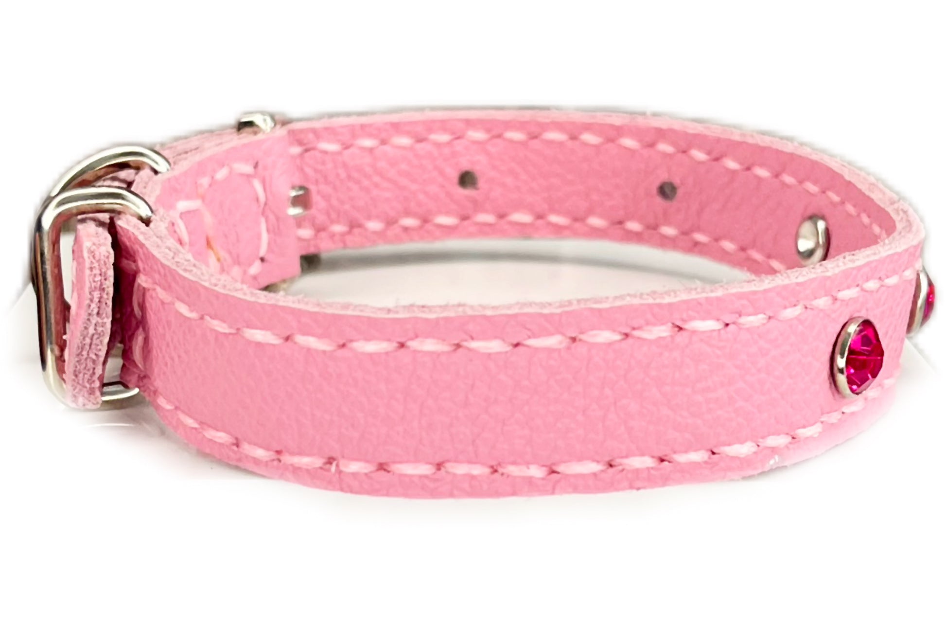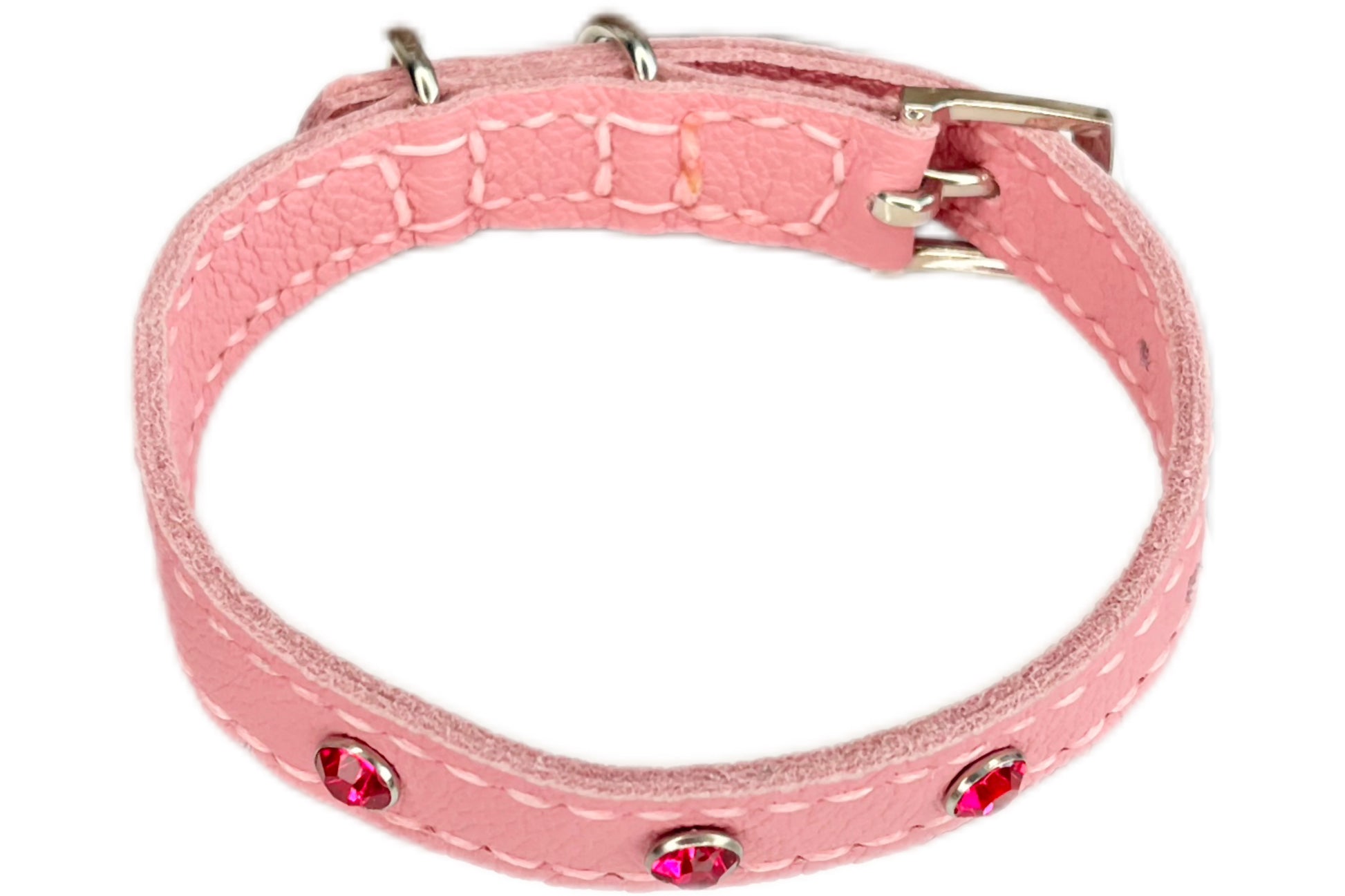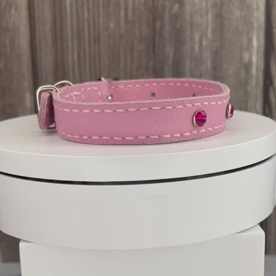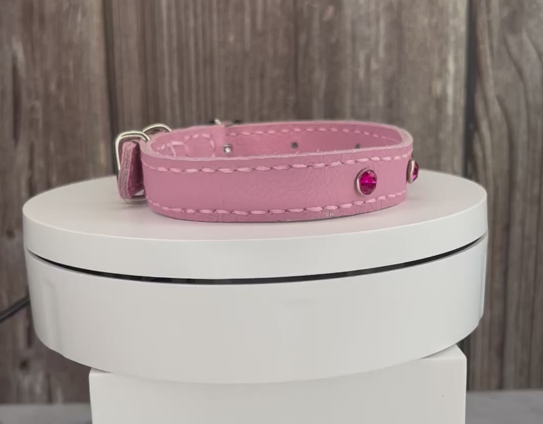 This Pink leather collar is handmade and hand stitched in Pink waxed thread, It has 3 Hot Pink Diamante Rivets