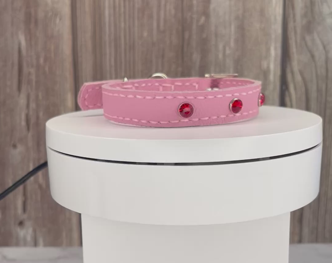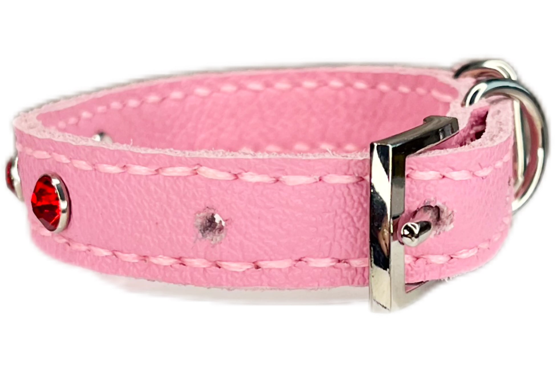 This Pink leather collar is handmade and hand stitched in Pink waxed thread, It has 3 Hot Red Diamante Rivets