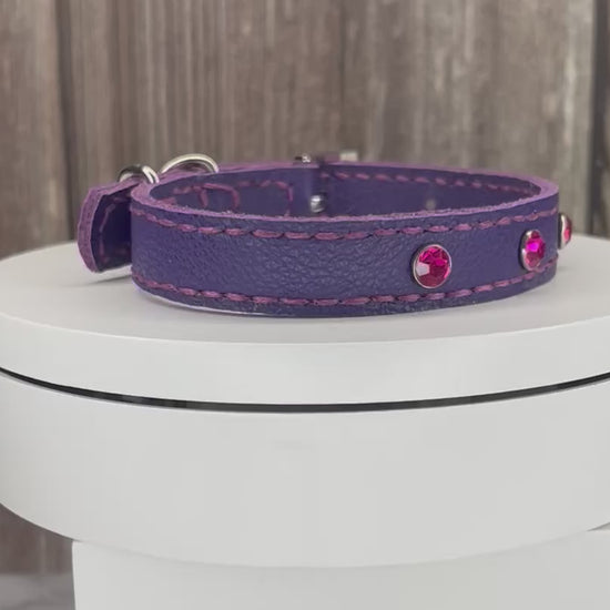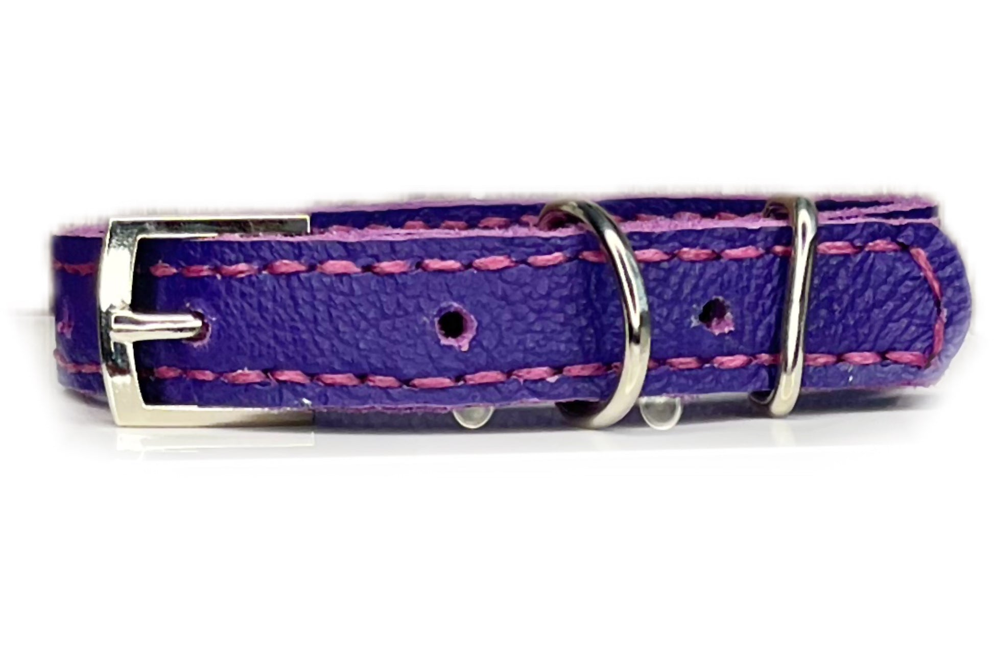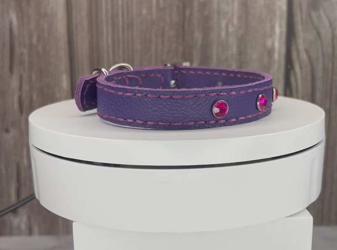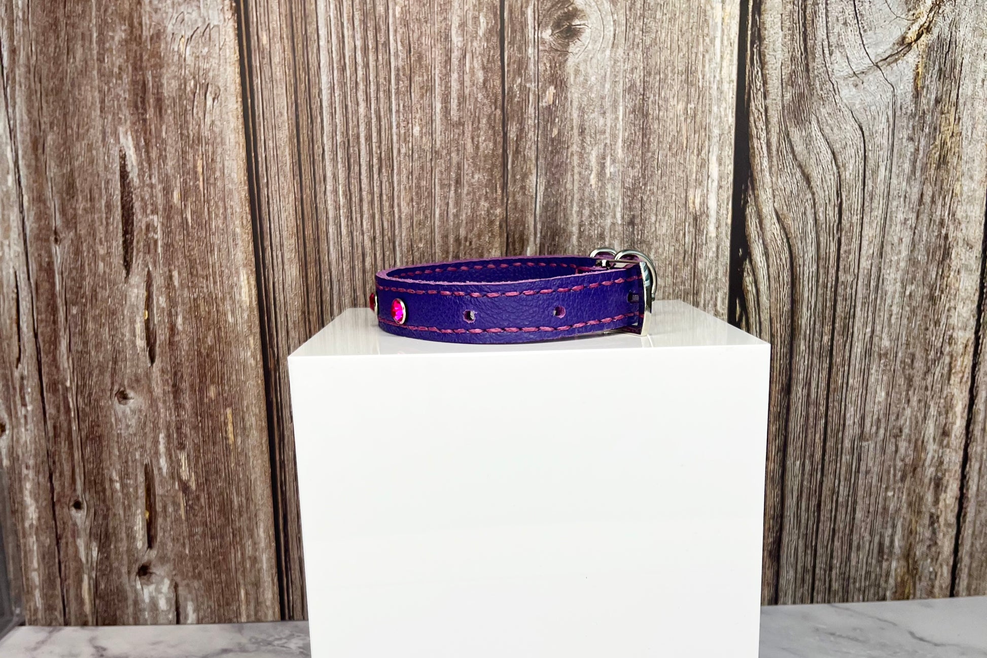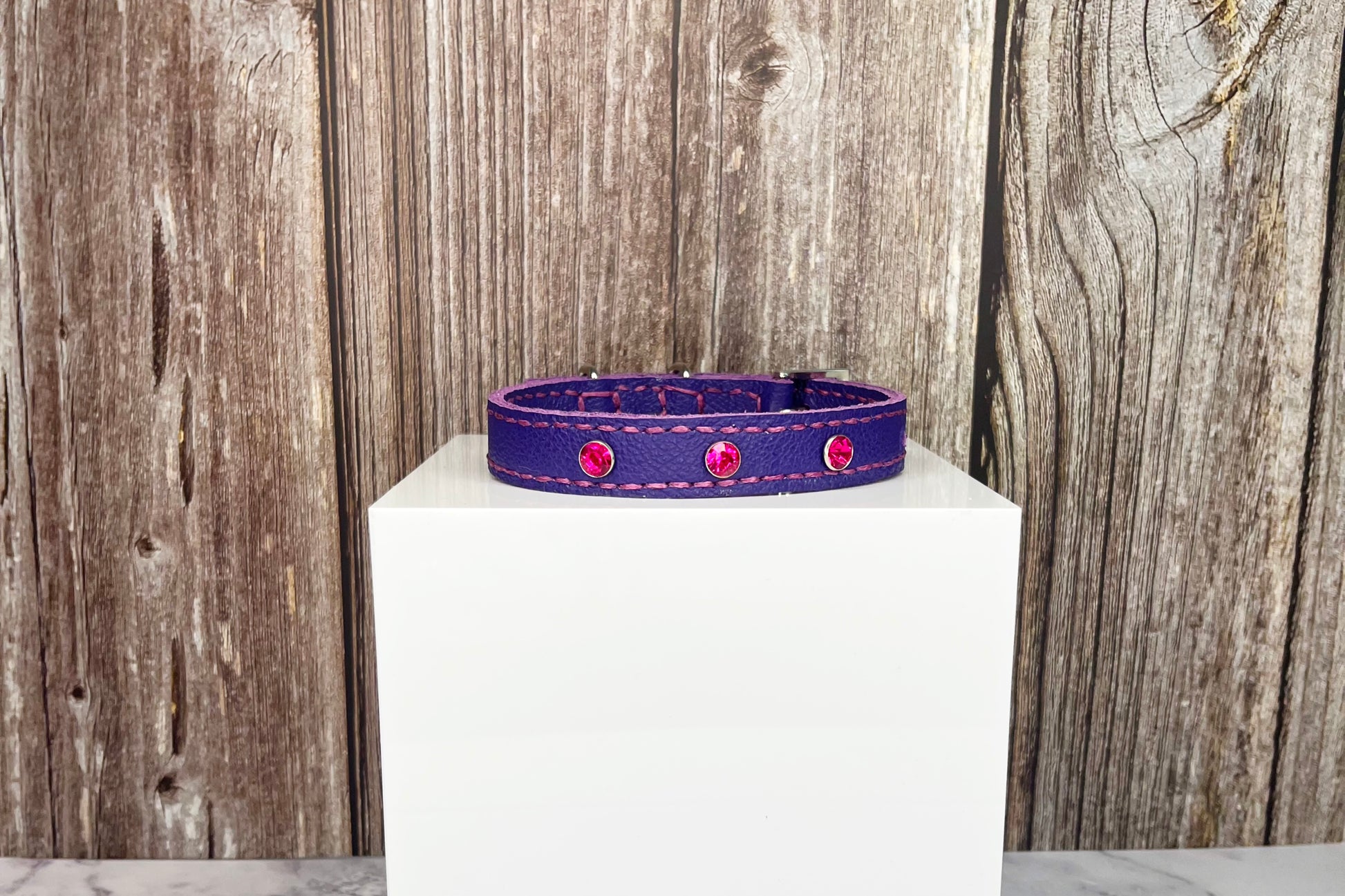 This Purple leather collar is handmade and hand stitched in Purple waxed thread, It has 3 Hot Pink Diamante Rivets