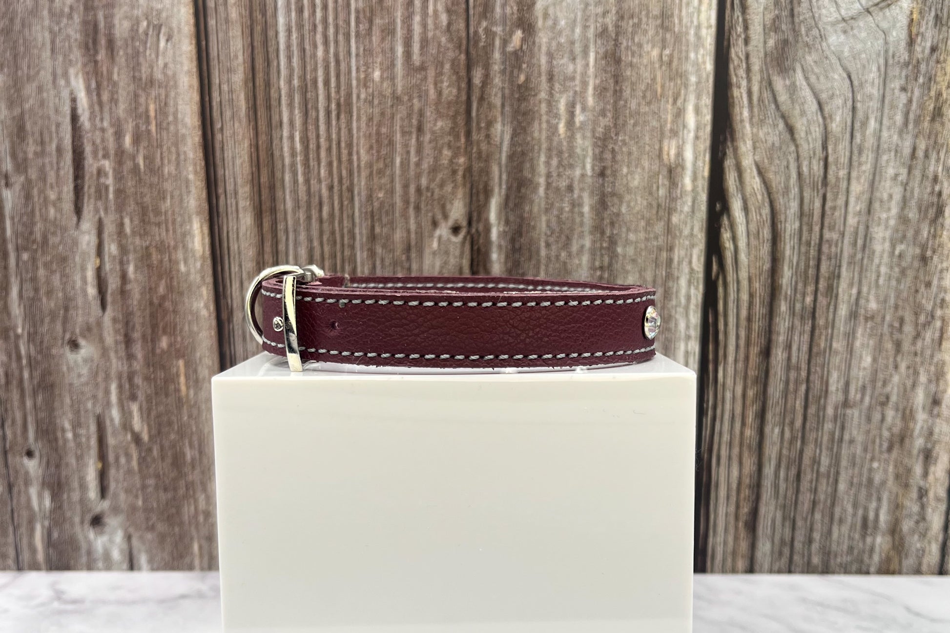 This collar is all handmade and stitched with grey bonded nylon thread, the leather is biker leather so is really soft and super durable,