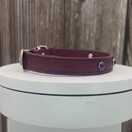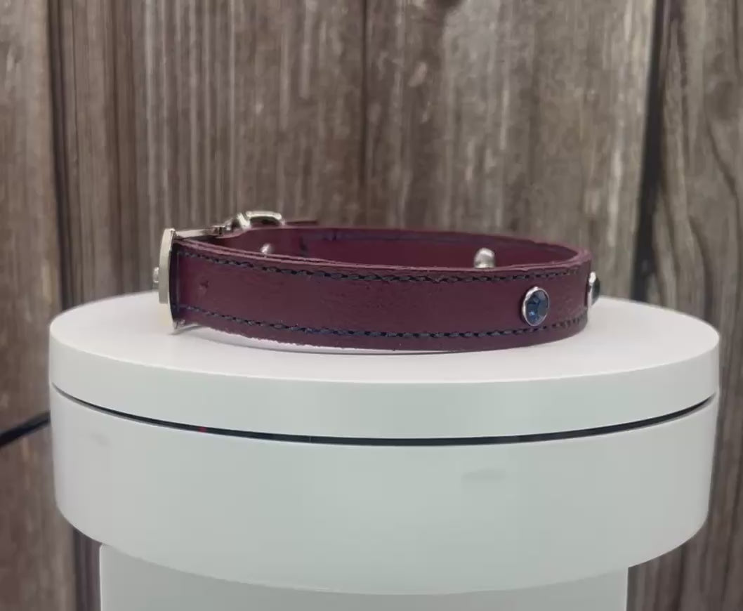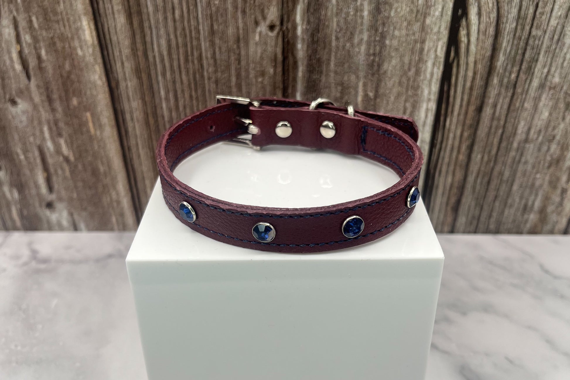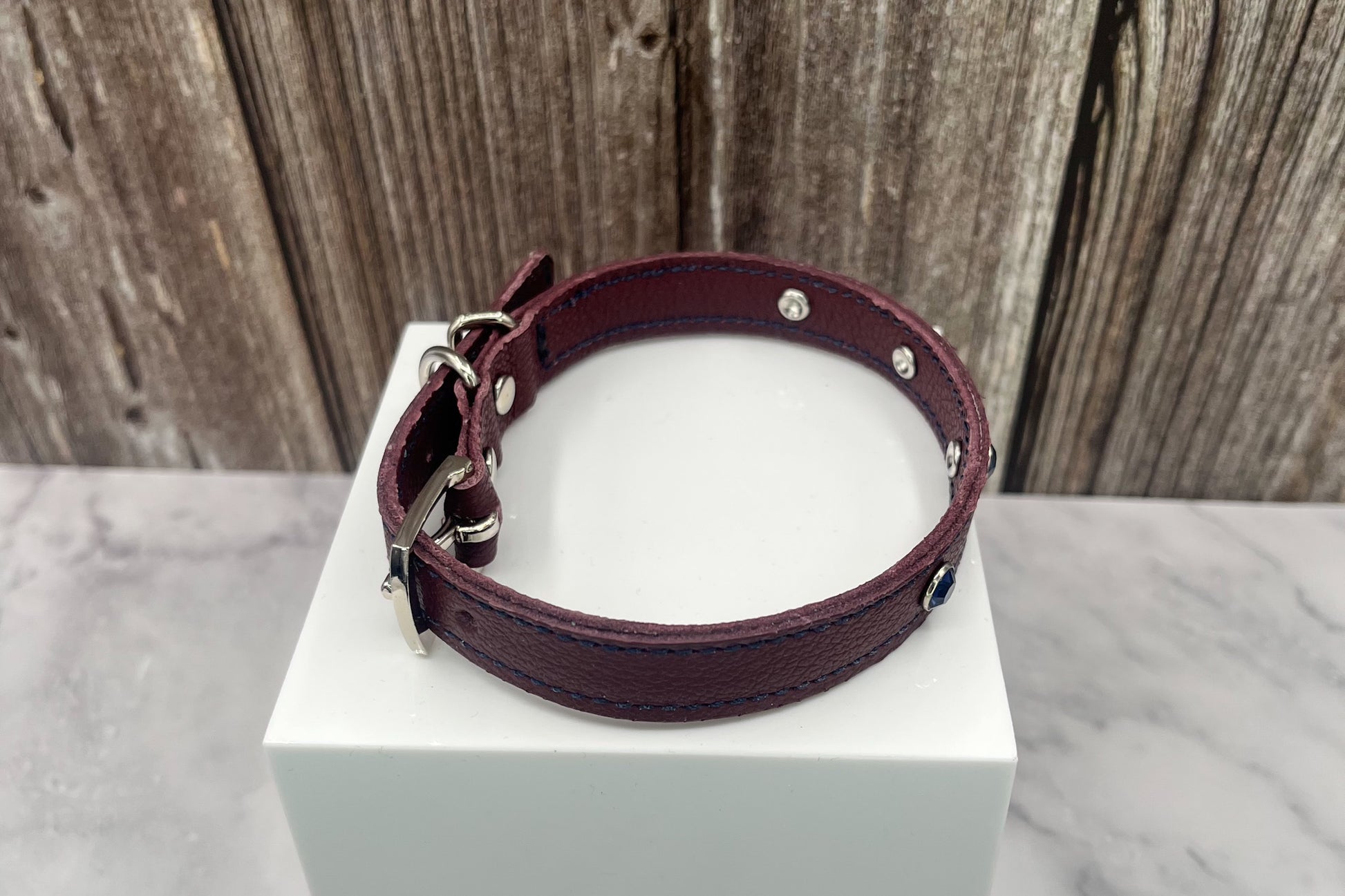 This collar is all handmade and stitched with Navy Blue bonded nylon thread, the leather is biker leather so is really soft and super durable,